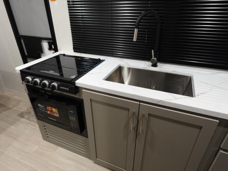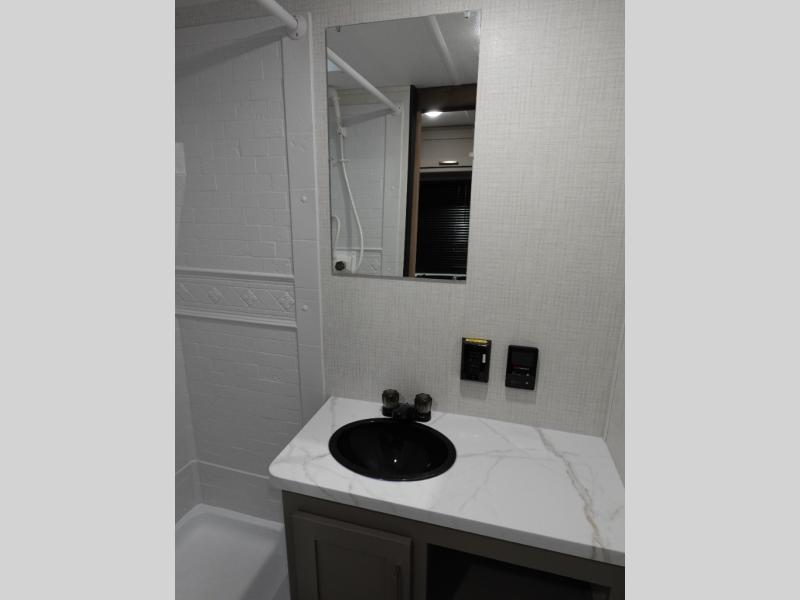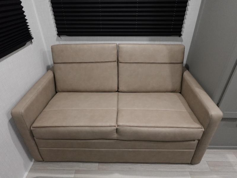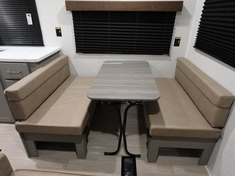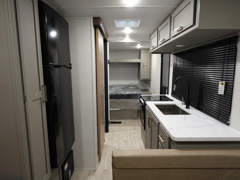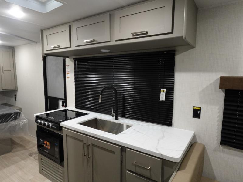 This is the perfect starter travel trailer since it includes everything you need while you're away from home. You'll enjoy the queen bed up front with underbed storage and nightstands for your things, plus a full bath on board so you won't have to use the camp's facilities. This model includes a cooktop that will allow you to cook meals each day, and there is a pantry and a 10 cu. ft. 12V refrigerator for food storage! A booth dinette in the back provides a place to dine and the sofa will be perfect to relax on after a day outdoors. And these pieces of furniture can double as your guests sleeping space at night!