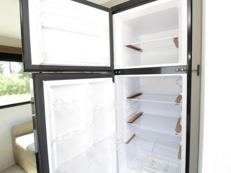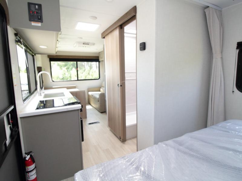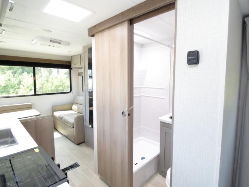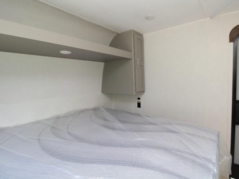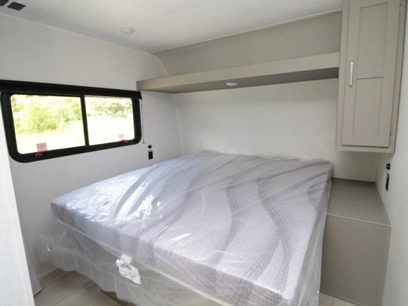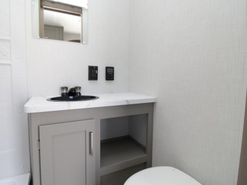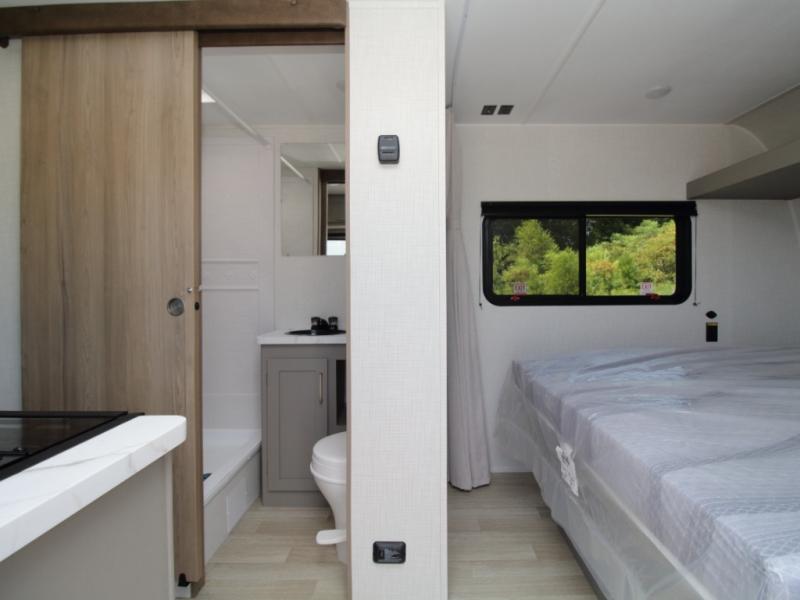 Up front, you’ll find a queen bed with dual nightstands and closets, plus hidden underbed storage for extra gear. The full bath means you’ll always have the convenience of your own private space rather than relying on campground facilities.