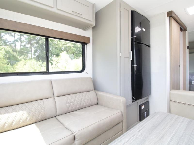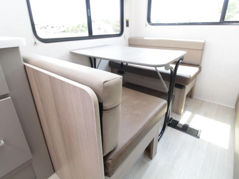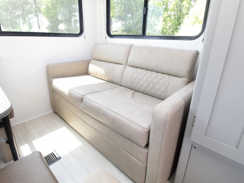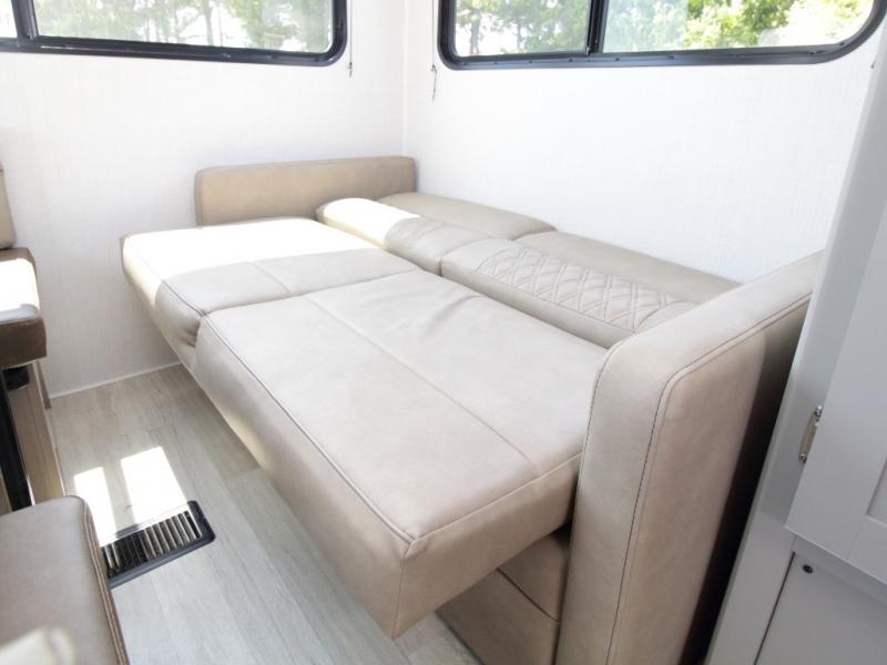 The kitchen makes it easy to prepare meals on the road with a cooktop, pantry, and 10 cu. ft. 12V refrigerator. After dinner, relax in the rear living area on the sofa or gather around the booth dinette, both of which convert into sleeping space for your guests.