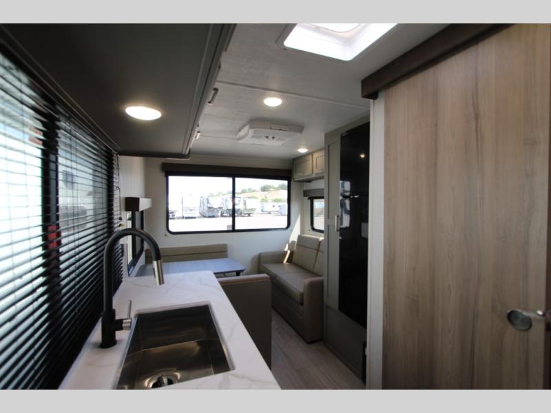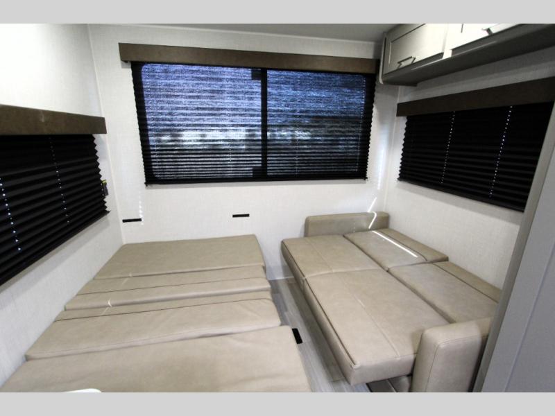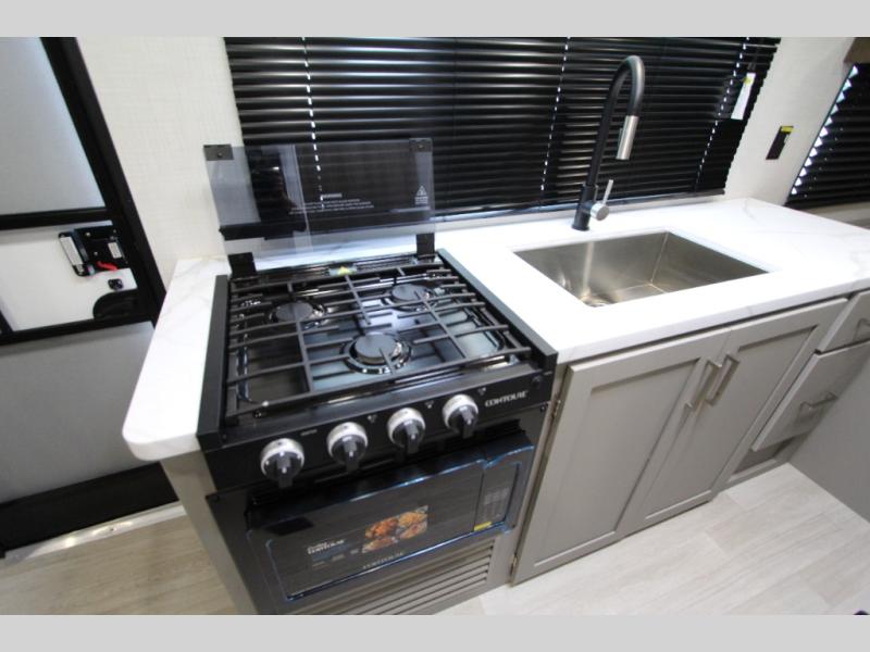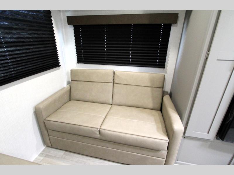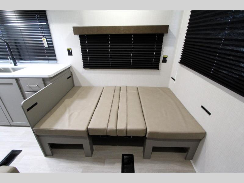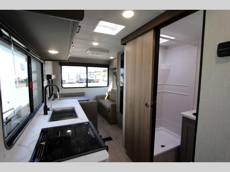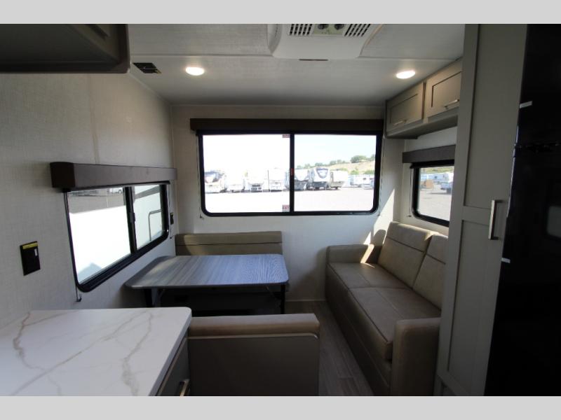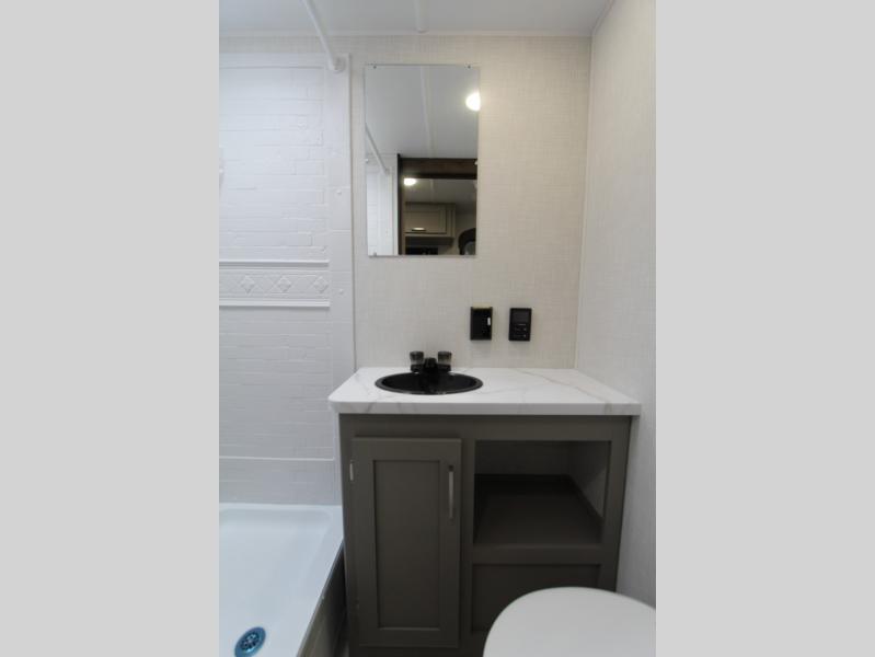 This is the perfect starter travel trailer since it includes everything you need while you're away from home. You'll enjoy the queen bed up front with underbed storage and nightstands for your things, plus a full bath on board so you won't have to use the camp's facilities. This model includes a cooktop that will allow you to cook meals each day, and there is a pantry and a 10 cu. ft. 12V refrigerator for food storage! A booth dinette in the back provides a place to dine and the sofa will be perfect to relax on after a day outdoors. And these pieces of furniture can double as your guests sleeping space at night!