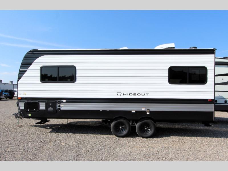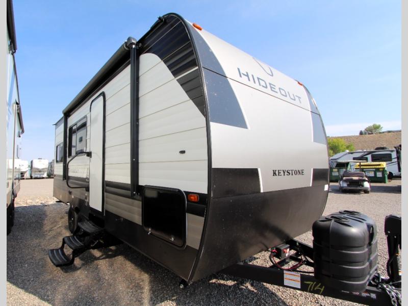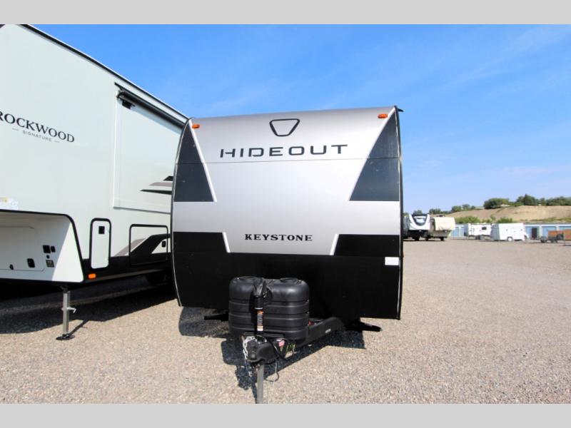 With any Hideout Sport travel trailer by Keystone you will enjoy simplified camping solutions that won't break the bank! Each model is constructed with a durable AlphaPly TPO roof membrane, tinted safety glass windows, and an I-beam frame. There are power tongue jacks and heavy duty stabilizer jacks that will make it easier than ever to hitch up and go. An XL entry assist handle will also provide convenience, along with a power awning that will provide much wanted shade during the day. You will feel right at home inside with stylish decor, blackout night shades, and cozy bed with storage underneath!