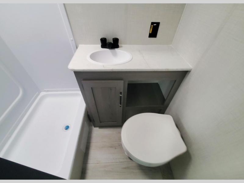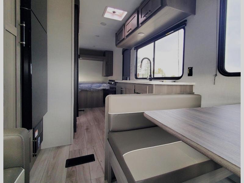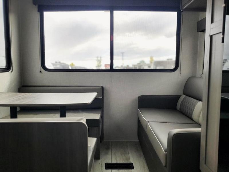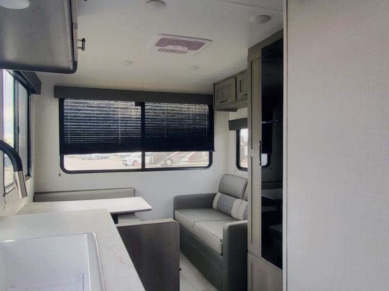 This is the perfect starter travel trailer since it includes everything you need while you're away from home. You'll enjoy the queen bed up front with underbed storage and nightstands for your things, plus a full bath on board so you won't have to use the camp's facilities. This model includes a cooktop that will allow you to cook meals each day, and there is a pantry and a 10 cu. ft. 12V refrigerator for food storage! A booth dinette in the back provides a place to dine and the sofa will be perfect to relax on after a day outdoors. And these pieces of furniture can double as your guests sleeping space at night!