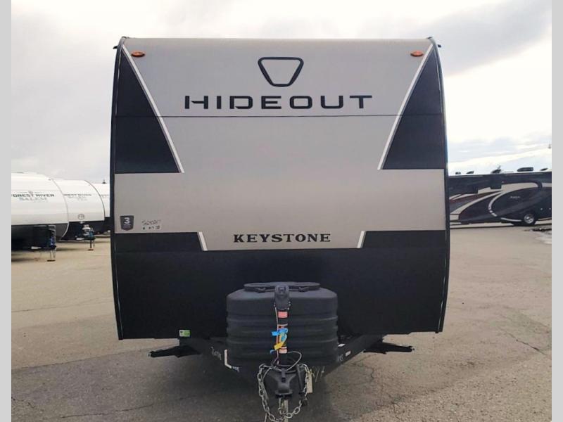With any Hideout Sport travel trailer by Keystone you will enjoy simplified camping solutions that won't break the bank! Each model is constructed with a durable AlphaPly TPO roof membrane, tinted safety glass windows, and an I-beam frame. There are power tongue jacks and heavy duty stabilizer jacks that will make it easier than ever to hitch up and go. An XL entry assist handle will also provide convenience, along with a power awning that will provide much wanted shade during the day. You will feel right at home inside with stylish decor, blackout night shades, and cozy bed with storage underneath!