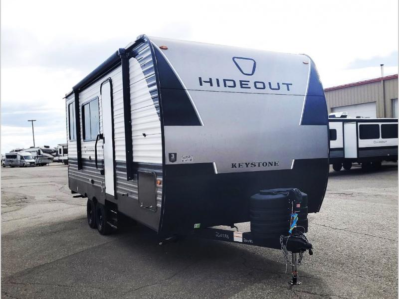 With any Hideout Sport travel trailer by Keystone you will enjoy simplified camping solutions that won't break the bank! Each model is constructed with a durable AlphaPly TPO roof membrane, tinted safety glass windows, and an I-beam frame. There are power tongue jacks and heavy duty stabilizer jacks that will make it easier than ever to hitch up and go. An XL entry assist handle will also provide convenience, along with a power awning that will provide much wanted shade during the day. You will feel right at home inside with stylish decor, blackout night shades, and cozy bed with storage underneath!