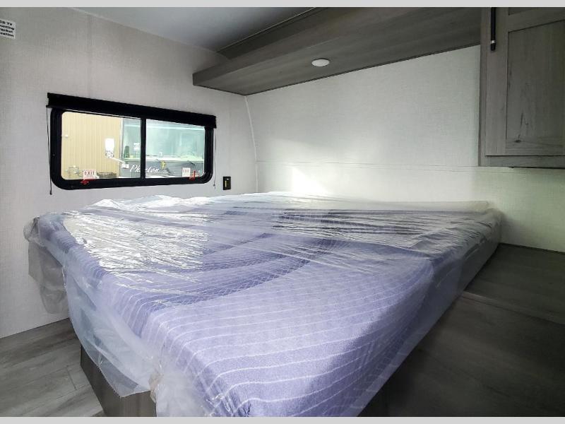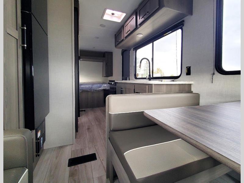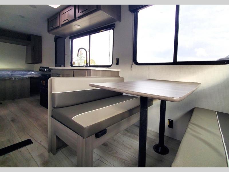This is the perfect starter travel trailer since it includes everything you need while you're away from home. You'll enjoy the queen bed up front with underbed storage and nightstands for your things, plus a full bath on board so you won't have to use the camp's facilities. This model includes a cooktop that will allow you to cook meals each day, and there is a pantry and a 10 cu. ft. 12V refrigerator for food storage! A booth dinette in the back provides a place to dine and the sofa will be perfect to relax on after a day outdoors. And these pieces of furniture can double as your guests sleeping space at night!