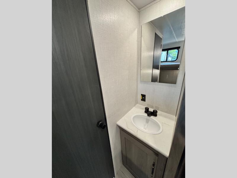You're sure to make memories at the campground in this travel trailer! The little ones or your guests can claim the bunk beds to themselves, while you take the walk-around RV queen bed up front. There are dual nightstands here plus an overhead cabinet to keep your things out of the way. Once dinner has been made on the cooktop, you can dine at the booth dinette or take your plate outdoors to sit under the 12' power awning. This unit also incudes a private bath with a shower and toilet, with the sink just outside the room so two people can freshen up at once!