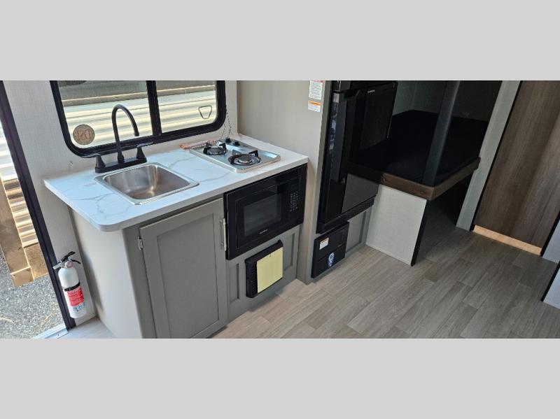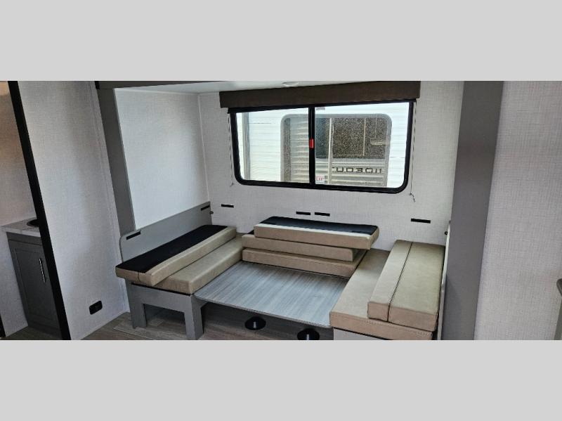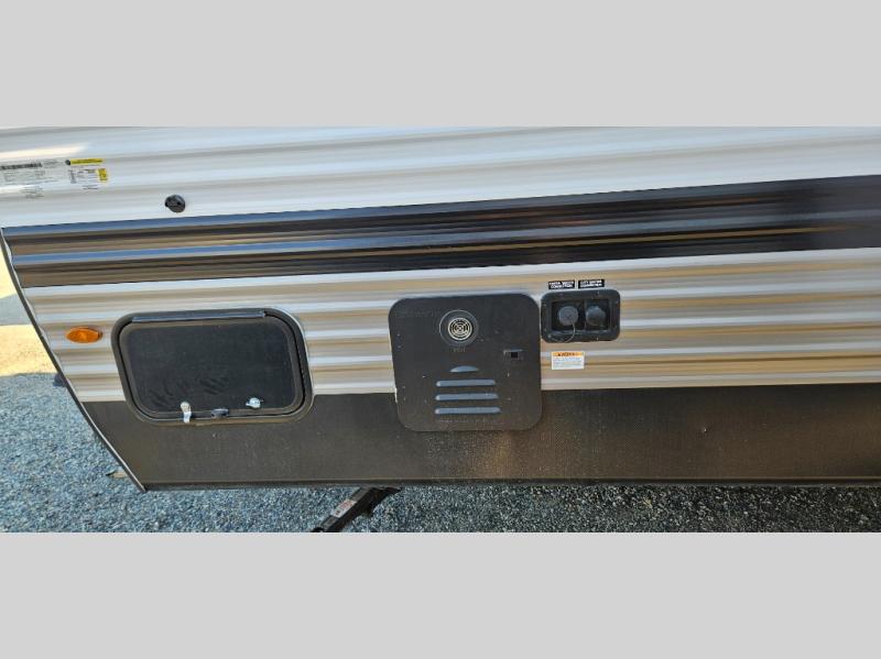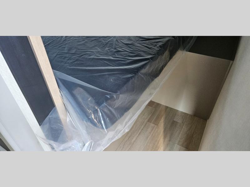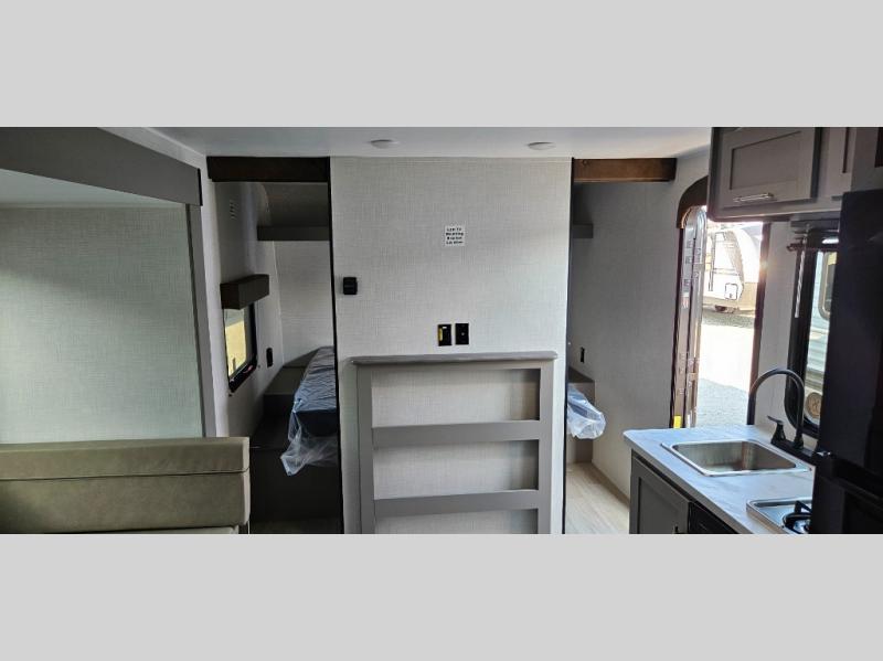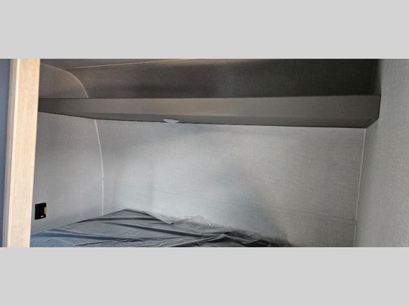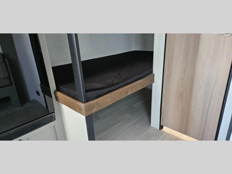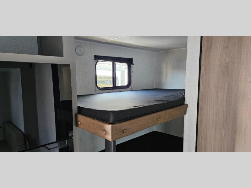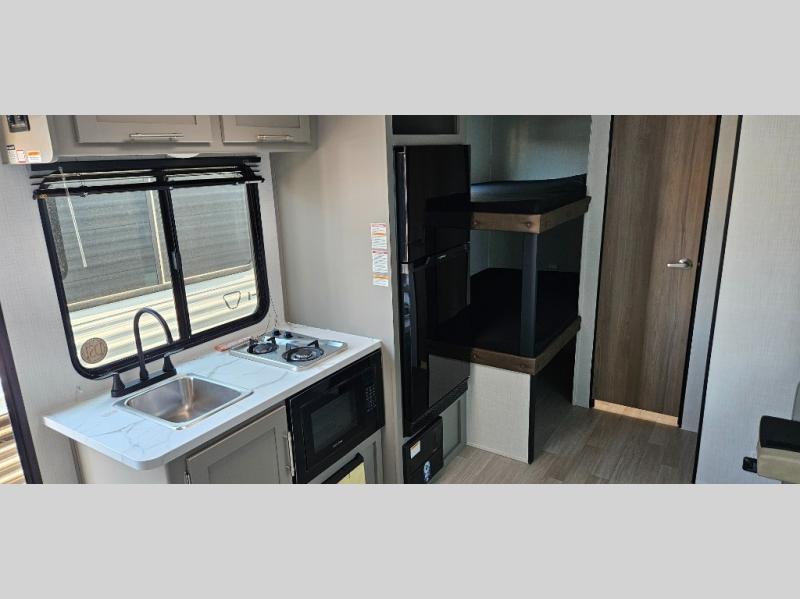 You're sure to make memories at the campground in this travel trailer! The little ones or your guests can claim the bunk beds to themselves, while you take the walk-around RV queen bed up front. There are dual nightstands here plus an overhead cabinet to keep your things out of the way. Once dinner has been made on the cooktop, you can dine at the booth dinette or take your plate outdoors to sit under the 12' power awning. This unit also incudes a private bath with a shower and toilet, with the sink just outside the room so two people can freshen up at once!