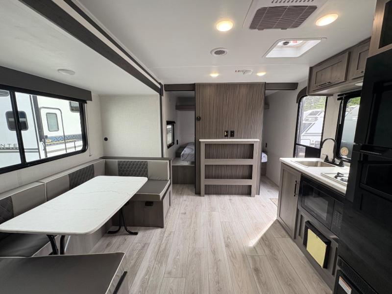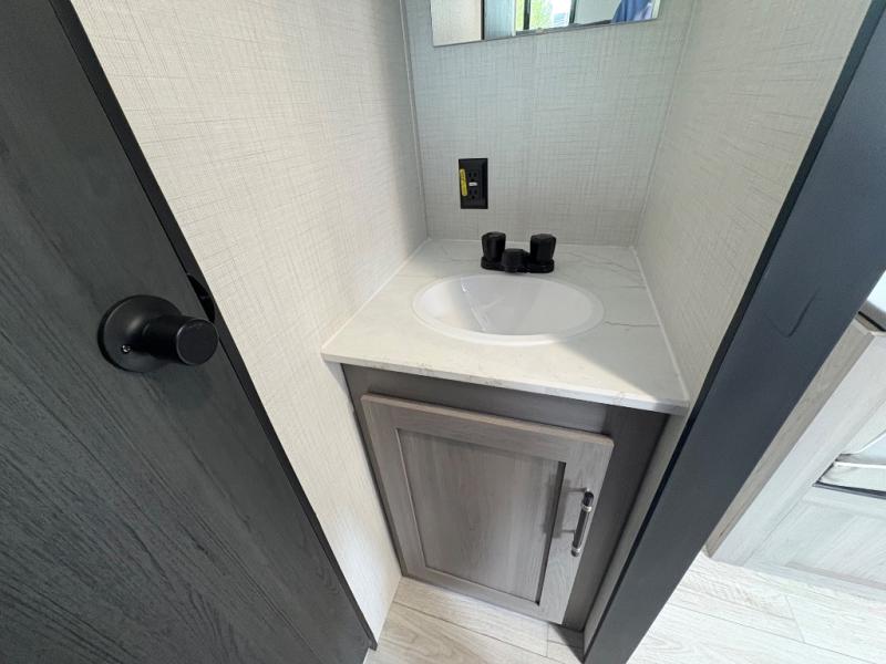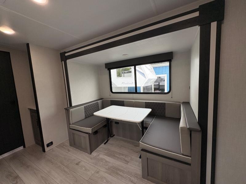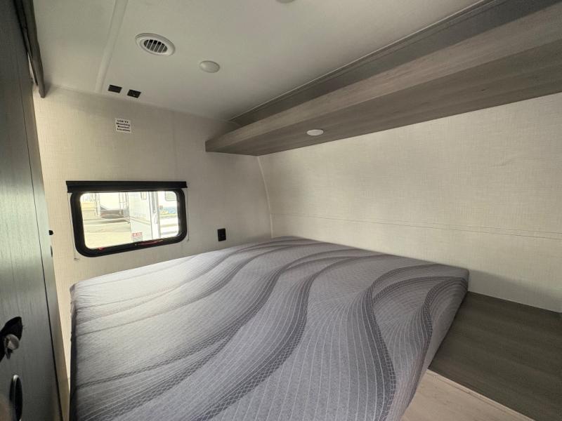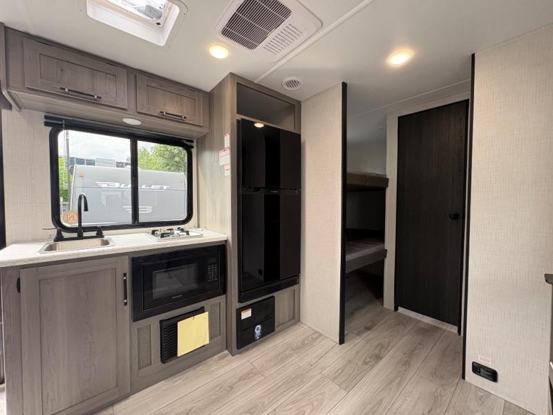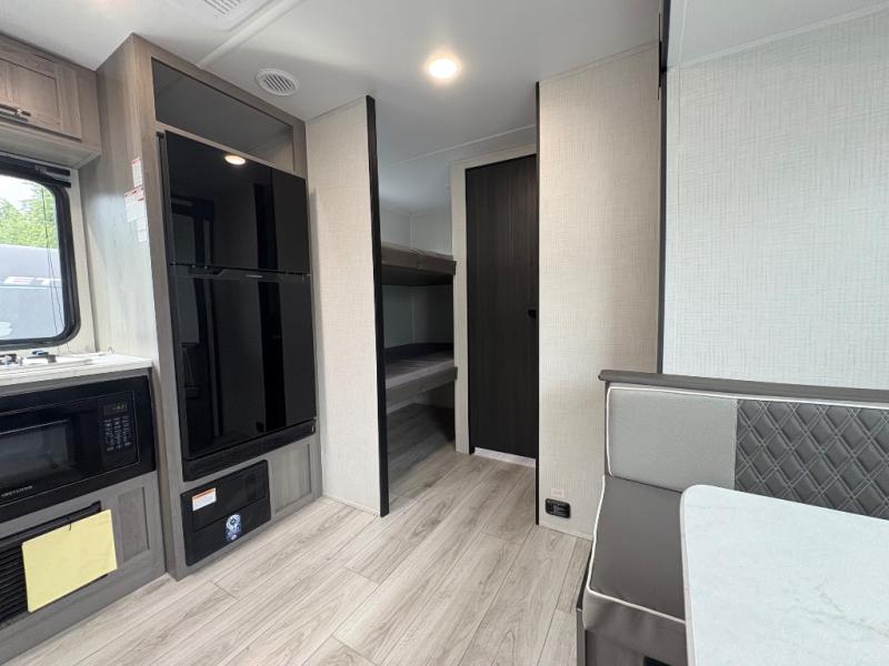 You're sure to make memories at the campground in this travel trailer! The little ones or your guests can claim the bunk beds to themselves, while you take the walk-around RV queen bed up front. There are dual nightstands here plus an overhead cabinet to keep your things out of the way. Once dinner has been made on the cooktop, you can dine at the booth dinette or take your plate outdoors to sit under the 12' power awning. This unit also incudes a private bath with a shower and toilet, with the sink just outside the room so two people can freshen up at once!
