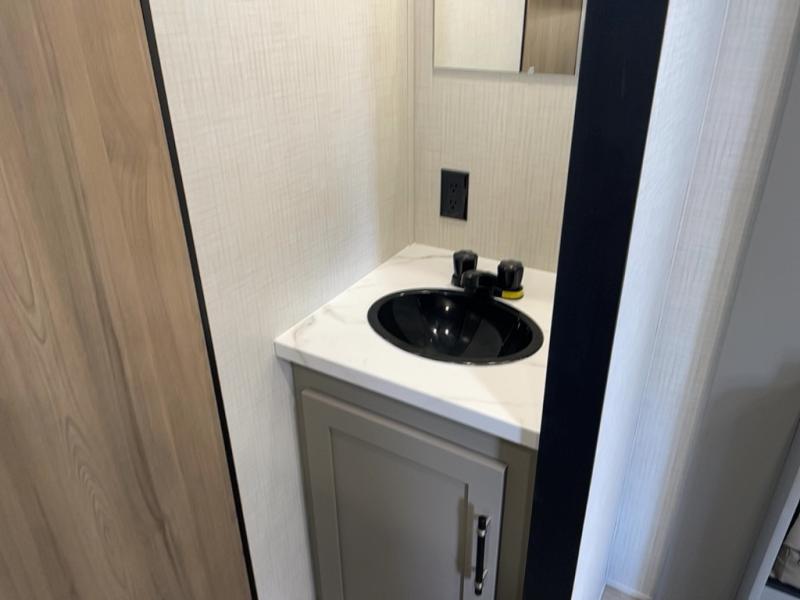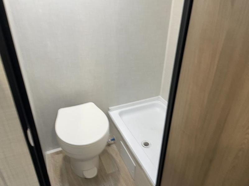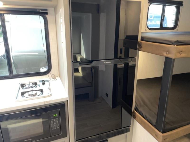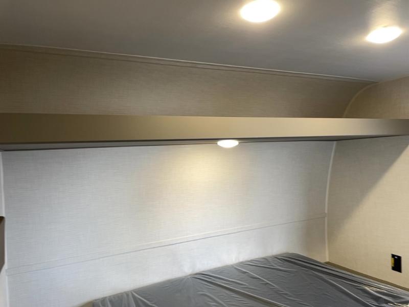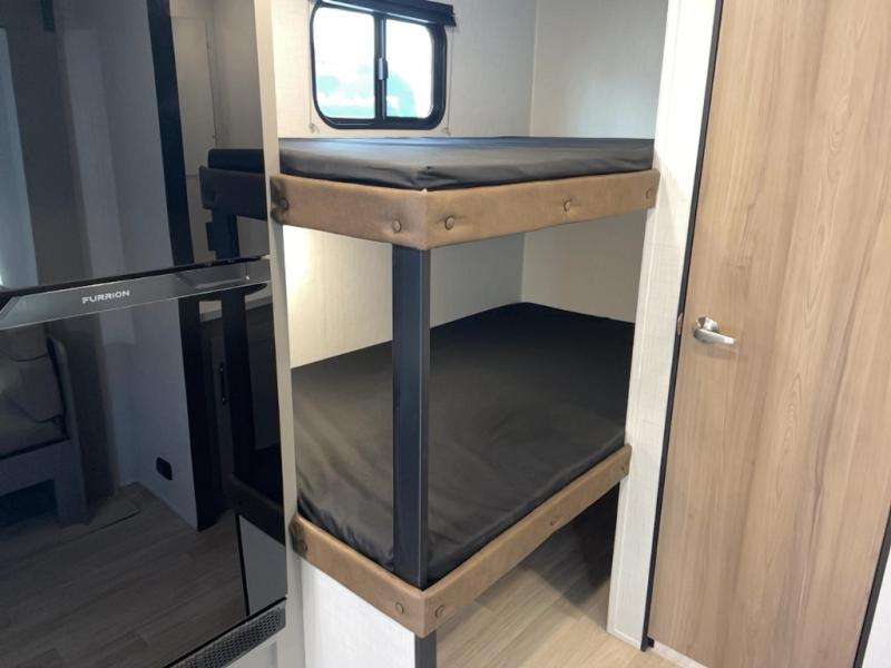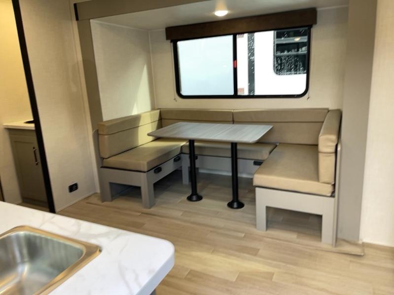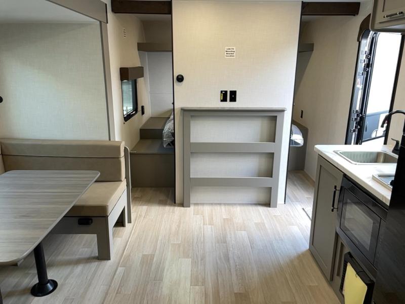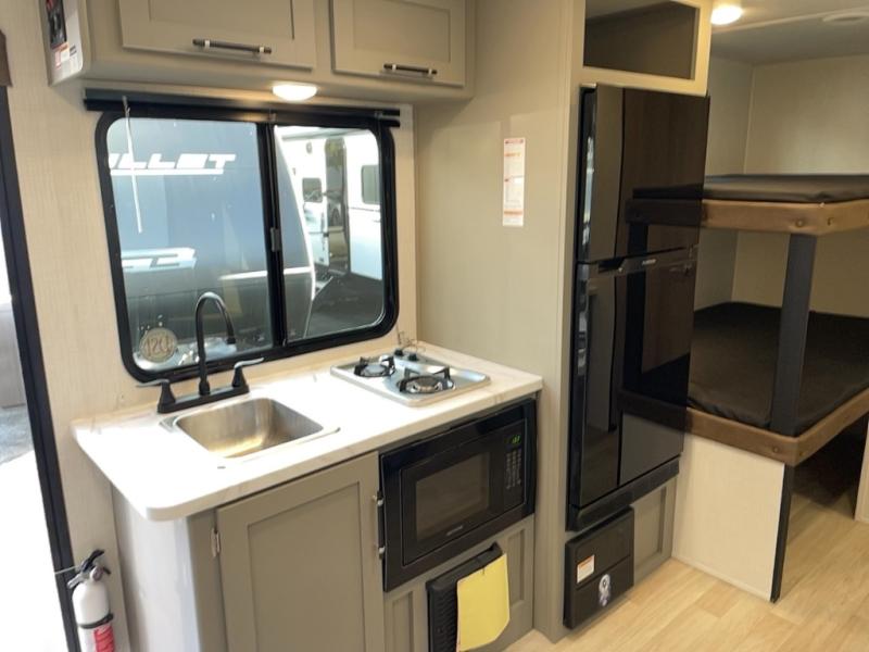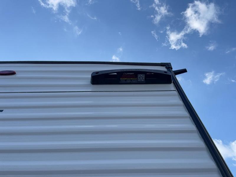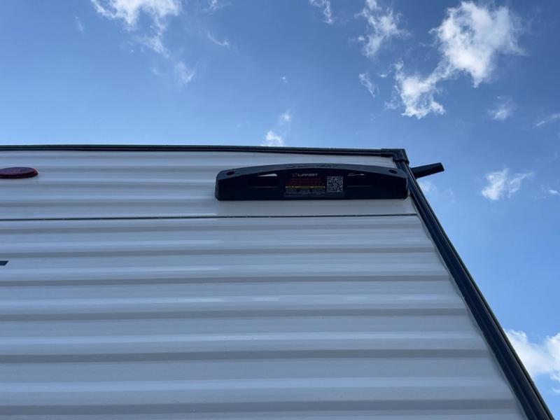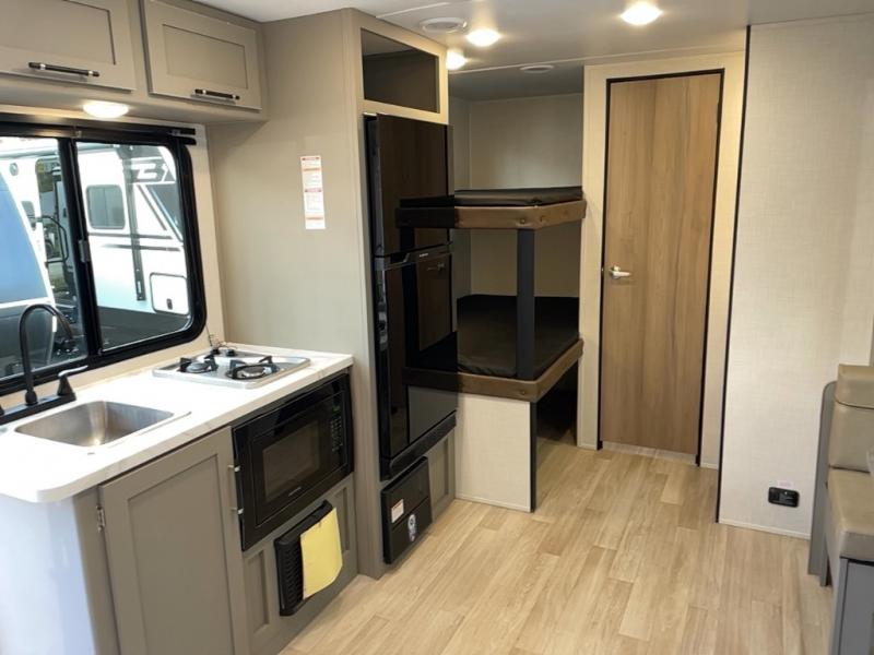 You're sure to make memories at the campground in this travel trailer! The little ones or your guests can claim the bunk beds to themselves, while you take the walk-around RV queen bed up front. There are dual nightstands here plus an overhead cabinet to keep your things out of the way. Once dinner has been made on the cooktop, you can dine at the booth dinette or take your plate outdoors to sit under the 12' power awning. This unit also incudes a private bath with a shower and toilet, with the sink just outside the room so two people can freshen up at once!
