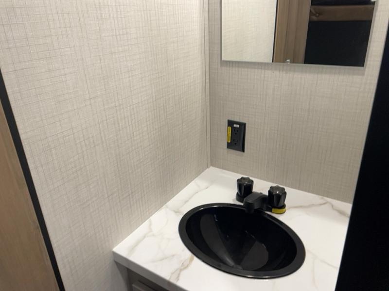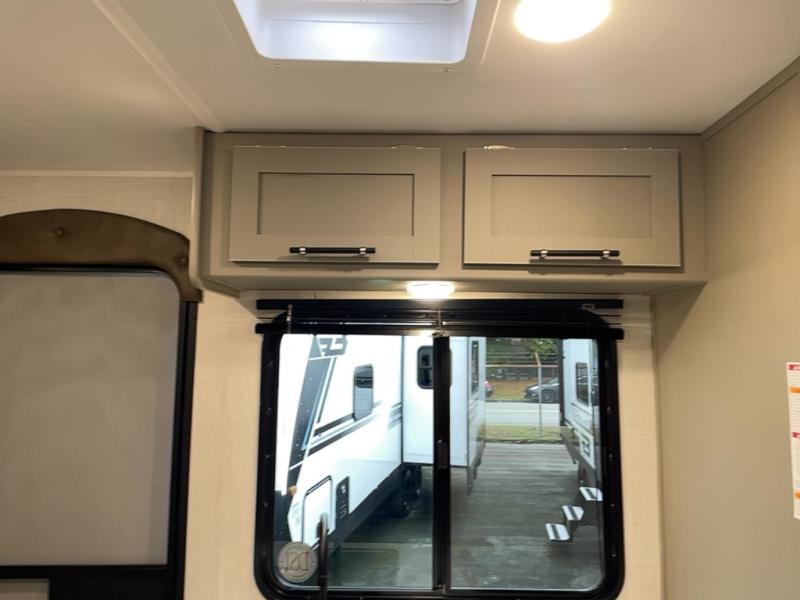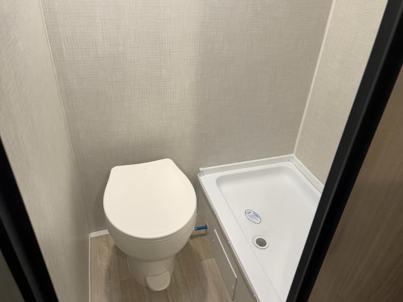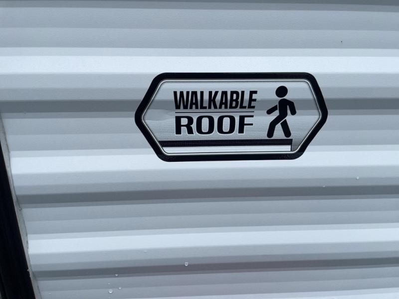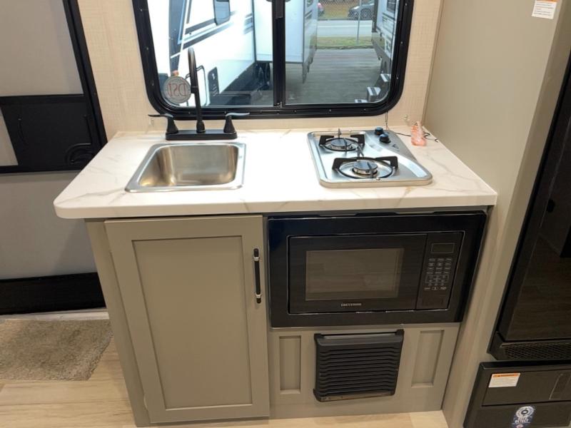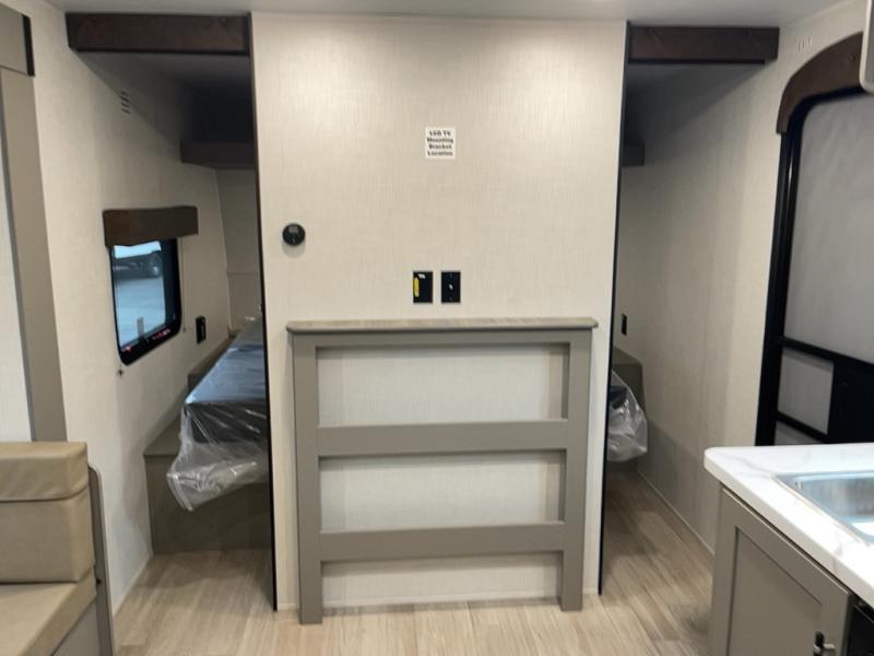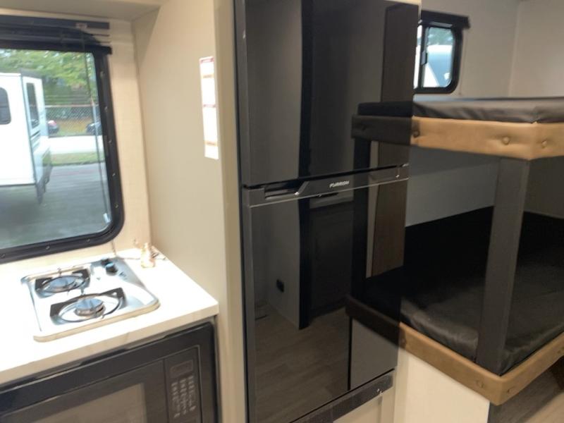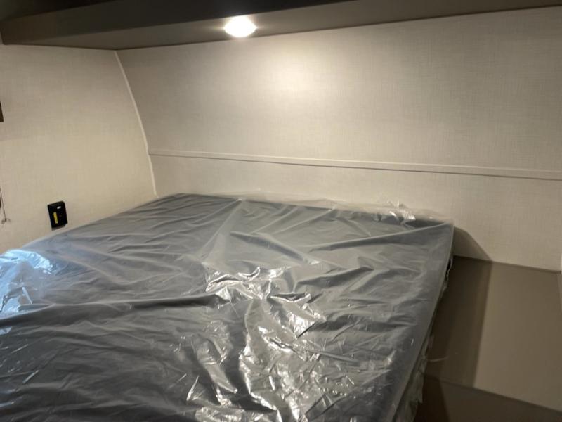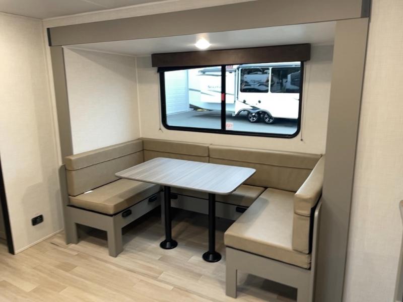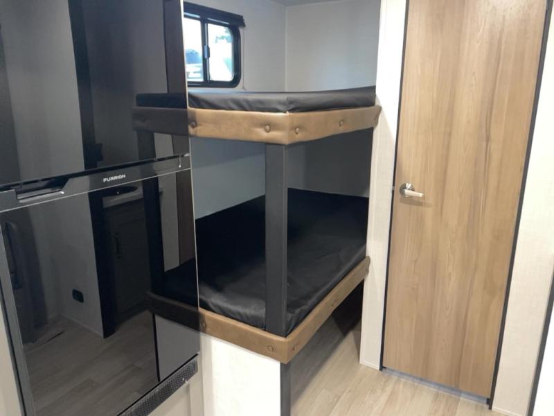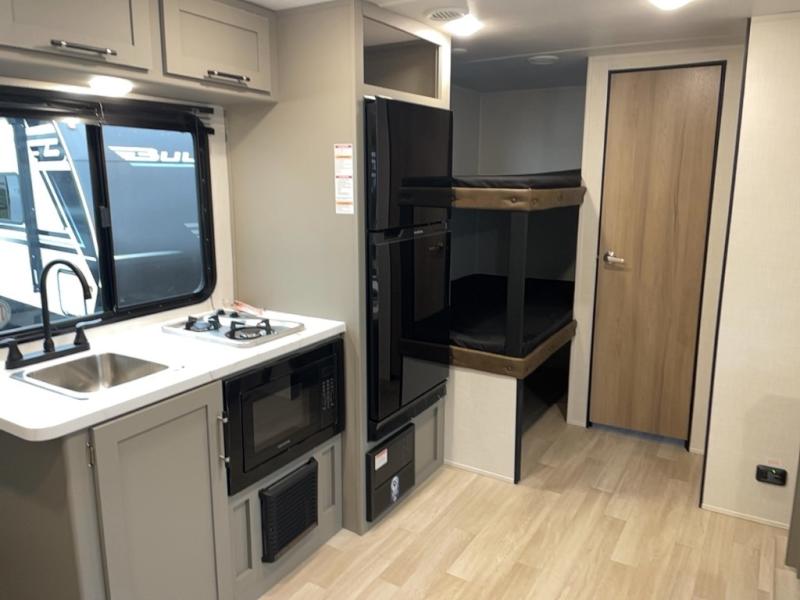 You're sure to make memories at the campground in this travel trailer! The little ones or your guests can claim the bunk beds to themselves, while you take the walk-around RV queen bed up front. There are dual nightstands here plus an overhead cabinet to keep your things out of the way. Once dinner has been made on the cooktop, you can dine at the booth dinette or take your plate outdoors to sit under the 12' power awning. This unit also incudes a private bath with a shower and toilet, with the sink just outside the room so two people can freshen up at once!