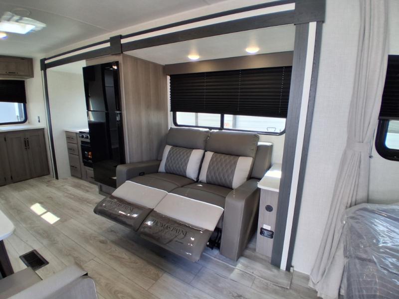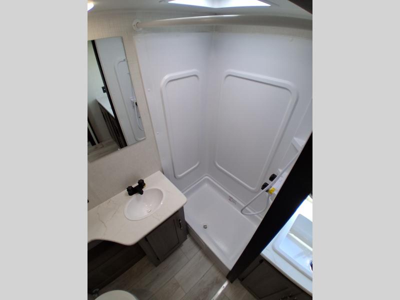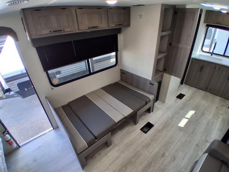 Trips to the lake are made easy in this spacious travel trailer for four to five. You can wake up feeling refreshed each day after sleeping on the queen bed, and there is a privacy curtain here if you have guests staying over. They can convert the sofa and booth dinette back into seating spaces while the chef of your group makes breakfast on the three burner range. There is also a spacious pantry and 10 cu. ft. 12V refrigerator to keep food stocked. The full bath will allow you to clean up without having to leave your camper; how convenient!