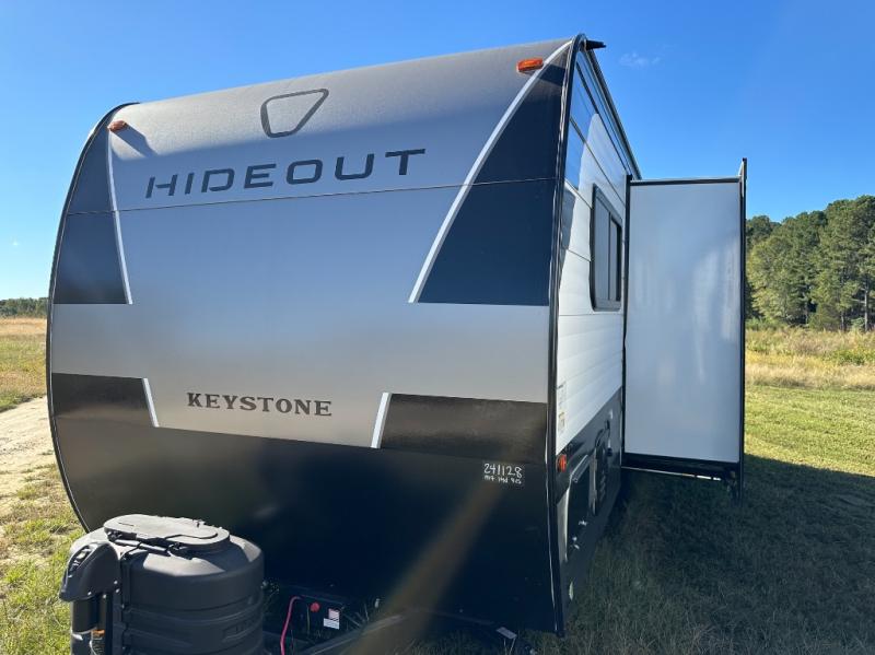 With any Hideout Sport travel trailer by Keystone you will enjoy simplified camping solutions that won't break the bank! Each model is constructed with a durable AlphaPly TPO roof membrane, tinted safety glass windows, and an I-beam frame. There are power tongue jacks and heavy duty stabilizer jacks that will make it easier than ever to hitch up and go. An XL entry assist handle will also provide convenience, along with a power awning that will provide much wanted shade during the day. You will feel right at home inside with stylish decor, blackout night shades, and cozy bed with storage underneath!