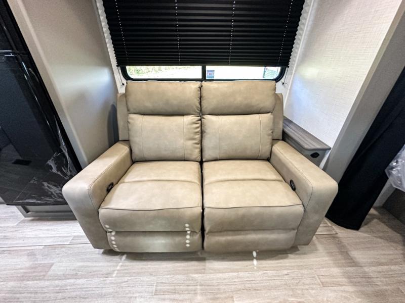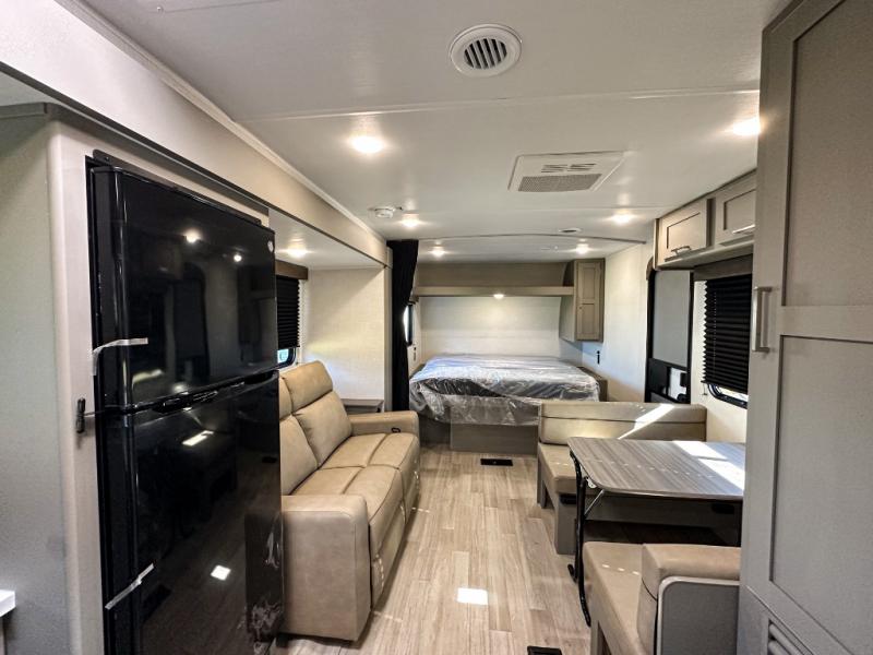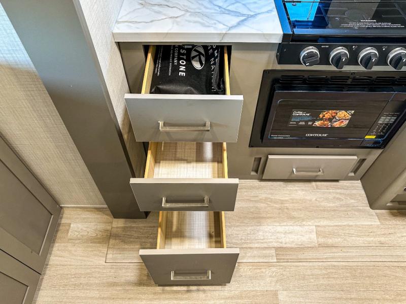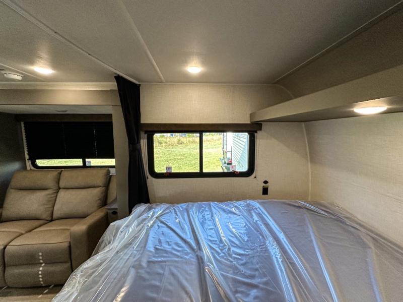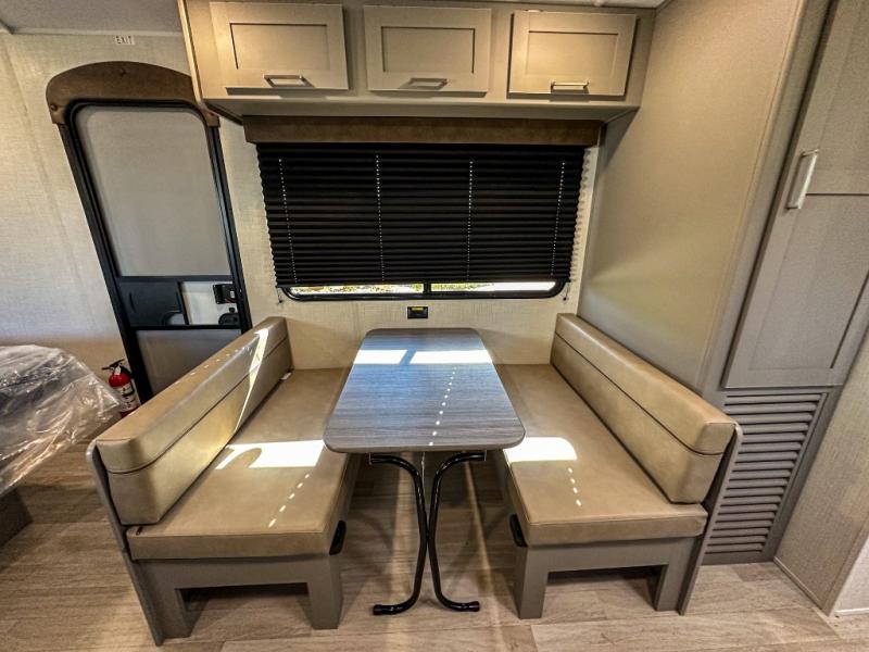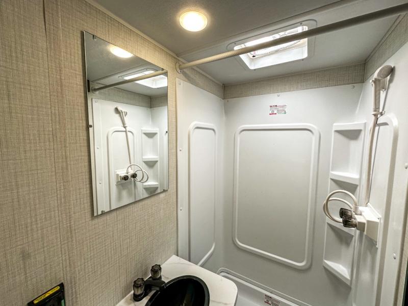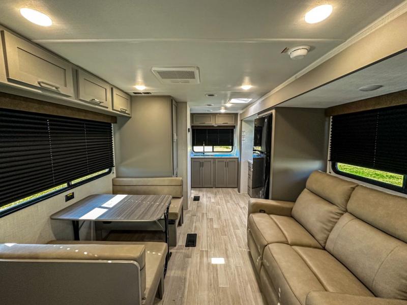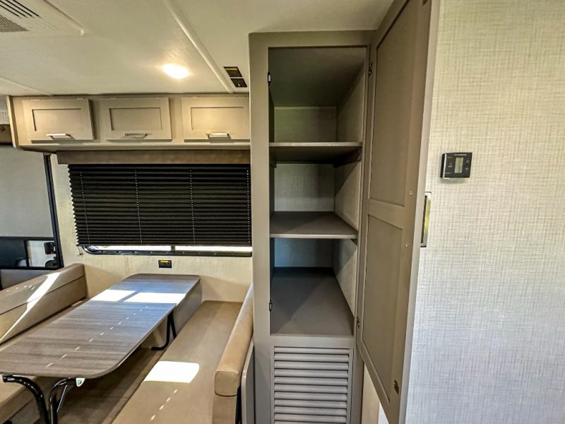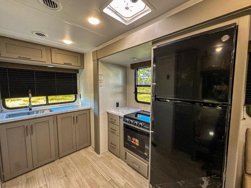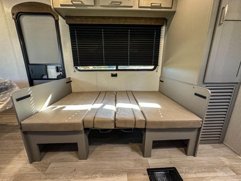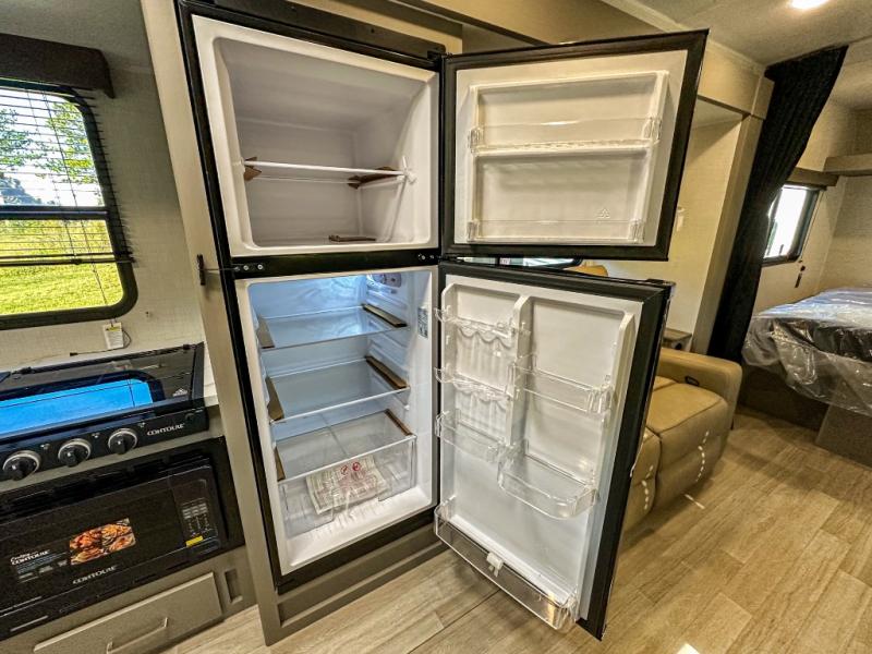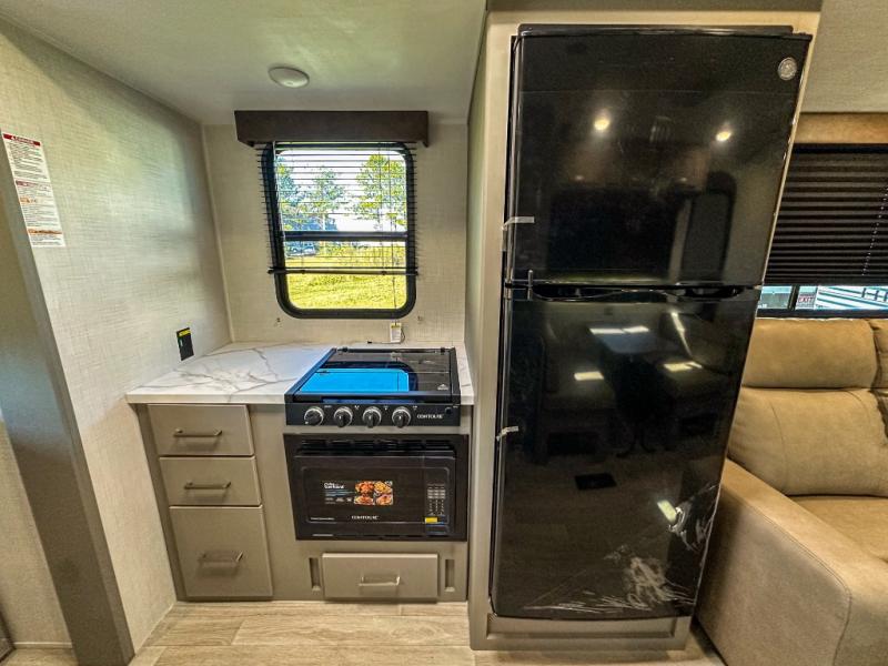 Trips to the lake are made easy in this spacious travel trailer for four to five. You can wake up feeling refreshed each day after sleeping on the queen bed, and there is a privacy curtain here if you have guests staying over. They can convert the sofa and booth dinette back into seating spaces while the chef of your group makes breakfast on the three burner range. There is also a spacious pantry and 10 cu. ft. 12V refrigerator to keep food stocked. The full bath will allow you to clean up without having to leave your camper; how convenient!