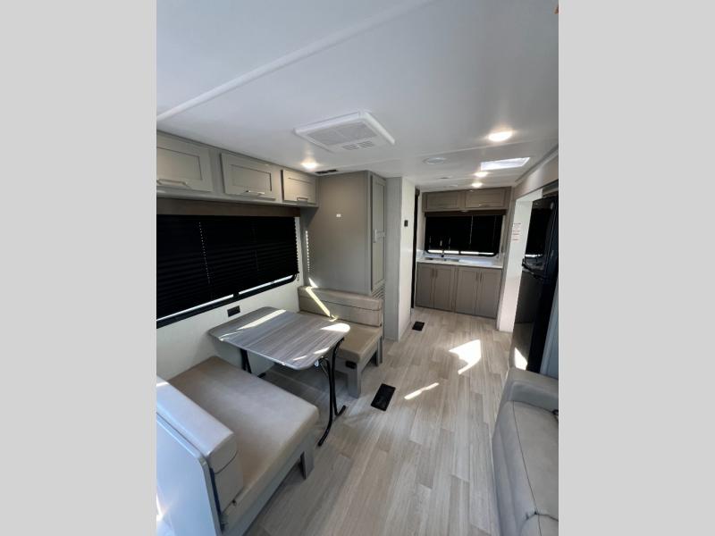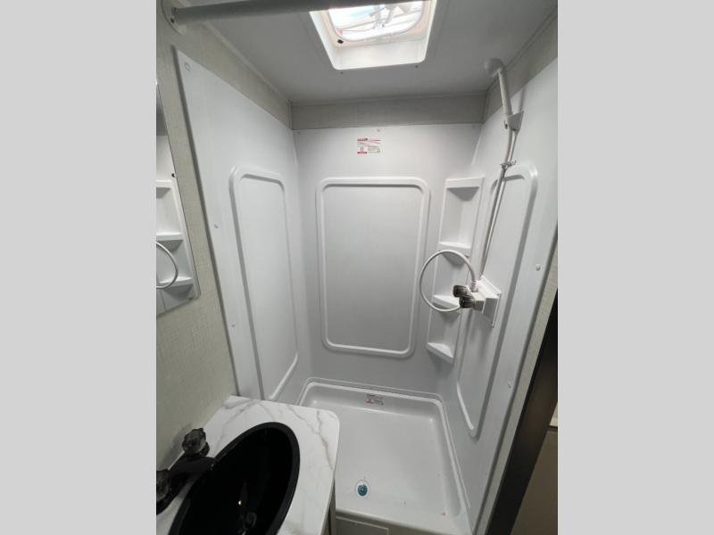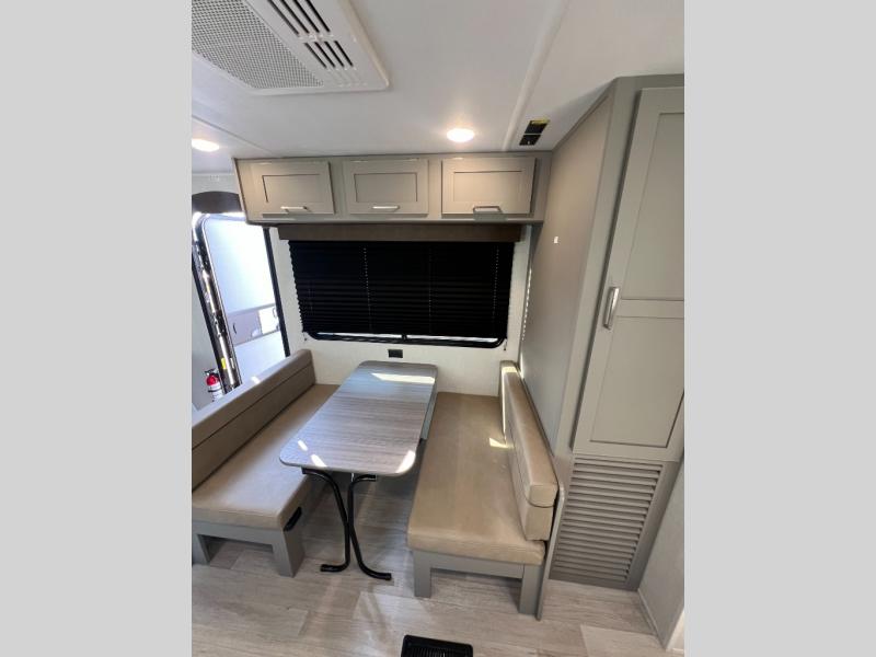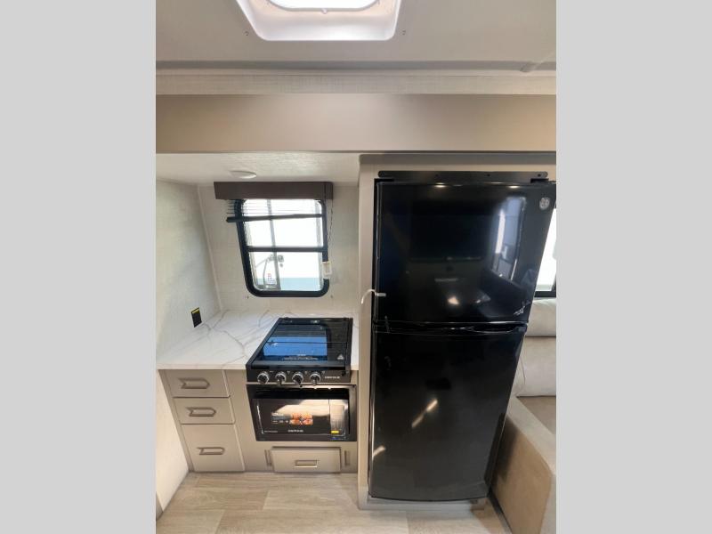 Trips to the lake are made easy in this spacious travel trailer for four to five. You can wake up feeling refreshed each day after sleeping on the queen bed, and there is a privacy curtain here if you have guests staying over. They can convert the sofa and booth dinette back into seating spaces while the chef of your group makes breakfast on the three burner range. There is also a spacious pantry and 10 cu. ft. 12V refrigerator to keep food stocked. The full bath will allow you to clean up without having to leave your camper; how convenient!