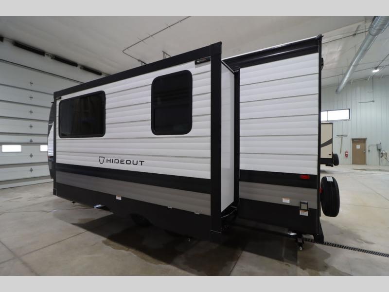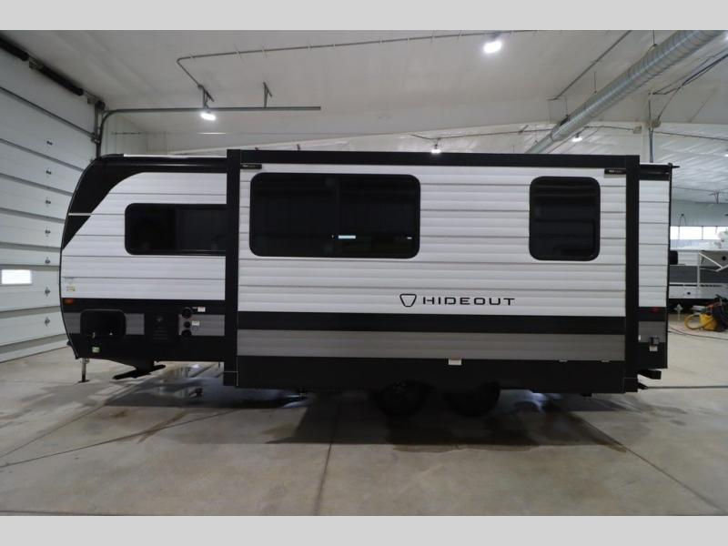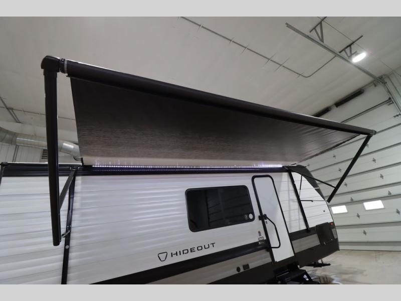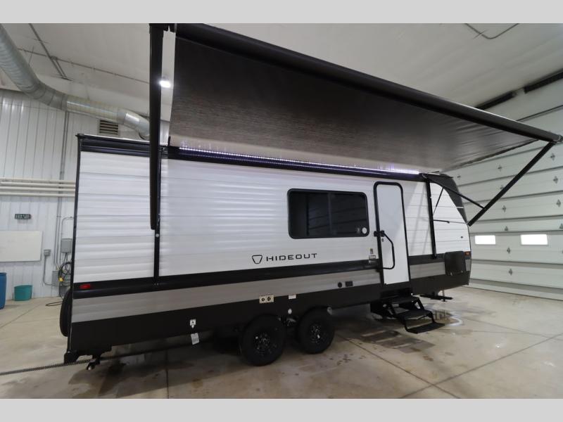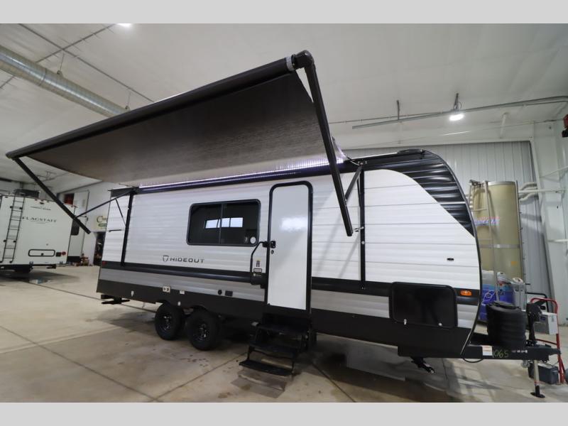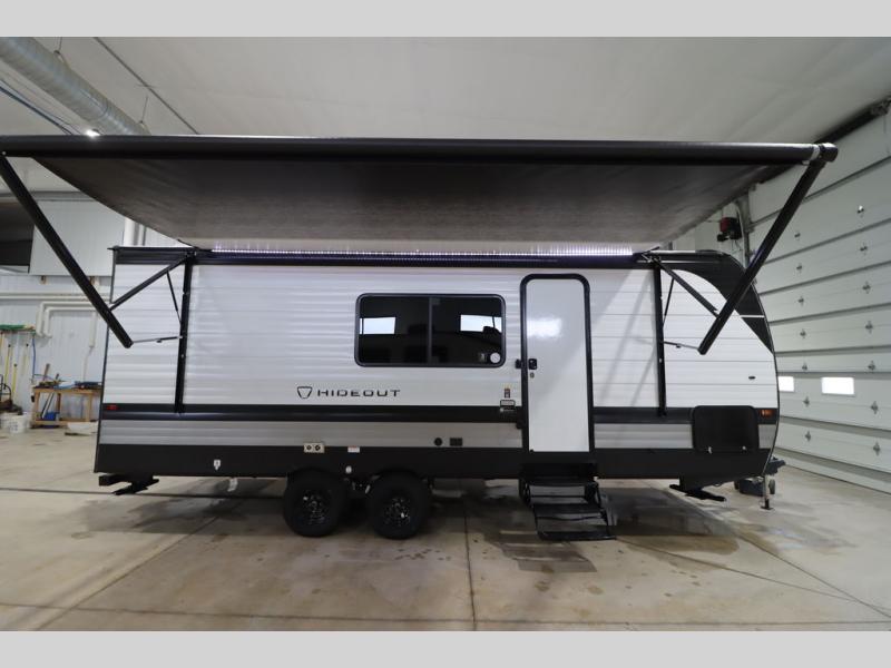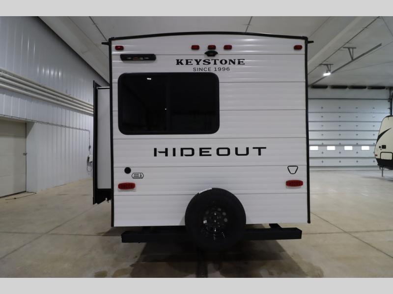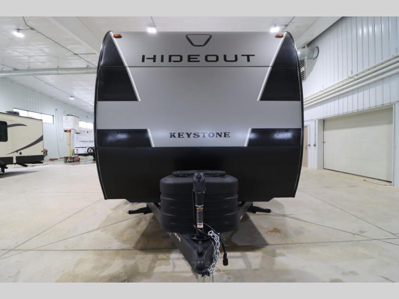 With any Hideout Sport travel trailer by Keystone you will enjoy simplified camping solutions that won't break the bank! Each model is constructed with a durable AlphaPly TPO roof membrane, tinted safety glass windows, and an I-beam frame. There are power tongue jacks and heavy duty stabilizer jacks that will make it easier than ever to hitch up and go. An XL entry assist handle will also provide convenience, along with a power awning that will provide much wanted shade during the day. You will feel right at home inside with stylish decor, blackout night shades, and cozy bed with storage underneath!