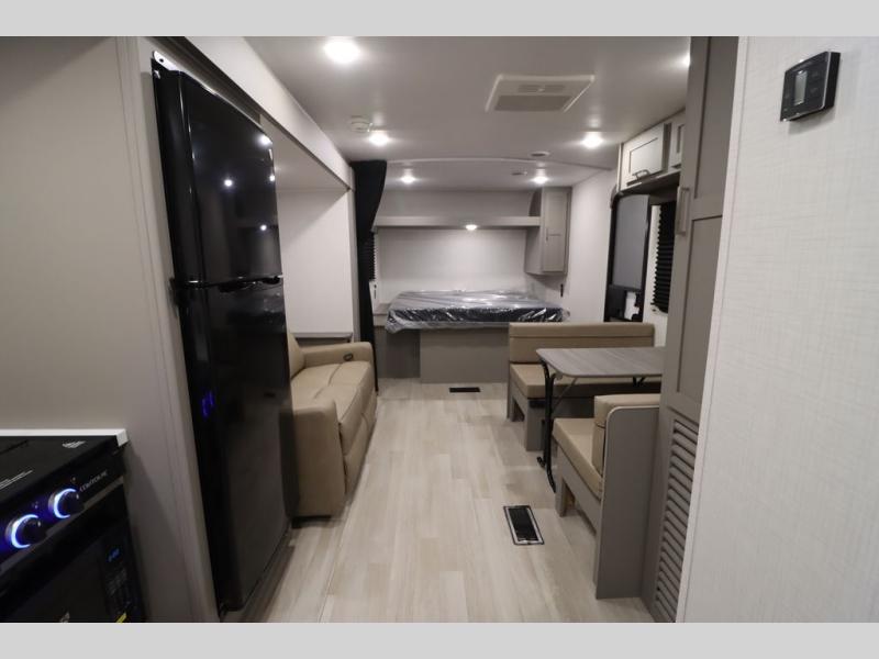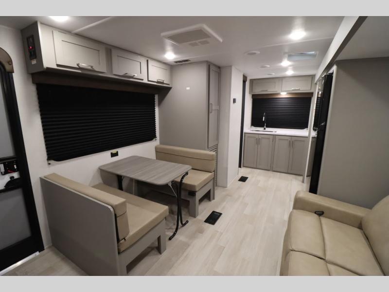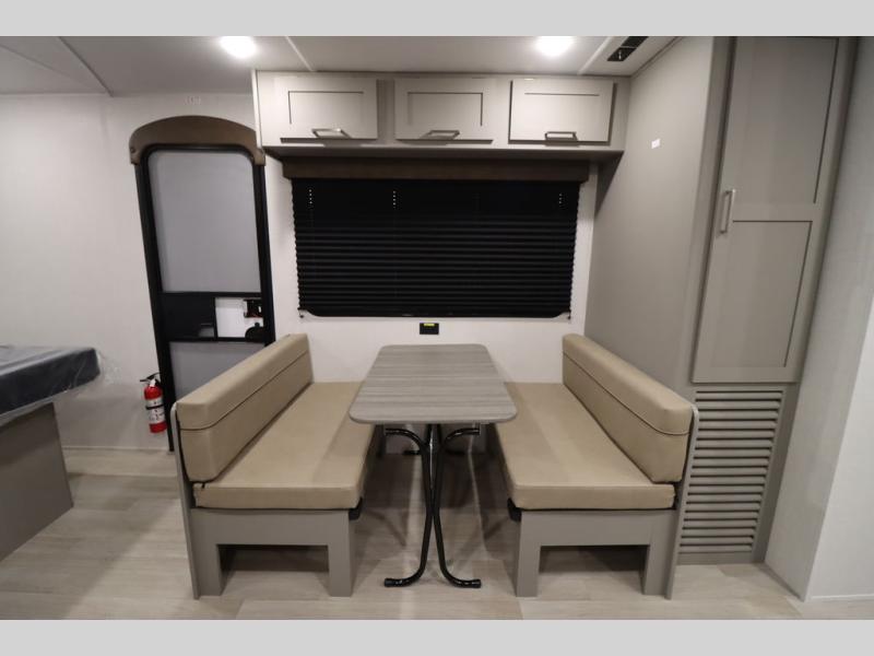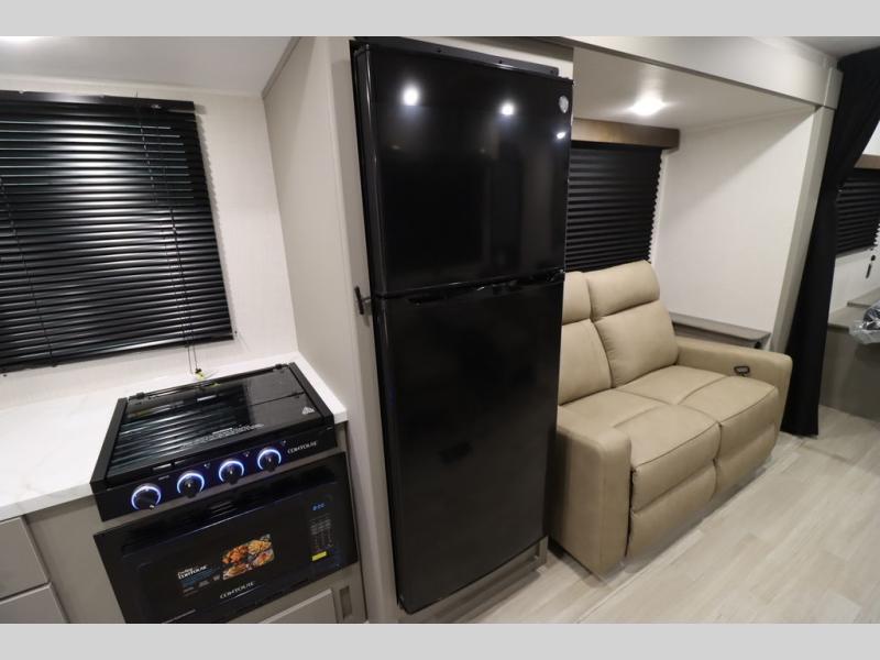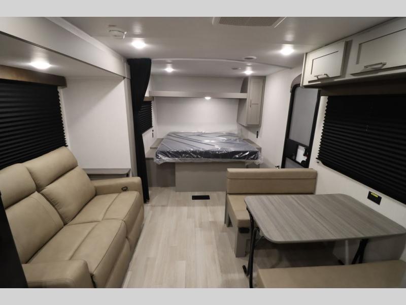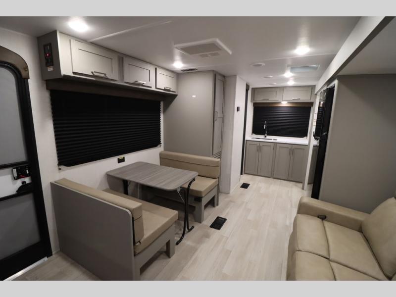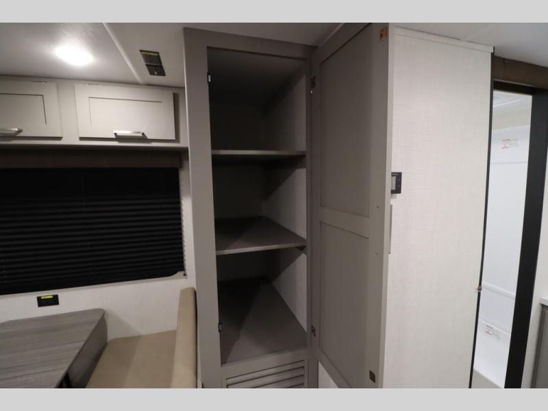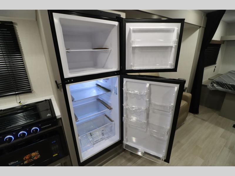 Trips to the lake are made easy in this spacious travel trailer for four to five. You can wake up feeling refreshed each day after sleeping on the queen bed, and there is a privacy curtain here if you have guests staying over. They can convert the sofa and booth dinette back into seating spaces while the chef of your group makes breakfast on the three burner range. There is also a spacious pantry and 10 cu. ft. 12V refrigerator to keep food stocked. The full bath will allow you to clean up without having to leave your camper; how convenient!