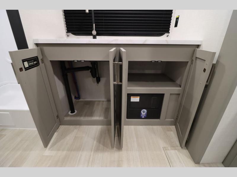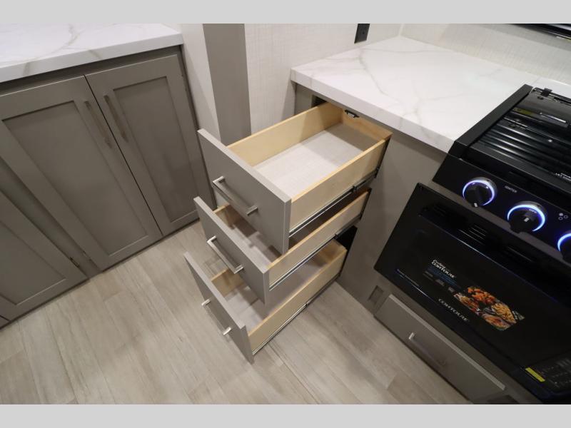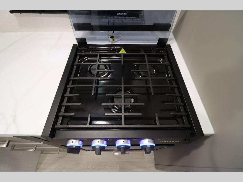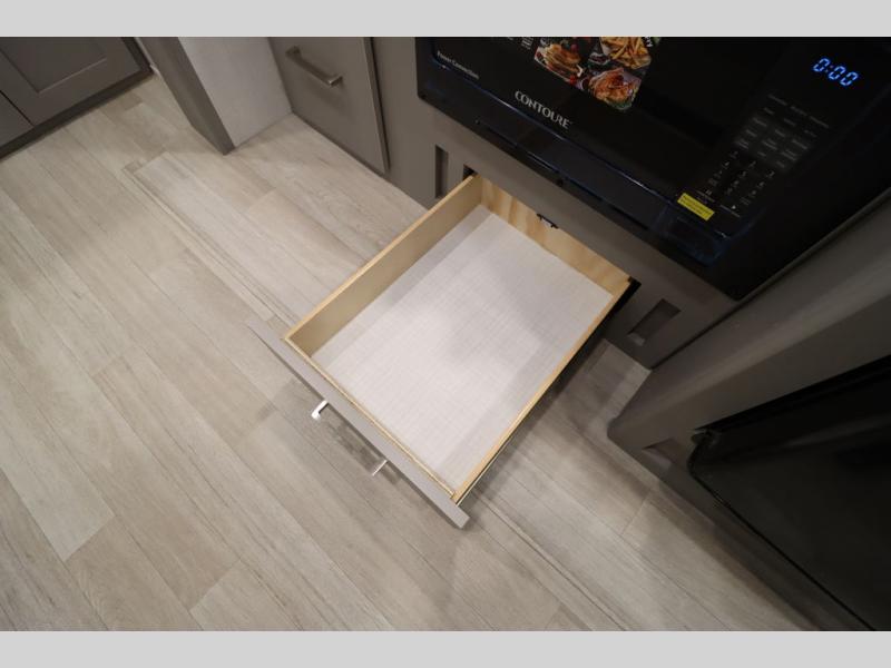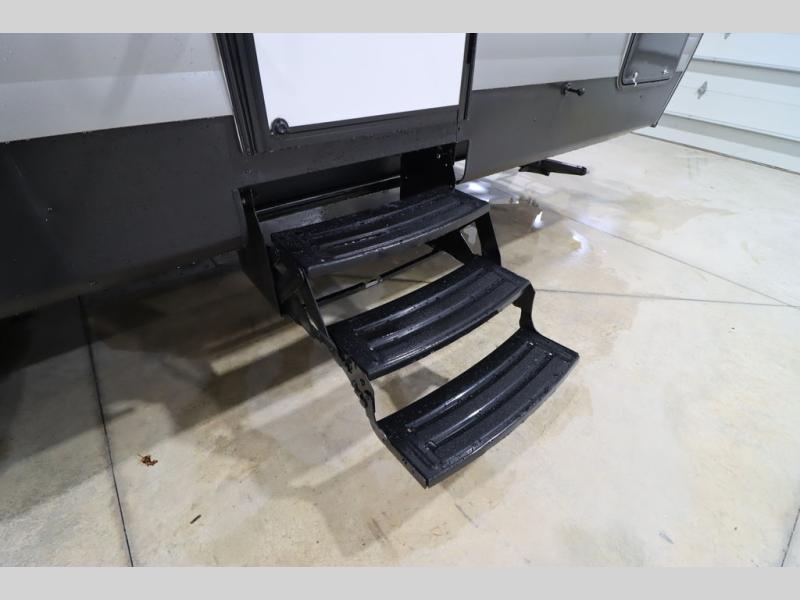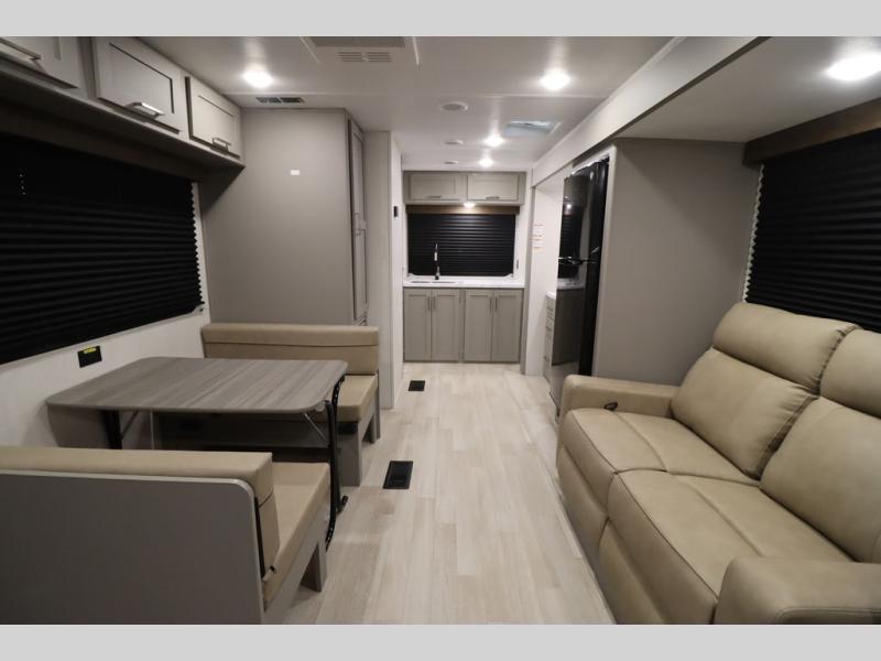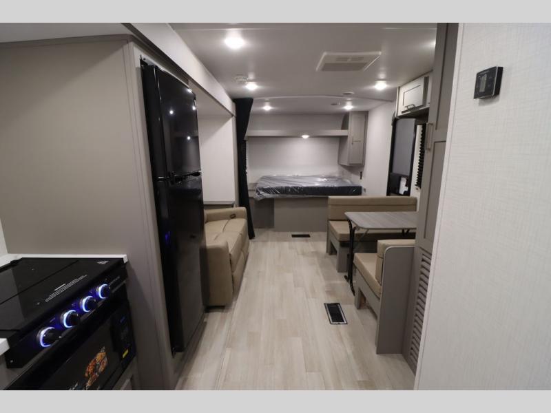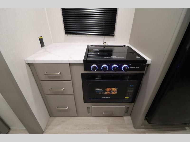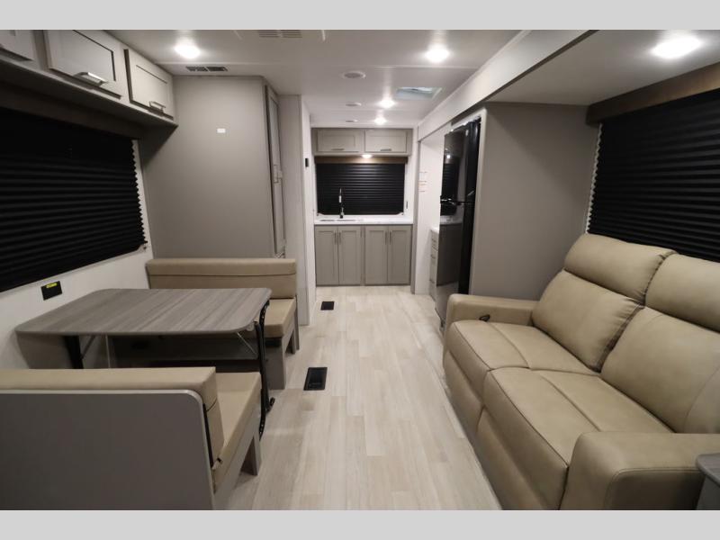 Trips to the lake are made easy in this spacious travel trailer for four to five. You can wake up feeling refreshed each day after sleeping on the queen bed, and there is a privacy curtain here if you have guests staying over. They can convert the sofa and booth dinette back into seating spaces while the chef of your group makes breakfast on the three burner range. There is also a spacious pantry and 10 cu. ft. 12V refrigerator to keep food stocked. The full bath will allow you to clean up without having to leave your camper; how convenient!
