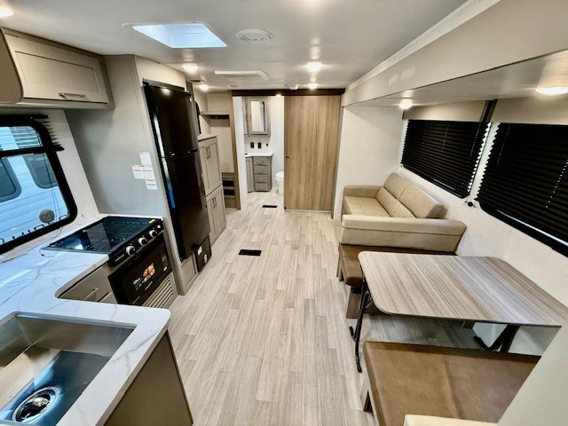 You'll feel right at home wherever you decide to camp in this travel trailer. The large slide out in the combined kitchen and living area gives your crew plenty of space to move about, plus there is a booth dinette and sofa for comfy seating and sleeping spaces. A full kitchen, compete with three burner cooktop and 10 cu. ft. 12V refrigerator will let you cook and store food for the whole week. Head to the full rear bath that includes a spacious vanity, a shower, toilet, and linen closet for clean towels. And when you're ready to catch some zzz's, the queen bed in the front private bedroom is sure to bring comfort!