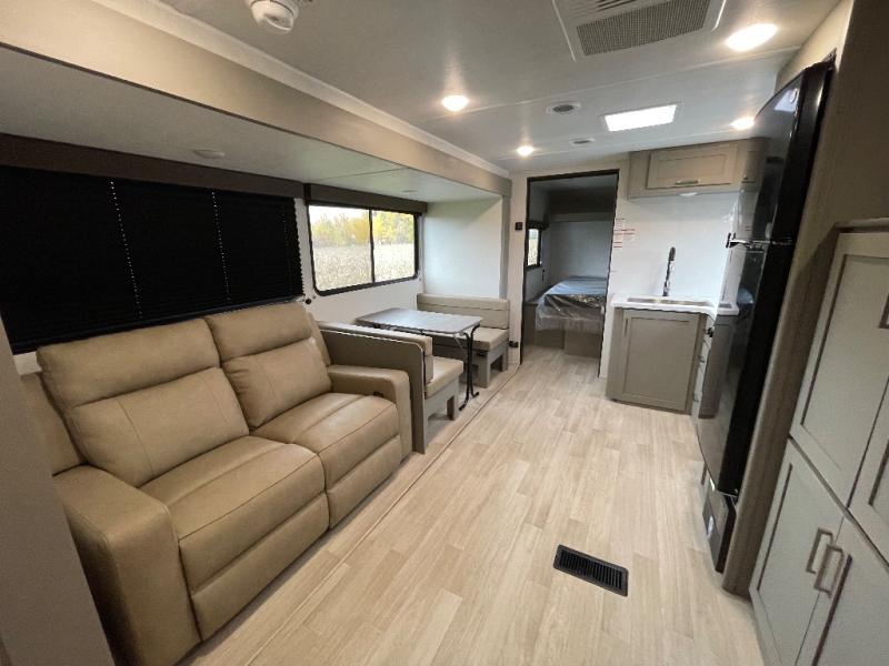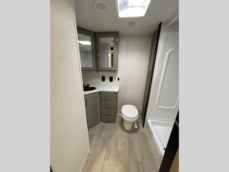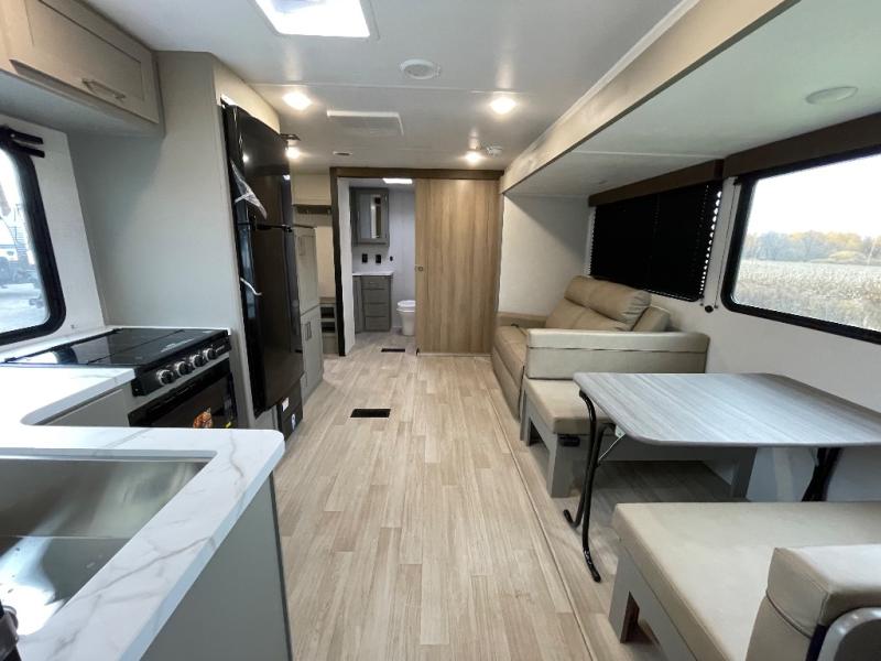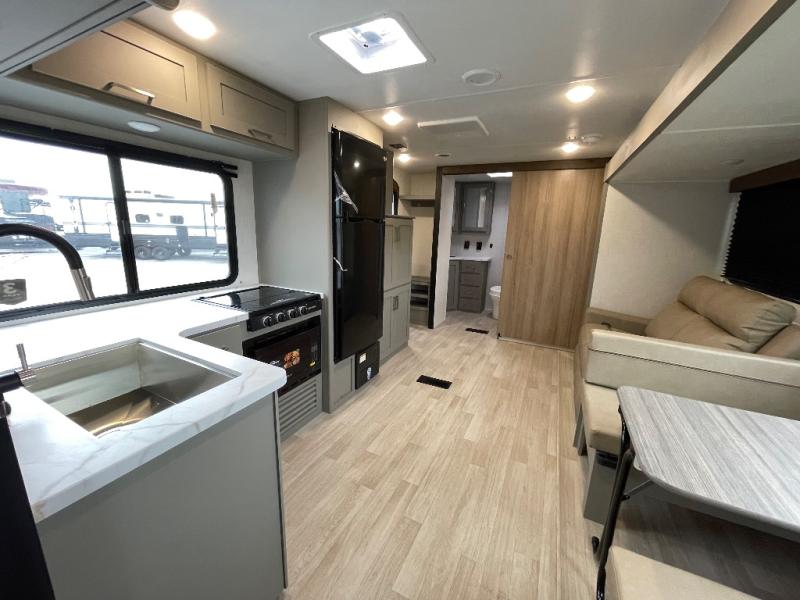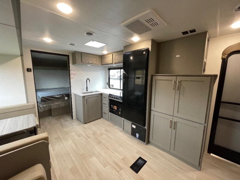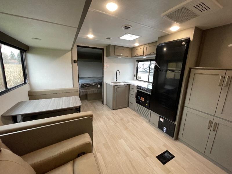 You'll feel right at home wherever you decide to camp in this travel trailer. The large slide out in the combined kitchen and living area gives your crew plenty of space to move about, plus there is a booth dinette and sofa for comfy seating and sleeping spaces. A full kitchen, compete with three burner cooktop and 10 cu. ft. 12V refrigerator will let you cook and store food for the whole week. Head to the full rear bath that includes a spacious vanity, a shower, toilet, and linen closet for clean towels. And when you're ready to catch some zzz's, the queen bed in the front private bedroom is sure to bring comfort!