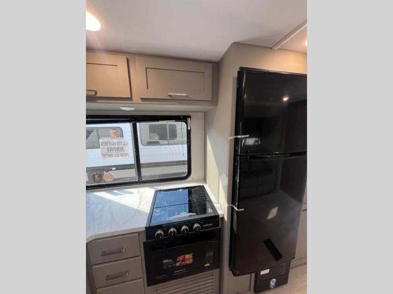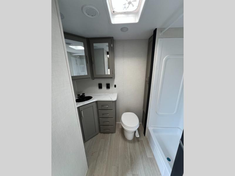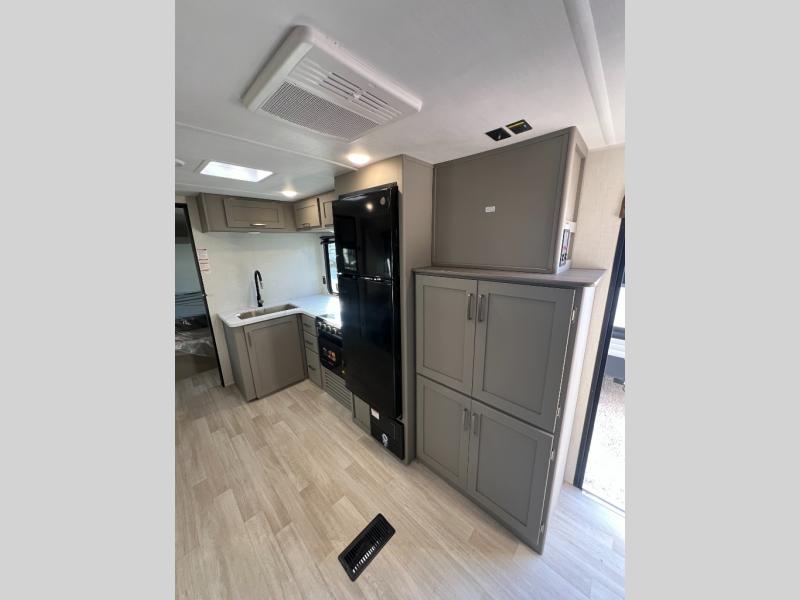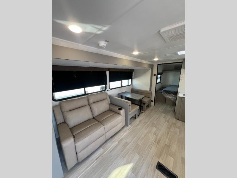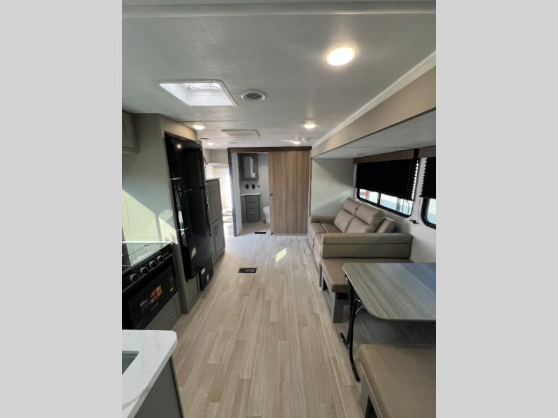 You'll feel right at home wherever you decide to camp in this travel trailer. The large slide out in the combined kitchen and living area gives your crew plenty of space to move about, plus there is a booth dinette and sofa for comfy seating and sleeping spaces. A full kitchen, compete with three burner cooktop and 10 cu. ft. 12V refrigerator will let you cook and store food for the whole week. Head to the full rear bath that includes a spacious vanity, a shower, toilet, and linen closet for clean towels. And when you're ready to catch some zzz's, the queen bed in the front private bedroom is sure to bring comfort!