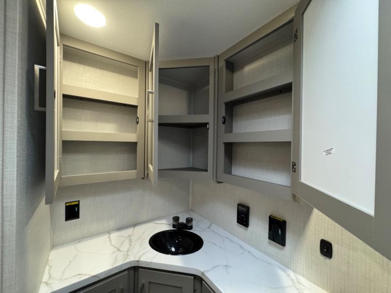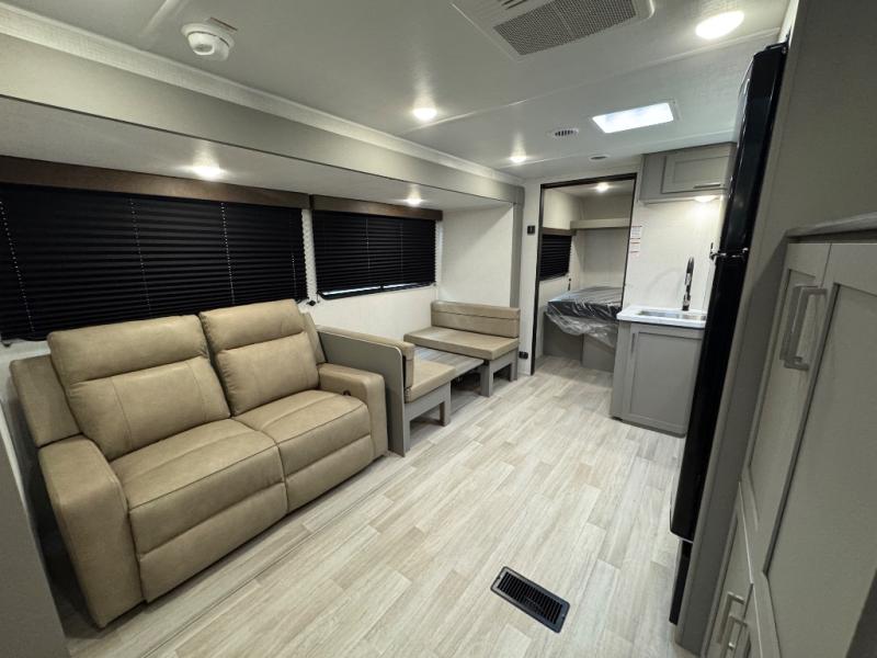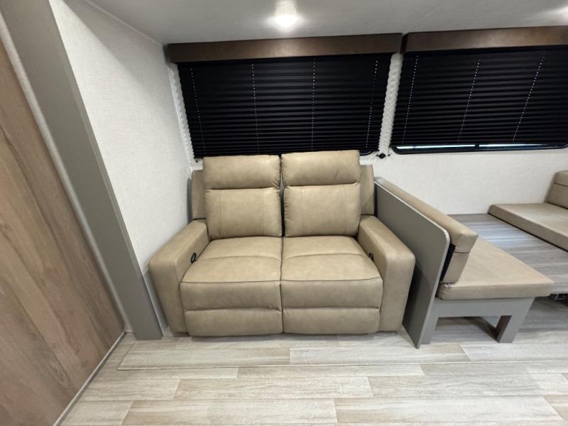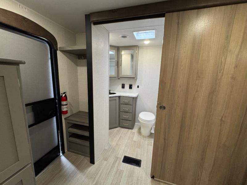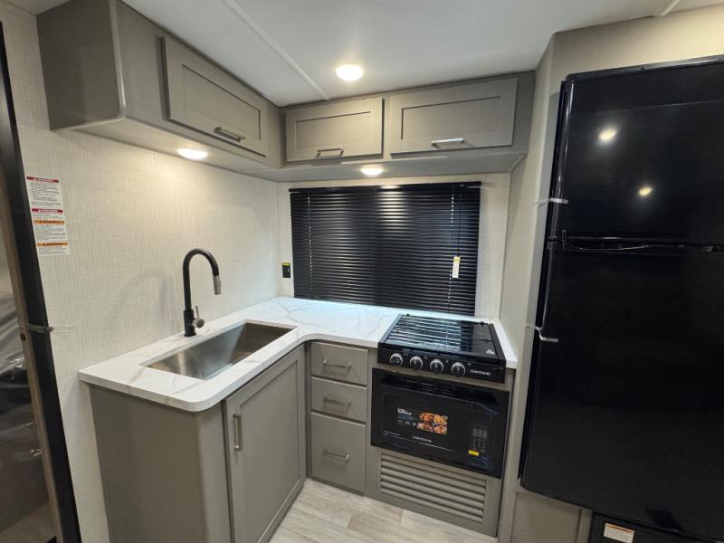 You'll feel right at home wherever you decide to camp in this travel trailer. The large slide out in the combined kitchen and living area gives your crew plenty of space to move about, plus there is a booth dinette and sofa for comfy seating and sleeping spaces. A full kitchen, compete with three burner cooktop and 10 cu. ft. 12V refrigerator will let you cook and store food for the whole week. Head to the full rear bath that includes a spacious vanity, a shower, toilet, and linen closet for clean towels. And when you're ready to catch some zzz's, the queen bed in the front private bedroom is sure to bring comfort!