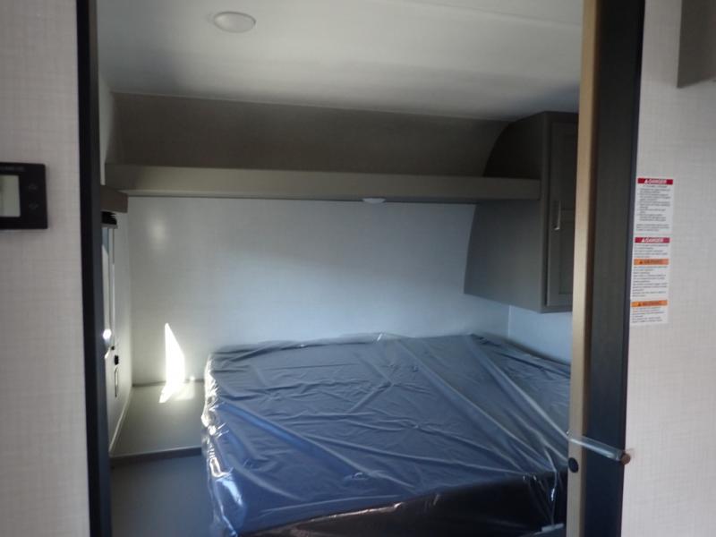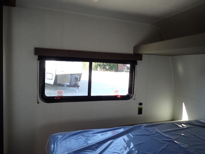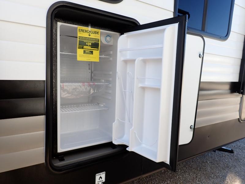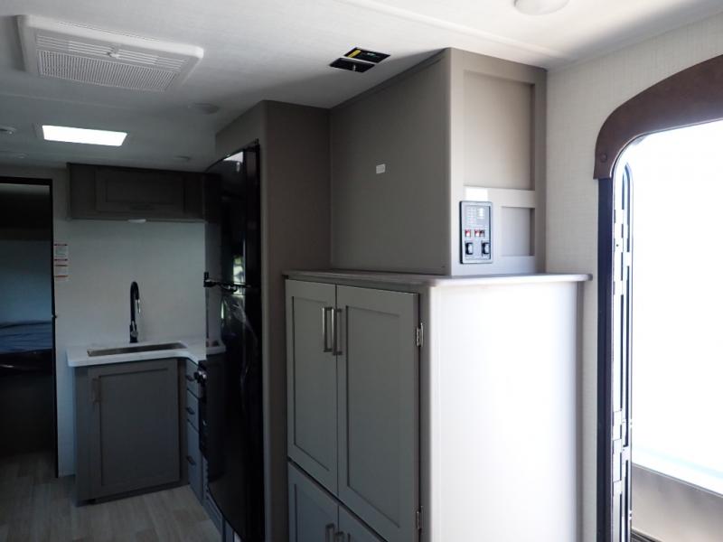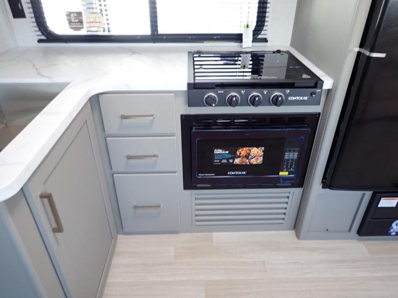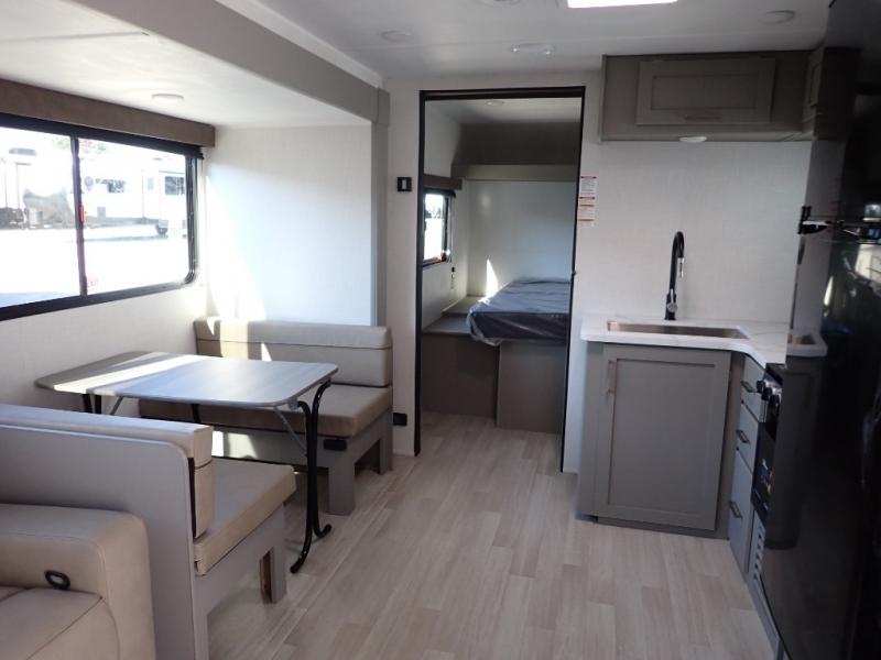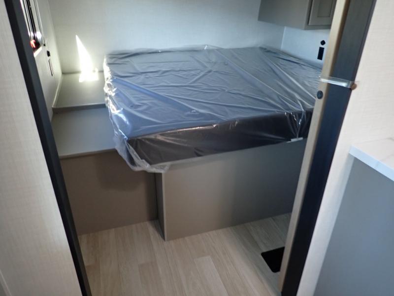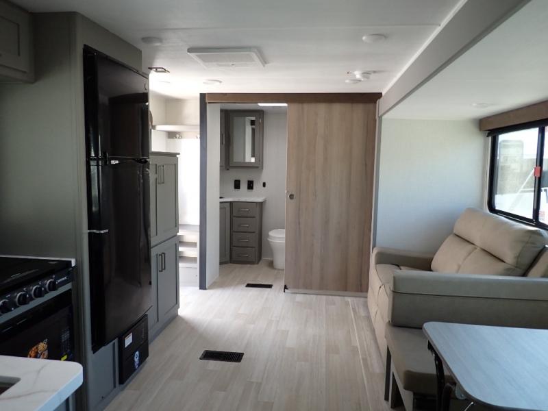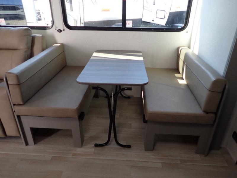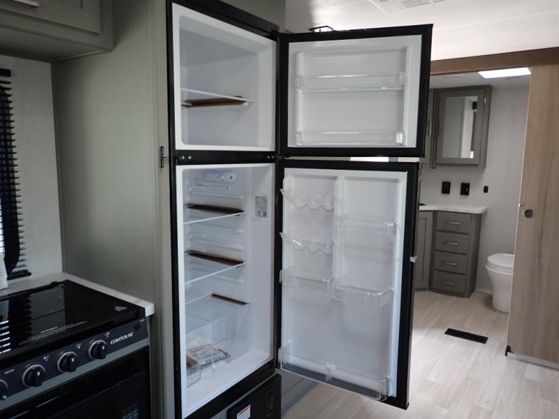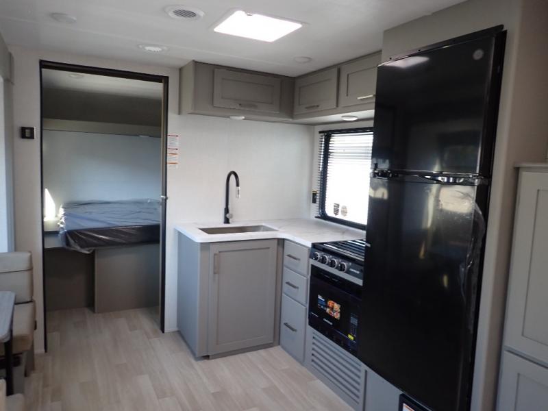 You'll feel right at home wherever you decide to camp in this travel trailer. The large slide out in the combined kitchen and living area gives your crew plenty of space to move about, plus there is a booth dinette and sofa for comfy seating and sleeping spaces. A full kitchen, compete with three burner cooktop and 10 cu. ft. 12V refrigerator will let you cook and store food for the whole week. Head to the full rear bath that includes a spacious vanity, a shower, toilet, and linen closet for clean towels. And when you're ready to catch some zzz's, the queen bed in the front private bedroom is sure to bring comfort!