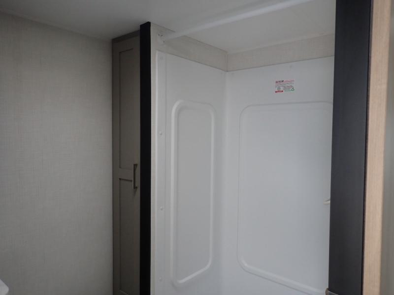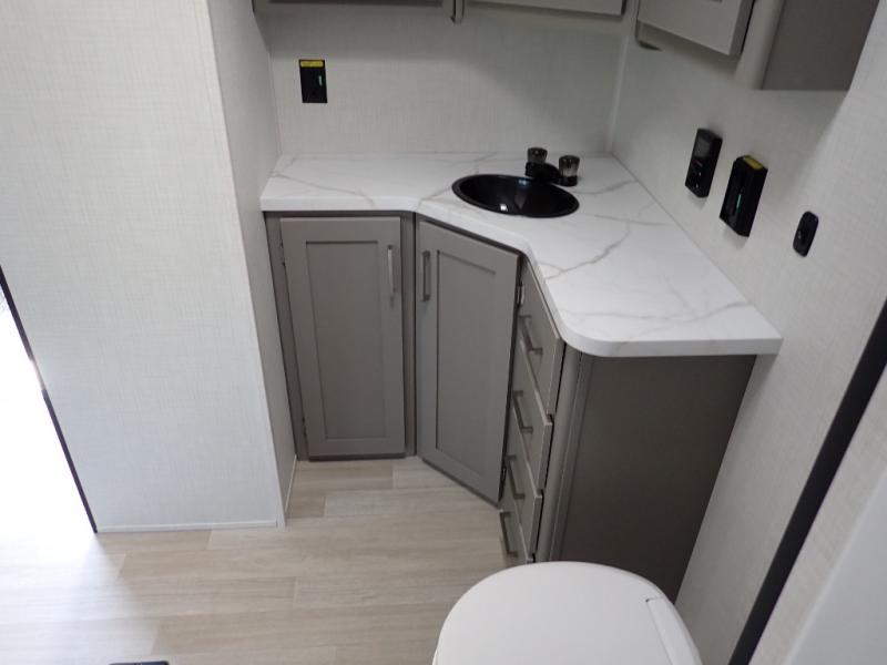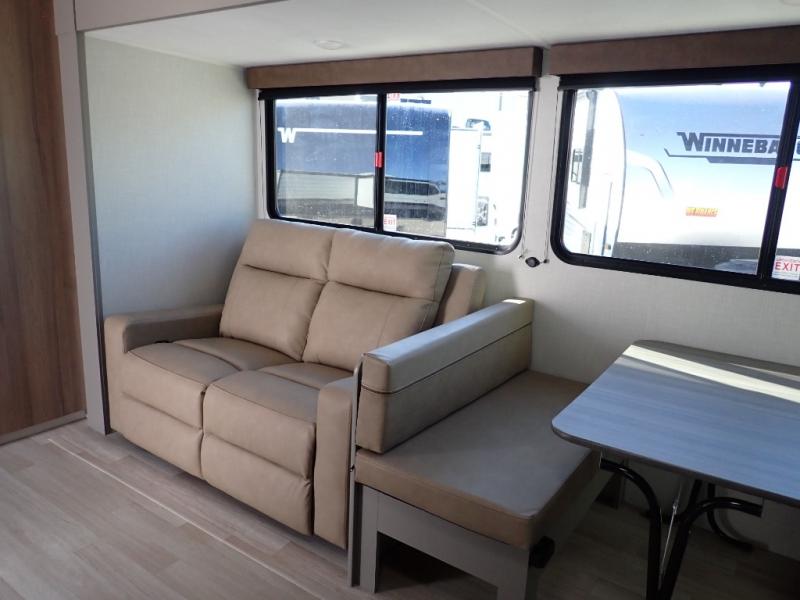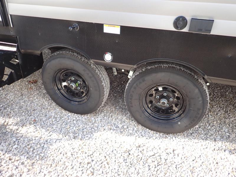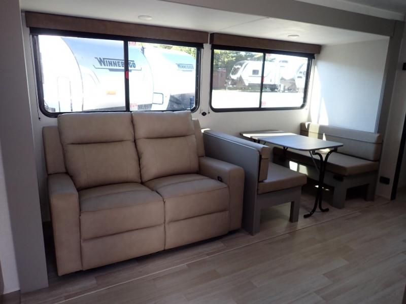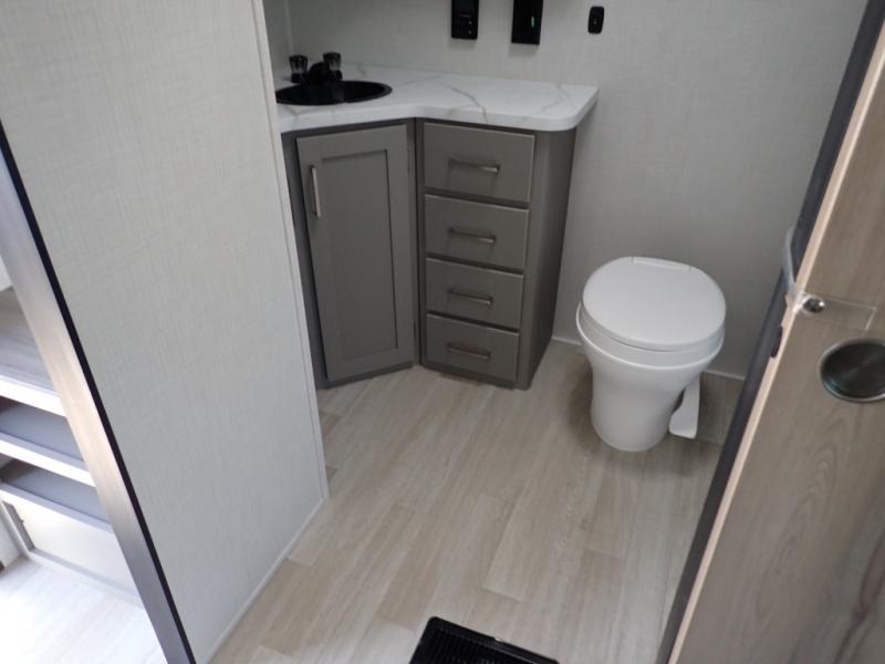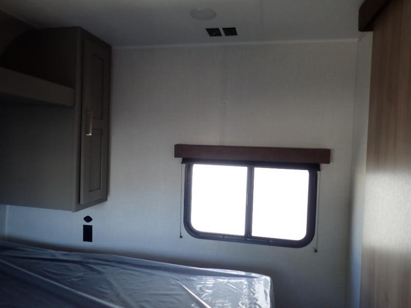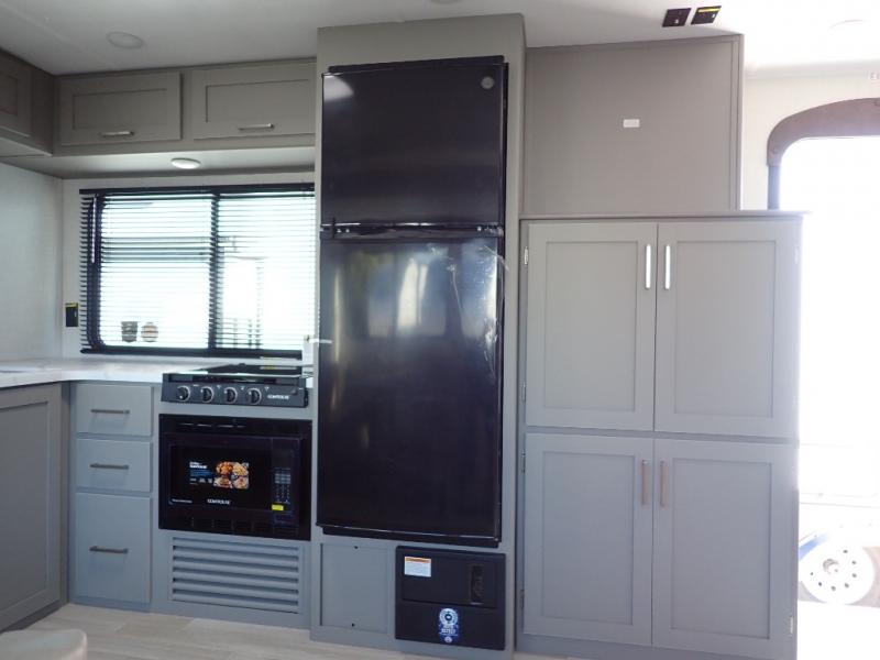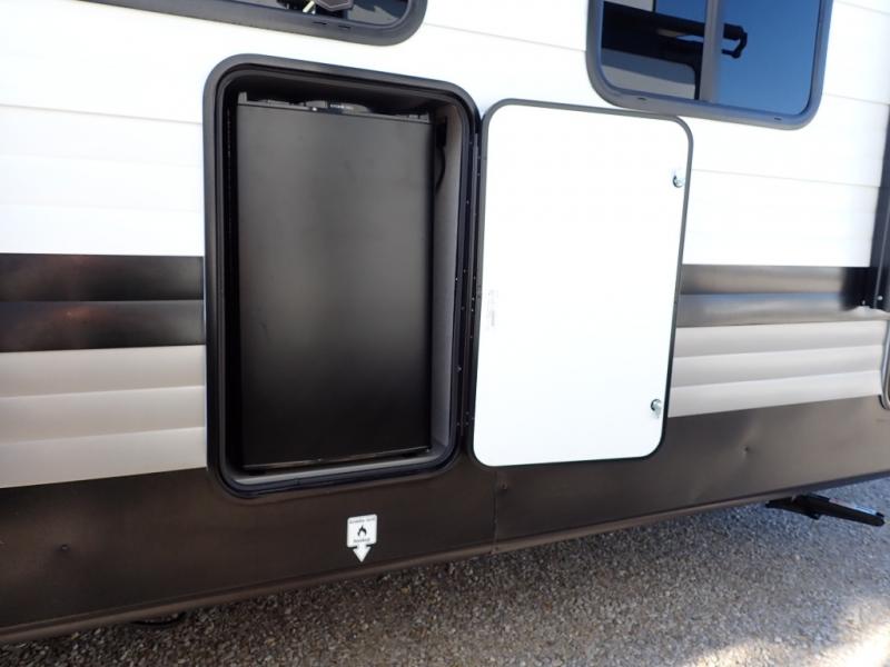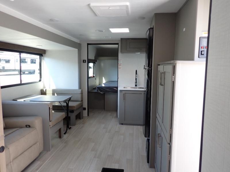 You'll feel right at home wherever you decide to camp in this travel trailer. The large slide out in the combined kitchen and living area gives your crew plenty of space to move about, plus there is a booth dinette and sofa for comfy seating and sleeping spaces. A full kitchen, compete with three burner cooktop and 10 cu. ft. 12V refrigerator will let you cook and store food for the whole week. Head to the full rear bath that includes a spacious vanity, a shower, toilet, and linen closet for clean towels. And when you're ready to catch some zzz's, the queen bed in the front private bedroom is sure to bring comfort!