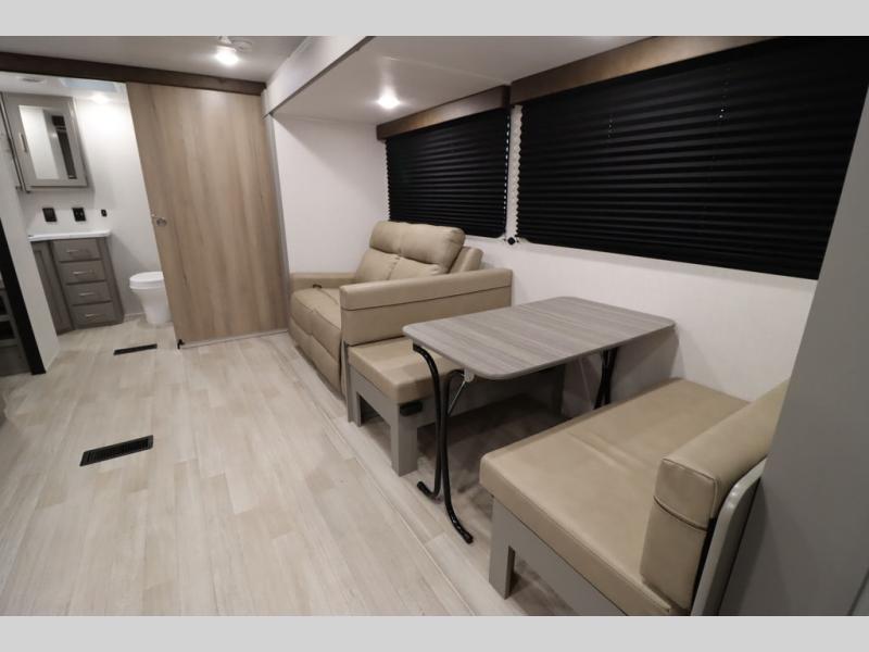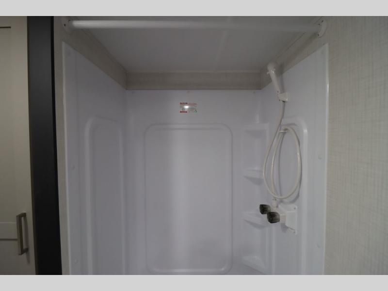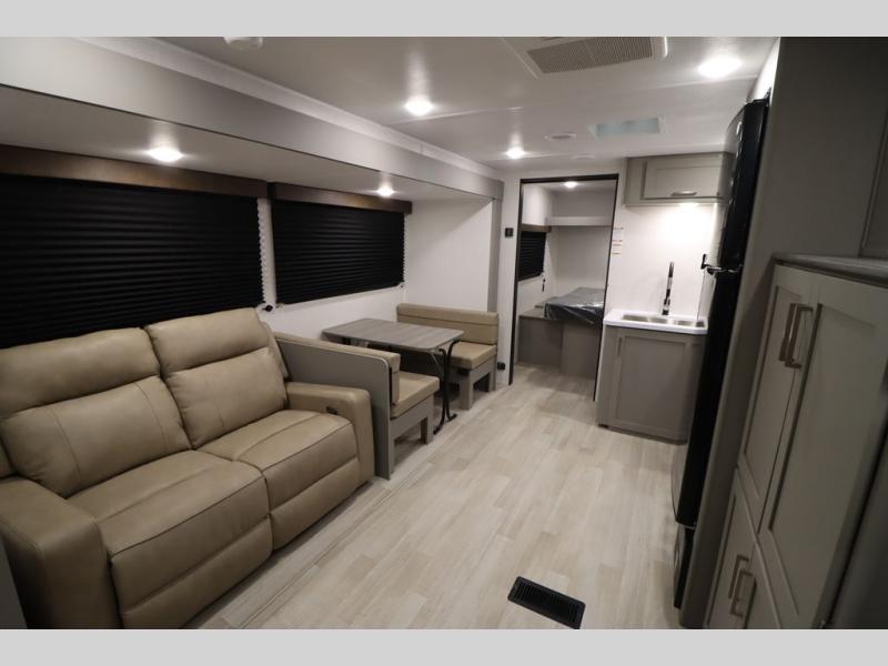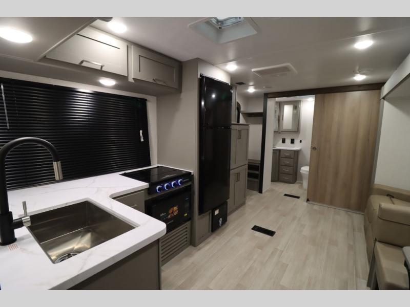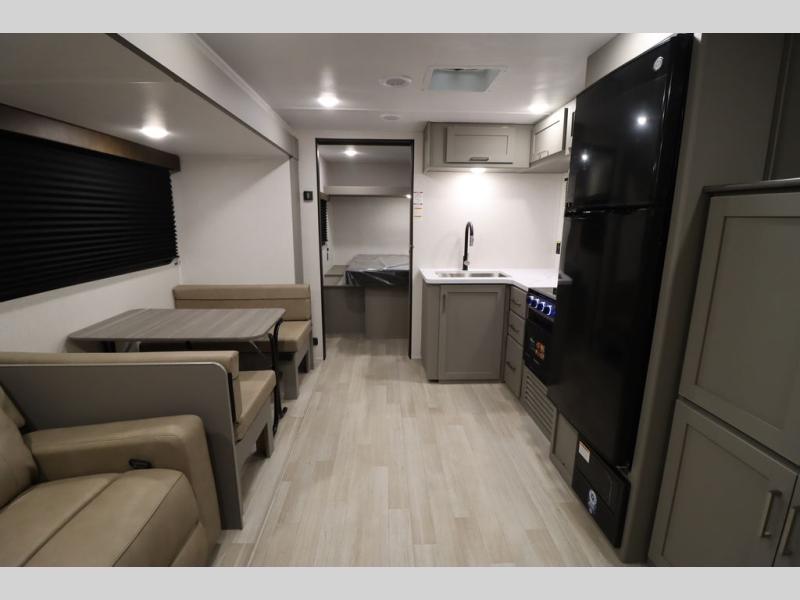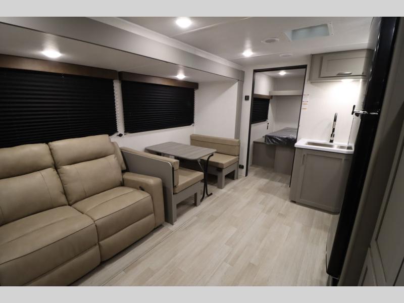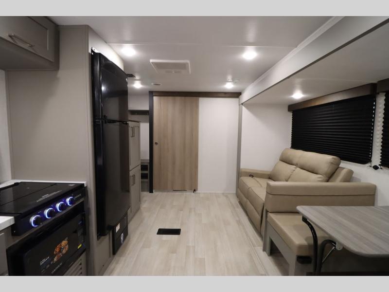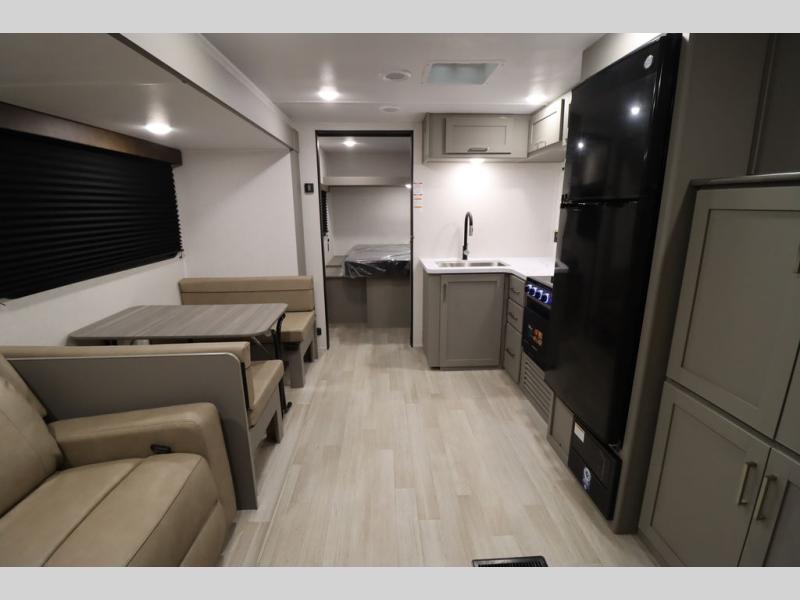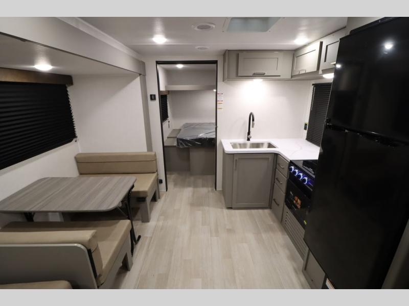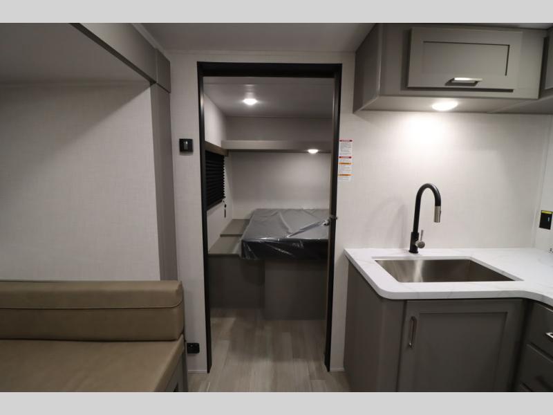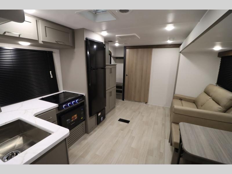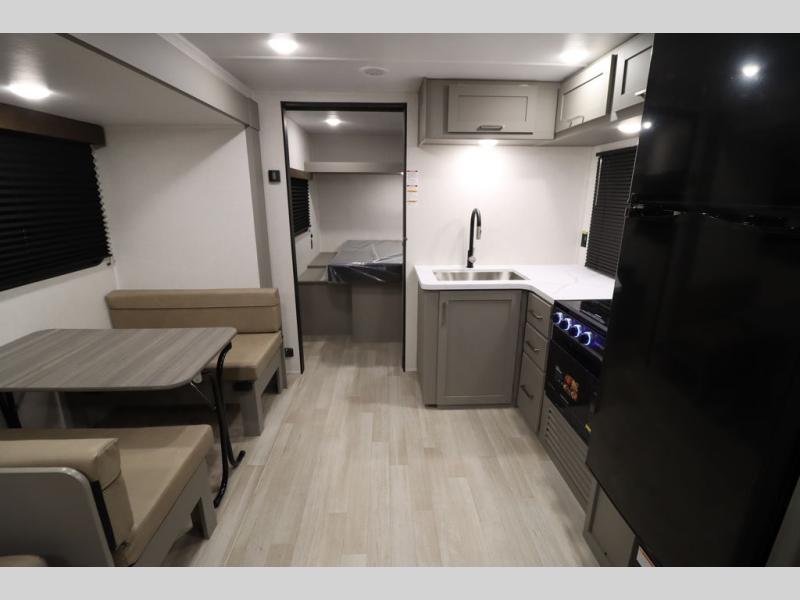 You'll feel right at home wherever you decide to camp in this travel trailer. The large slide out in the combined kitchen and living area gives your crew plenty of space to move about, plus there is a booth dinette and sofa for comfy seating and sleeping spaces. A full kitchen, compete with three burner cooktop and 10 cu. ft. 12V refrigerator will let you cook and store food for the whole week. Head to the full rear bath that includes a spacious vanity, a shower, toilet, and linen closet for clean towels. And when you're ready to catch some zzz's, the queen bed in the front private bedroom is sure to bring comfort!