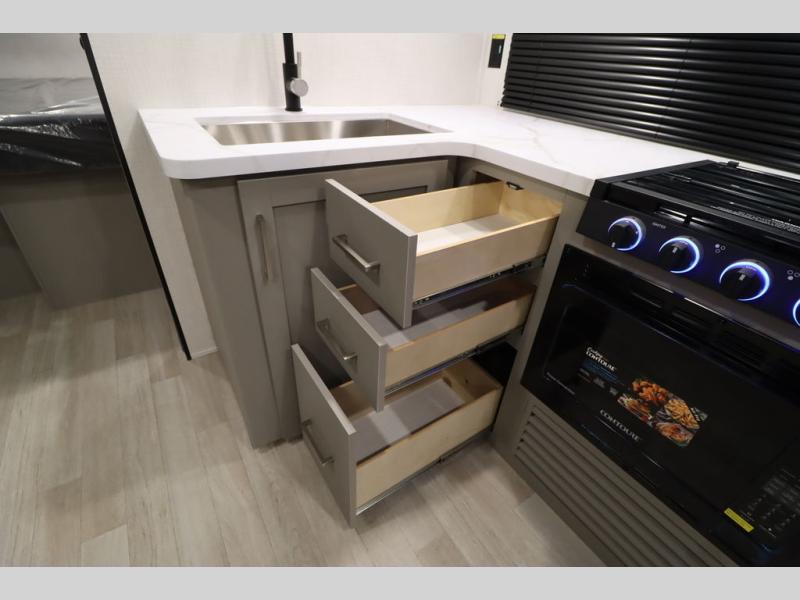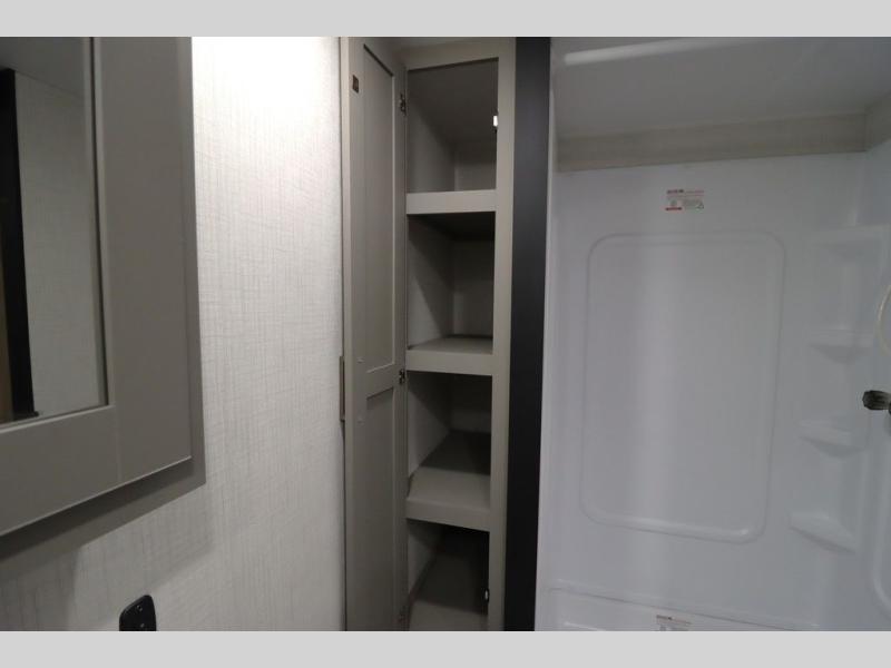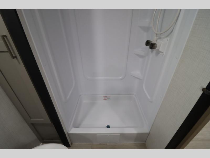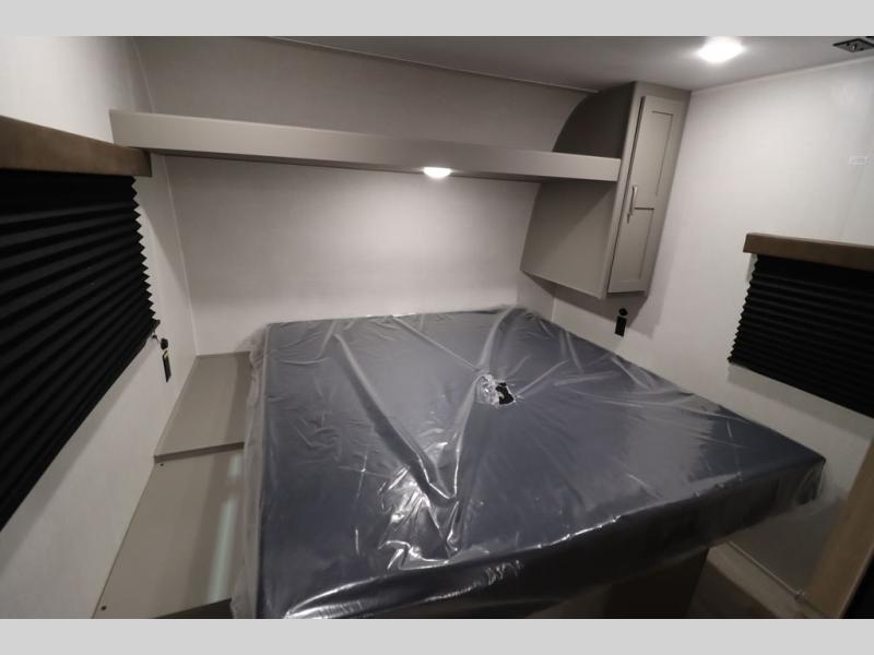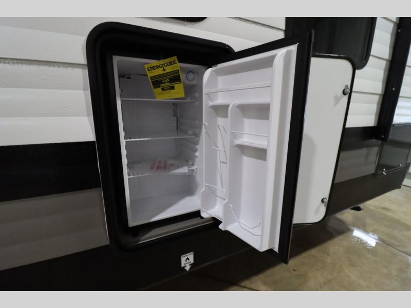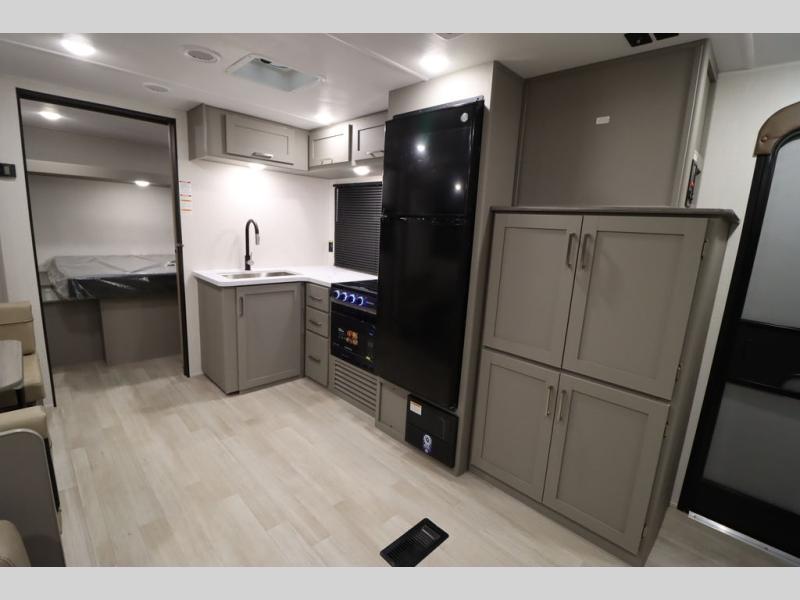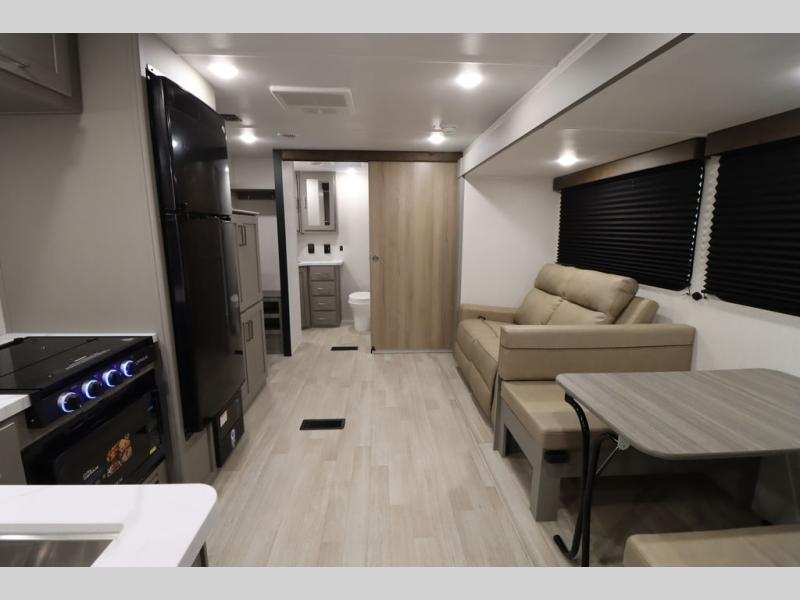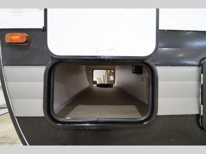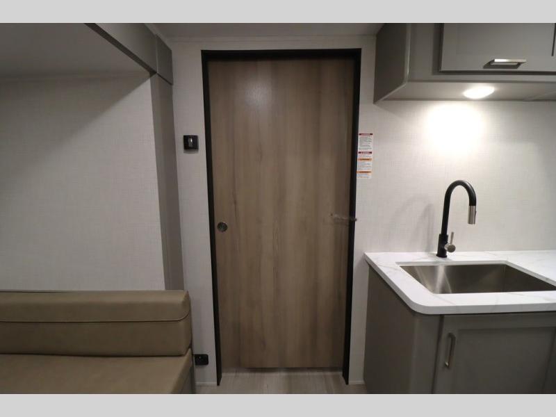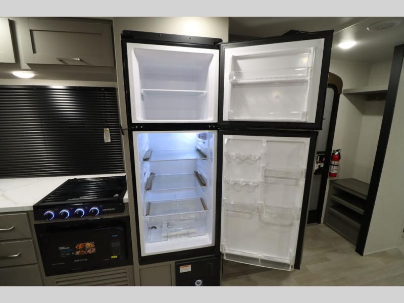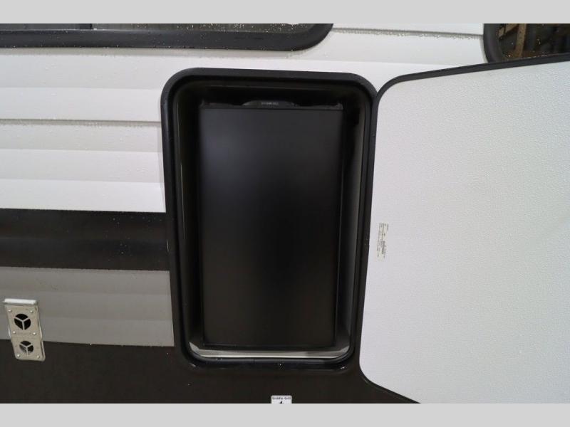 You'll feel right at home wherever you decide to camp in this travel trailer. The large slide out in the combined kitchen and living area gives your crew plenty of space to move about, plus there is a booth dinette and sofa for comfy seating and sleeping spaces. A full kitchen, compete with three burner cooktop and 10 cu. ft. 12V refrigerator will let you cook and store food for the whole week. Head to the full rear bath that includes a spacious vanity, a shower, toilet, and linen closet for clean towels. And when you're ready to catch some zzz's, the queen bed in the front private bedroom is sure to bring comfort!
