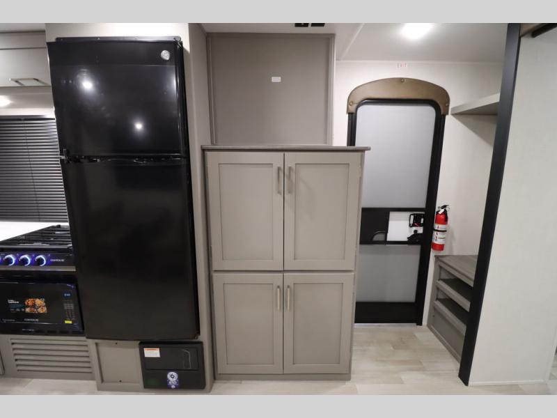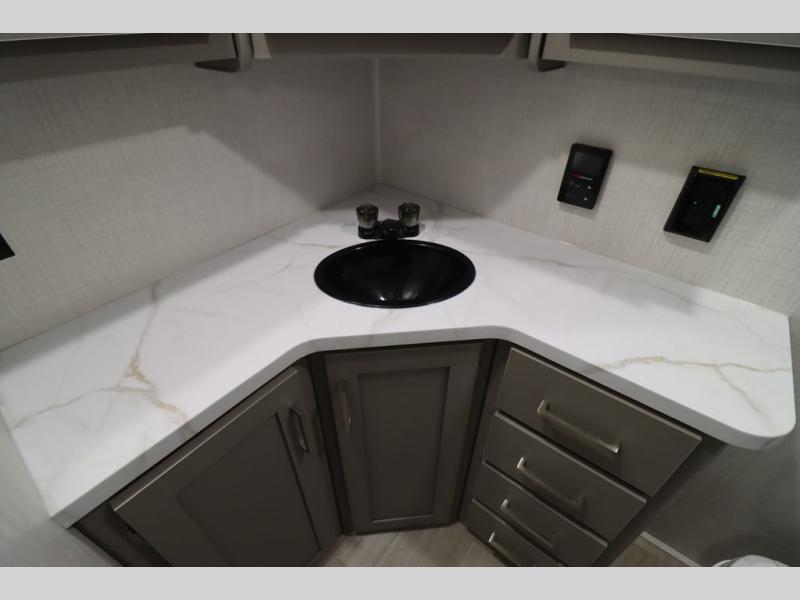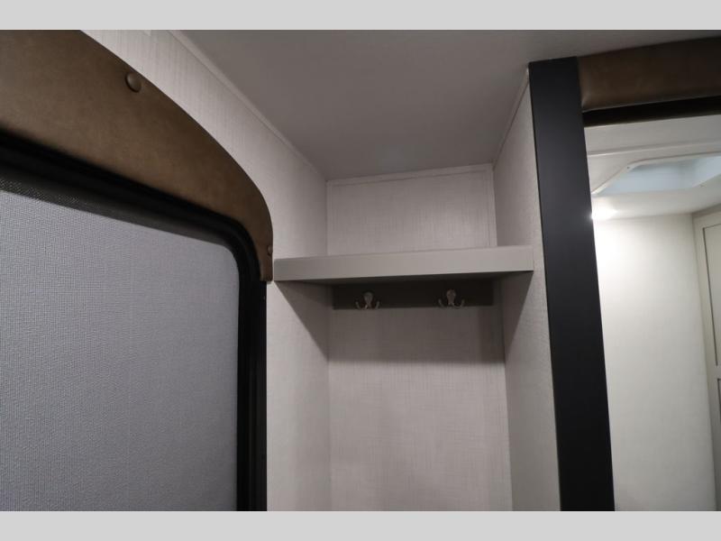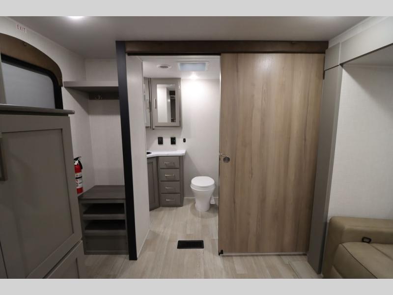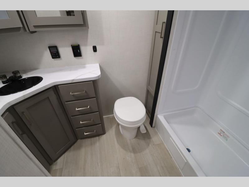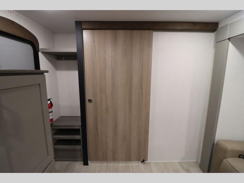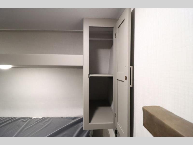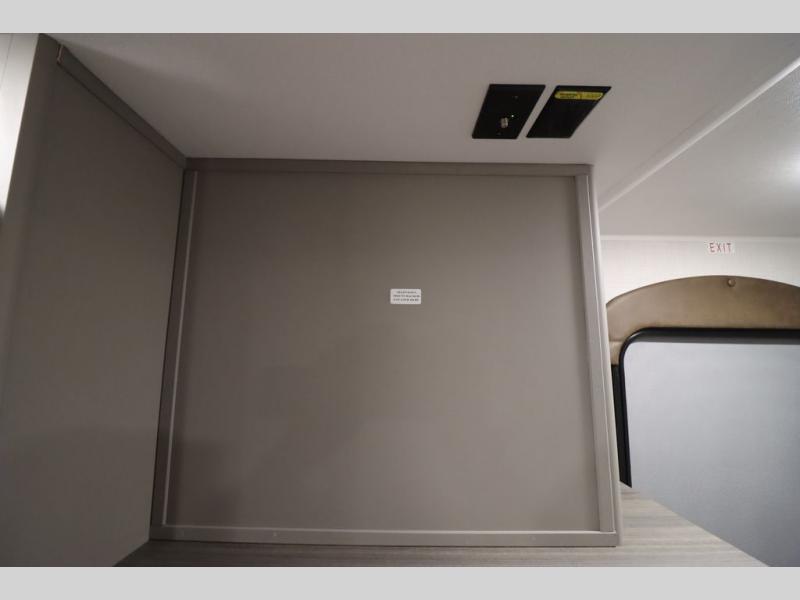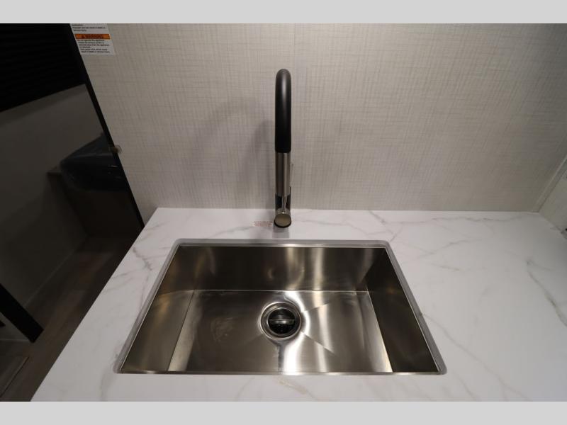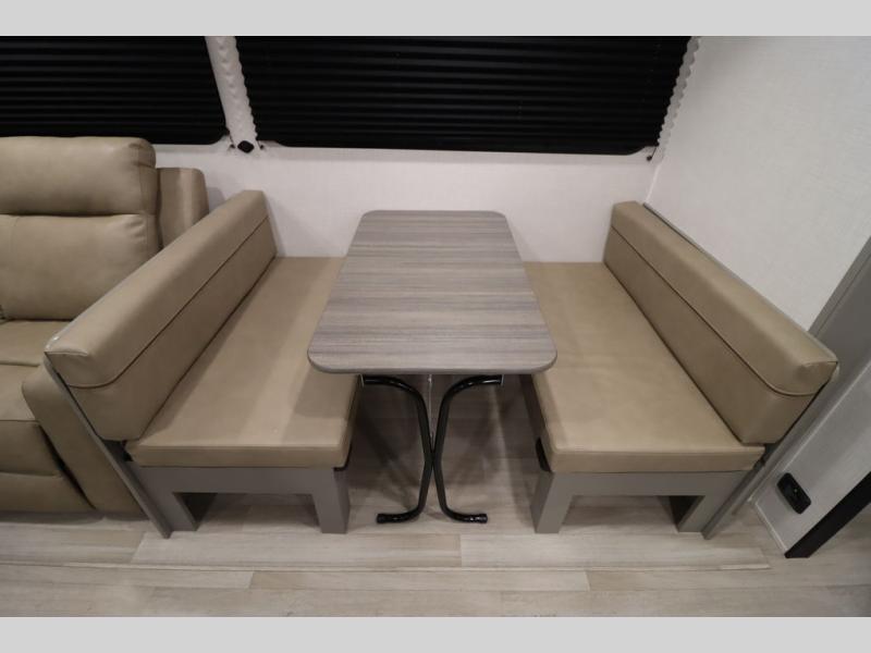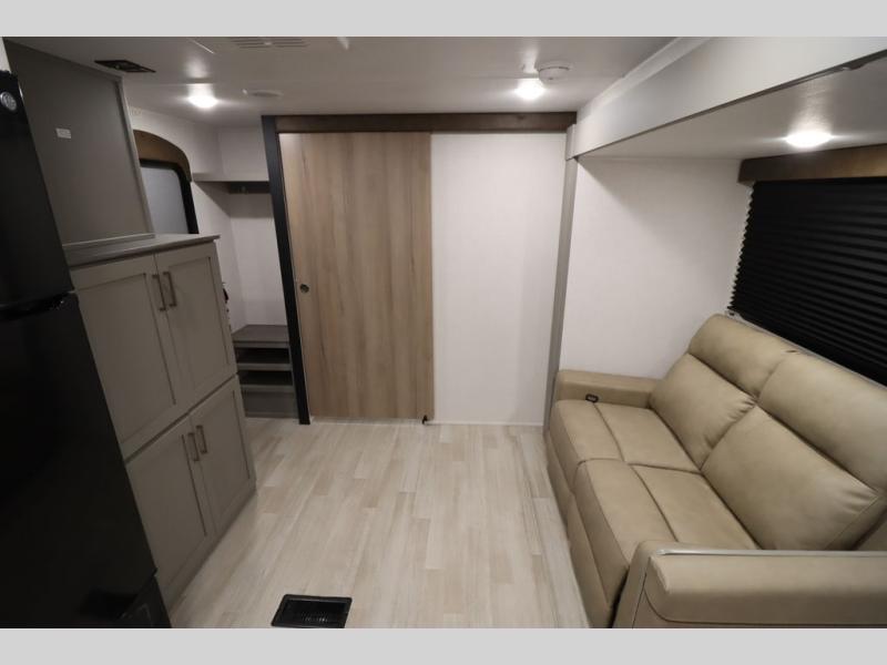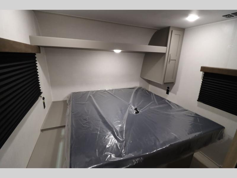 You'll feel right at home wherever you decide to camp in this travel trailer. The large slide out in the combined kitchen and living area gives your crew plenty of space to move about, plus there is a booth dinette and sofa for comfy seating and sleeping spaces. A full kitchen, compete with three burner cooktop and 10 cu. ft. 12V refrigerator will let you cook and store food for the whole week. Head to the full rear bath that includes a spacious vanity, a shower, toilet, and linen closet for clean towels. And when you're ready to catch some zzz's, the queen bed in the front private bedroom is sure to bring comfort!
