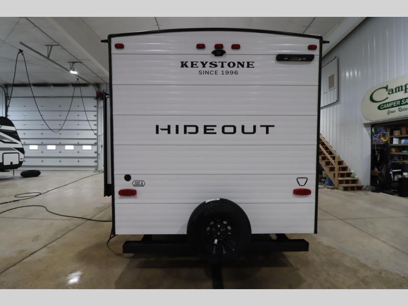 With any Hideout Sport travel trailer by Keystone you will enjoy simplified camping solutions that won't break the bank! Each model is constructed with a durable AlphaPly TPO roof membrane tinted safety glass windows, and an I-beam frame. There are power tongue jacks and heavy duty stabilizer jacks that will make it easier than ever to hitch up and go. An XL entry assist handle will also provide convenience, along with a power awning that will provide much wanted shade during the day. You will feel right at home inside with stylish decor, blackout night shades, and cozy bed with storage underneath!