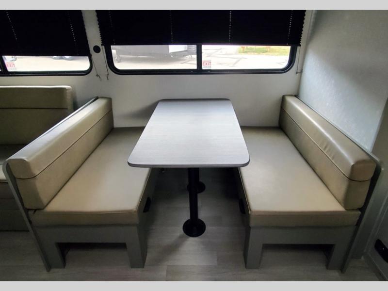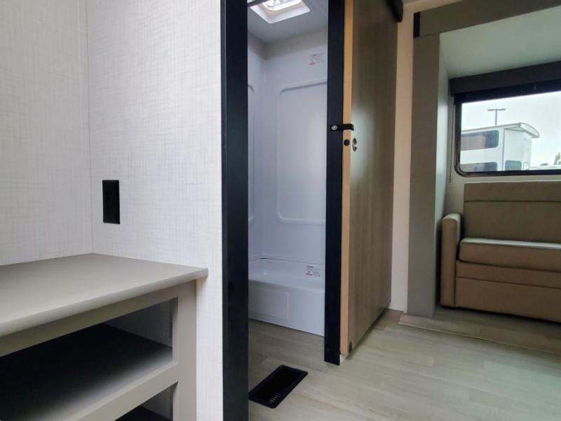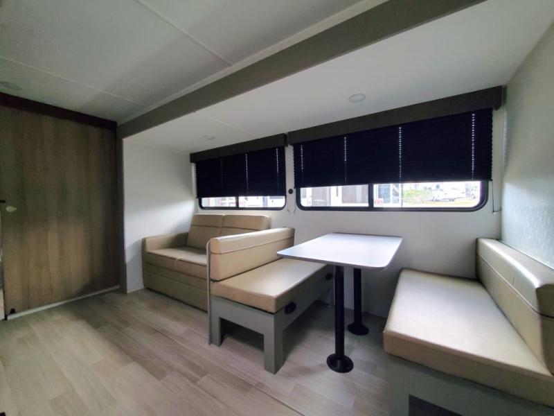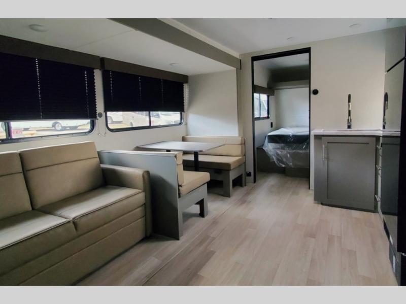 You'll feel right at home wherever you decide to camp in this travel trailer. The large slide out in the combined kitchen and living area gives your crew plenty of space to move about, plus there is a booth dinette and sofa for comfy seating and sleeping spaces. A full kitchen, compete with three burner cooktop and 10 cu. ft. 12V refrigerator will let you cook and store food for the whole week. Head to the full rear bath that includes a spacious vanity, a shower, toilet, and linen closet for clean towels. And when you're ready to catch some zzz's, the queen bed in the front private bedroom is sure to bring comfort!