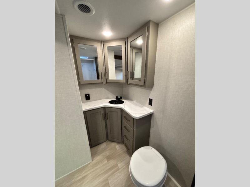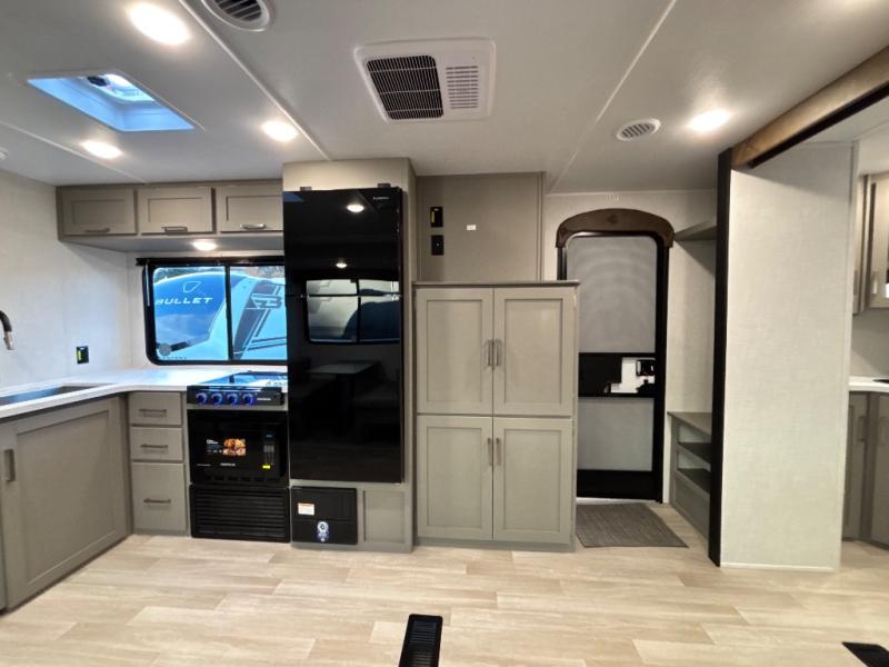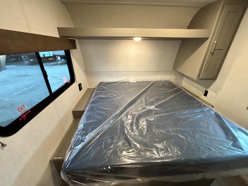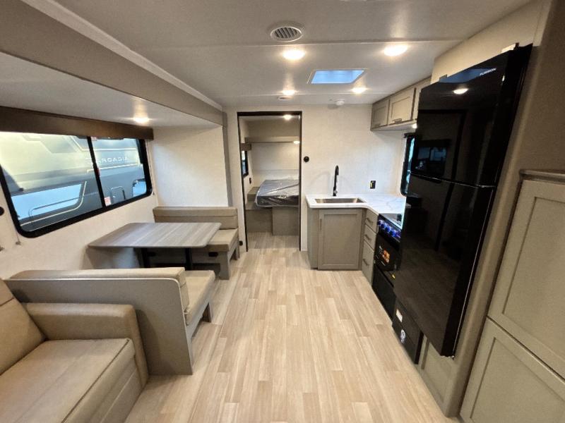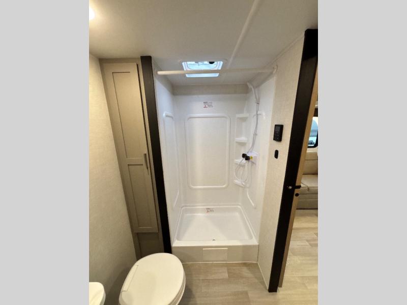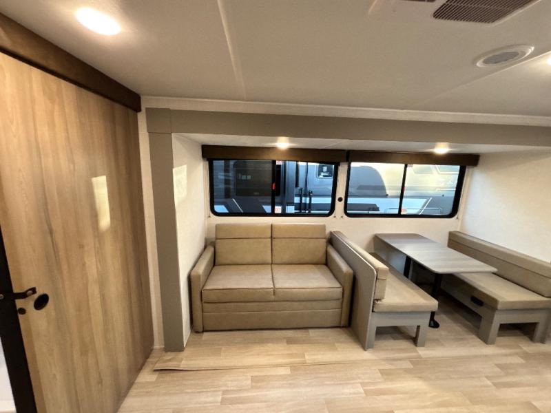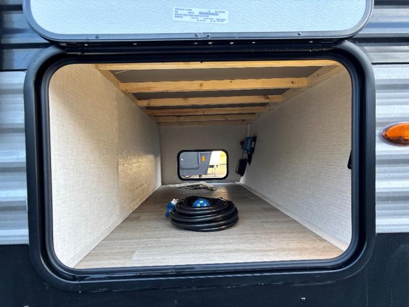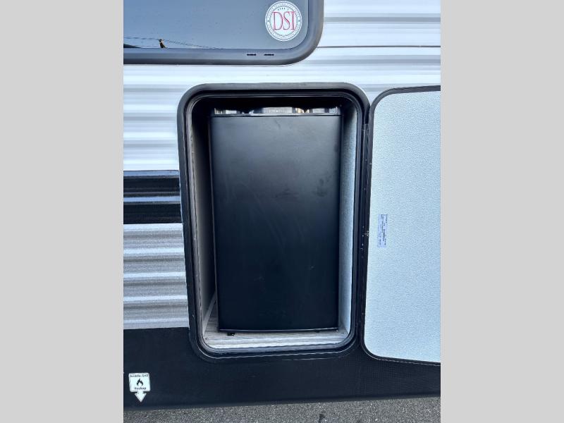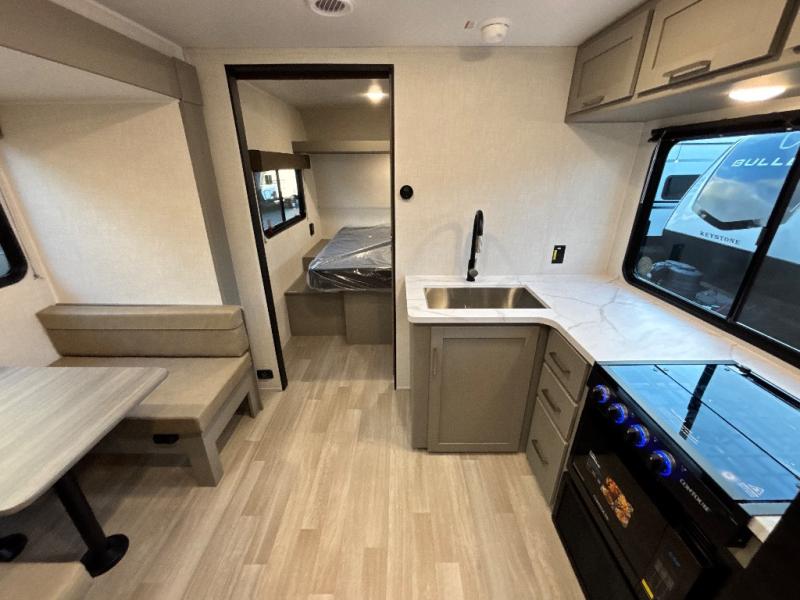 You'll feel right at home wherever you decide to camp in this travel trailer. The large slide out in the combined kitchen and living area gives your crew plenty of space to move about, plus there is a booth dinette and sofa for comfy seating and sleeping spaces. A full kitchen, compete with three burner cooktop and 10 cu. ft. 12V refrigerator will let you cook and store food for the whole week. Head to the full rear bath that includes a spacious vanity, a shower, toilet, and linen closet for clean towels. And when you're ready to catch some zzz's, the queen bed in the front private bedroom is sure to bring comfort!