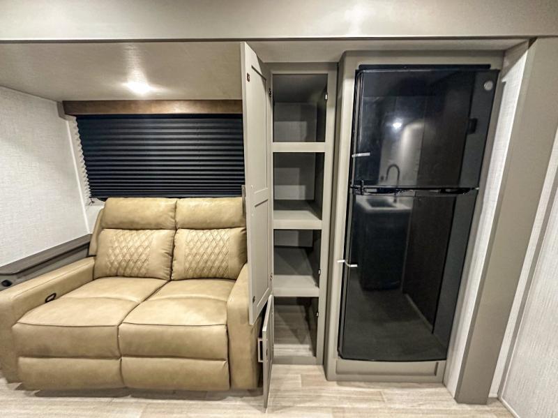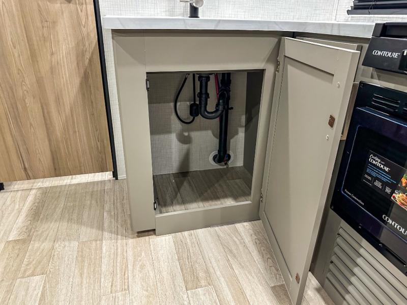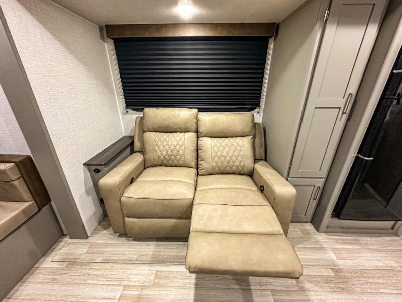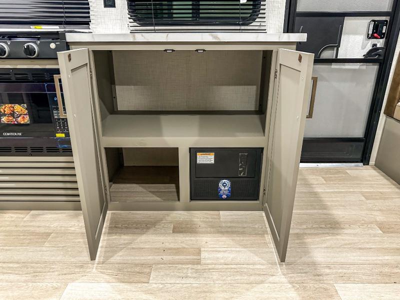 Trips to the lake just got easier in this dual entry travel trailer. You can enter in through the rear living area or the front master bedroom, and a queen bed will be calling your name after a tiring day. Don't forget to clean up in the walk-through bath before heading to bed! The chef of your group can make breakfast on the three burner gas cooktop, while the others set plates around the rear U-shaped dinette. There is also a sofa slide out for additional seating spaces, and both of these pieces of furniture will double as your guests' sleeping space at night. After breakfast is cleaned up, grab your fishing poles from the exterior pass-thru storage and head down to the water!