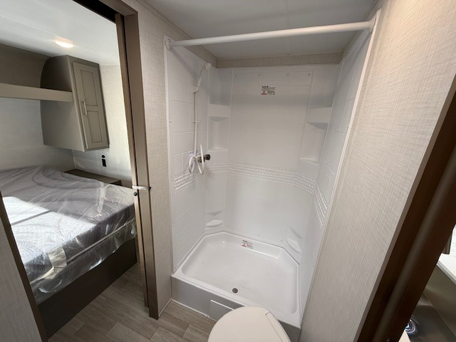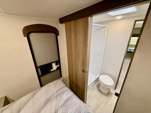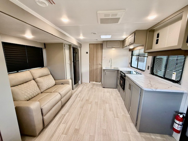 Trips to the lake just got easier in this dual entry travel trailer. You can enter in through the rear living area or the front master bedroom, and a queen bed will be calling your name after a tiring day. Don't forget to clean up in the walk-through bath before heading to bed! The chef of your group can make breakfast on the three burner gas cooktop, while the others set plates around the rear U-shaped dinette. There is also a sofa slide out for additional seating spaces, and both of these pieces of furniture will double as your guests' sleeping space at night. After breakfast is cleaned up, grab your fishing poles from the exterior pass-thru storage and head down to the water!