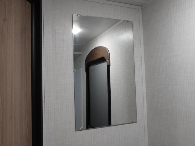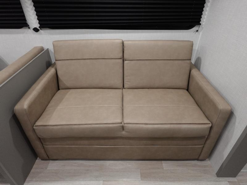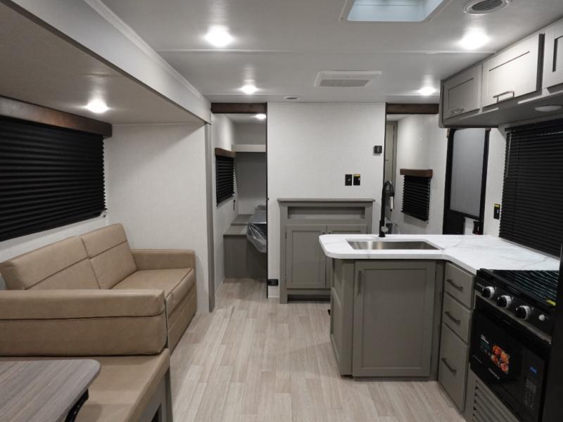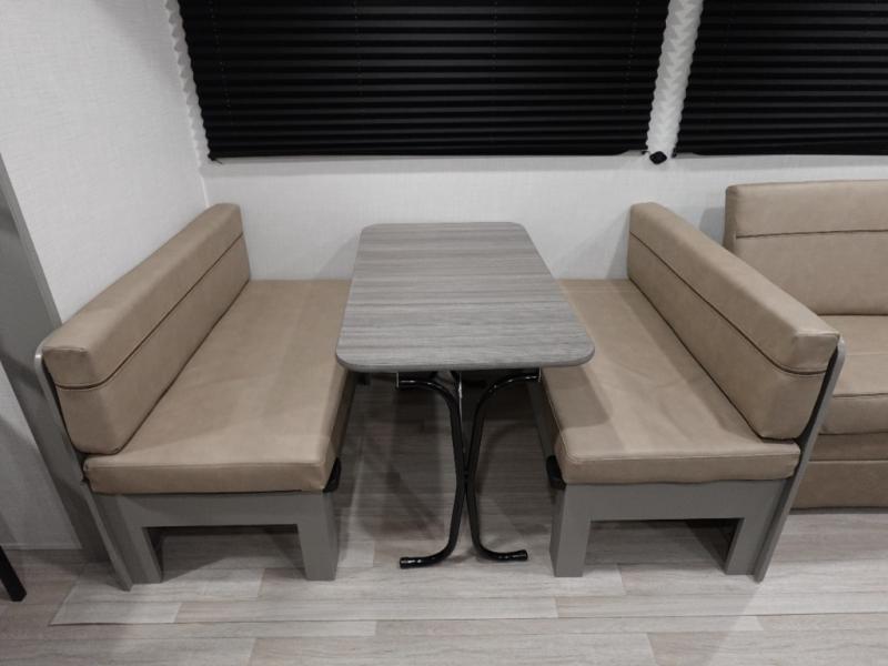 Pack your bags and head for the lake or woods in this spacious trailer! You can comfortably sleep nine to ten with the double-size bunks and the queen bed in the front private bedroom, plus the booth dinette and sofa in the main living area. There is even TV prep here if you want to add a television to the entertainment center for movie nights. The kitchen includes a 10 cu. ft. 12V refrigerator and an extra large pantry for food storage, plus a cooktop to prepare meals each day. The full bath included will let you clean up after a day of exploring outdoors, and you'll find the second entry door here for convenience!