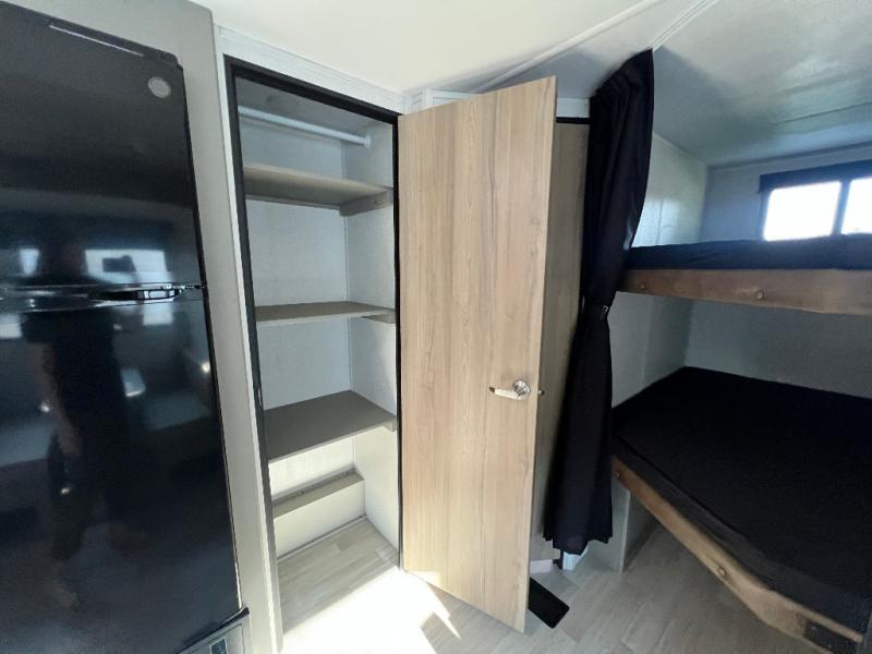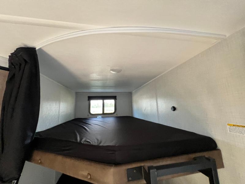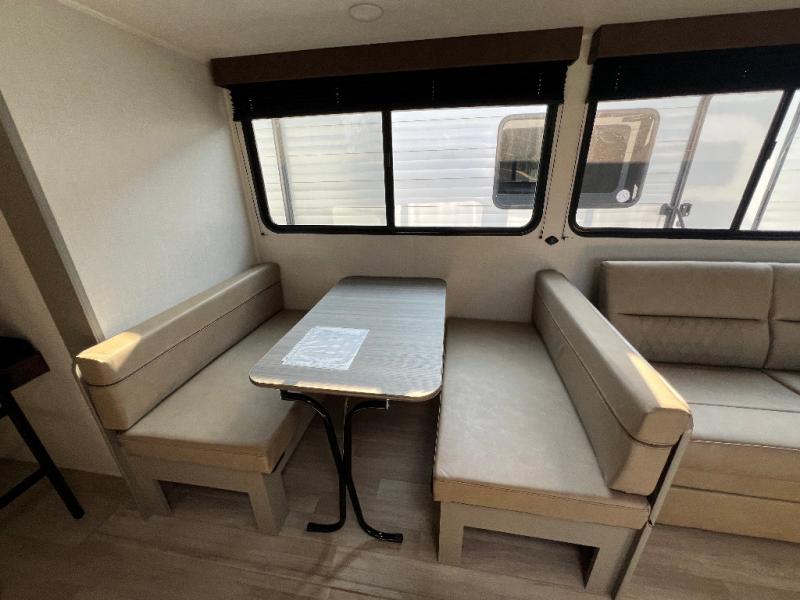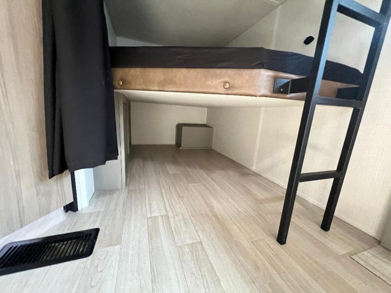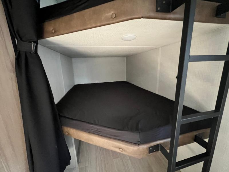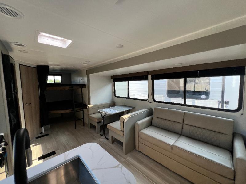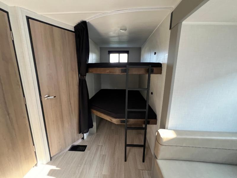 Pack your bags and head for the lake or woods in this spacious trailer! You can comfortably sleep nine to ten with the double-size bunks and the queen bed in the front private bedroom, plus the booth dinette and sofa in the main living area. There is even TV prep here if you want to add a television to the entertainment center for movie nights. The kitchen includes a 10 cu. ft. 12V refrigerator and an extra large pantry for food storage, plus a cooktop to prepare meals each day. The full bath included will let you clean up after a day of exploring outdoors, and you'll find the second entry door here for convenience!