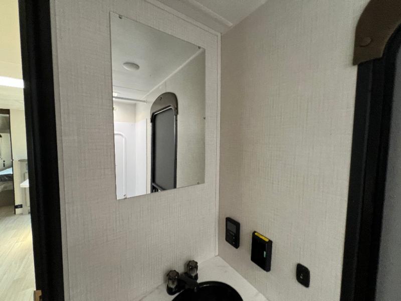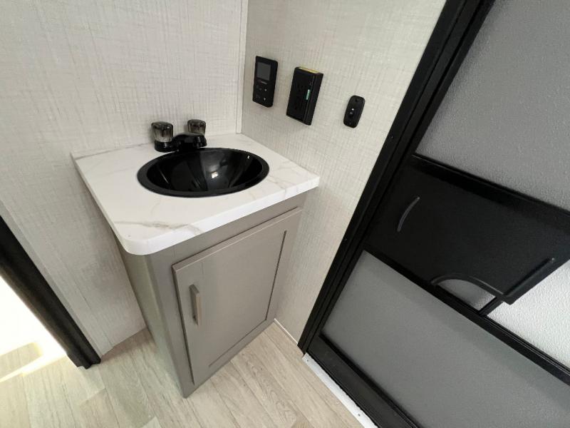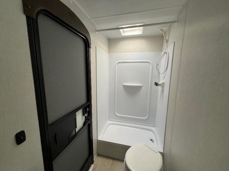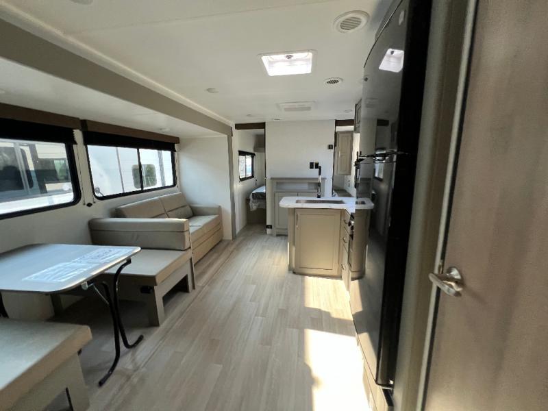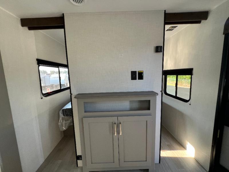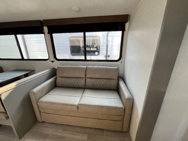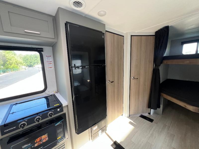 Pack your bags and head for the lake or woods in this spacious trailer! You can comfortably sleep nine to ten with the double-size bunks and the queen bed in the front private bedroom, plus the booth dinette and sofa in the main living area. There is even TV prep here if you want to add a television to the entertainment center for movie nights. The kitchen includes a 10 cu. ft. 12V refrigerator and an extra large pantry for food storage, plus a cooktop to prepare meals each day. The full bath included will let you clean up after a day of exploring outdoors, and you'll find the second entry door here for convenience!