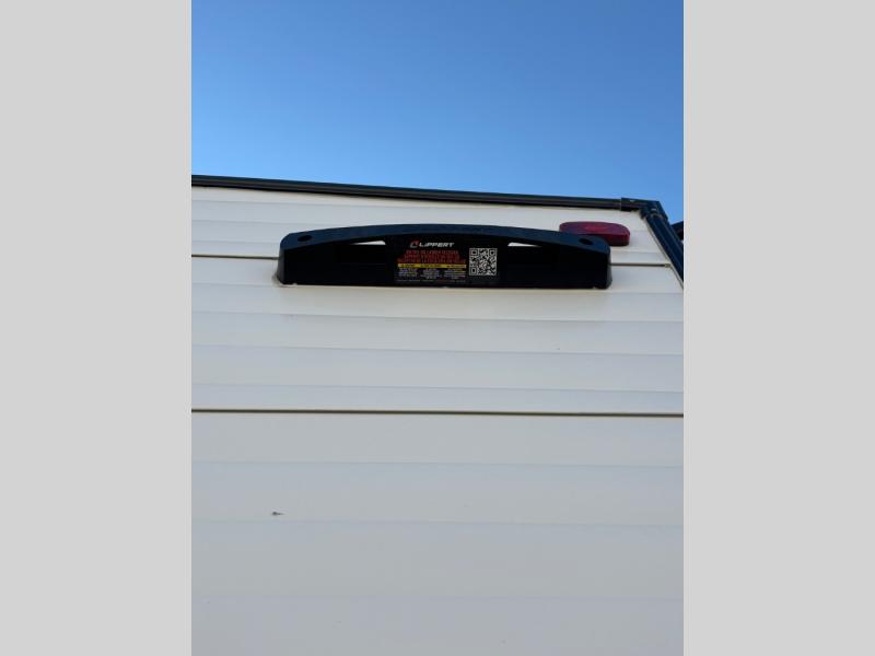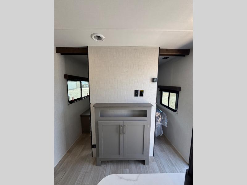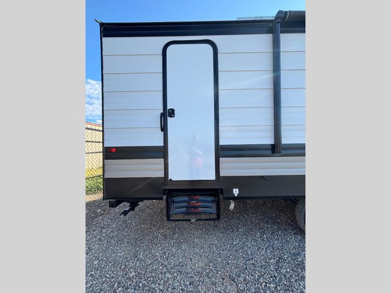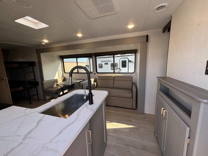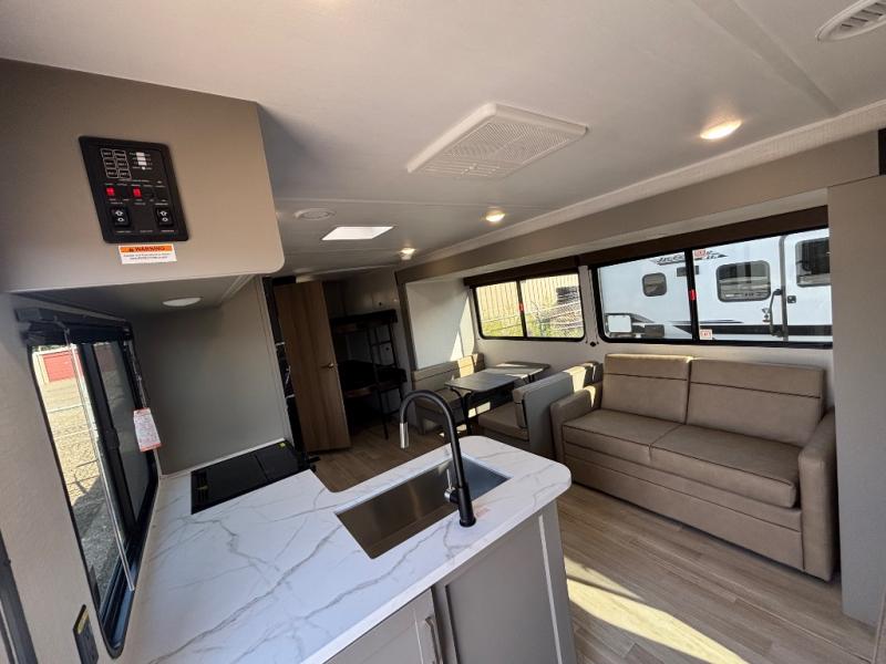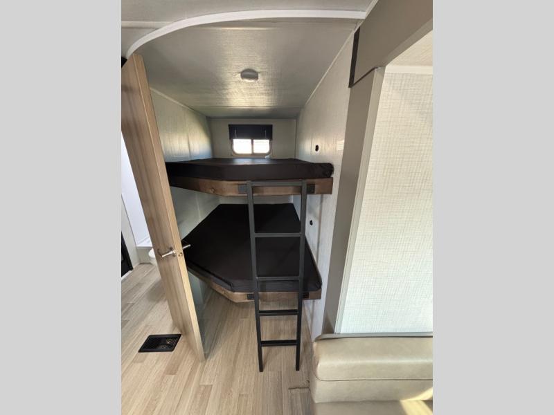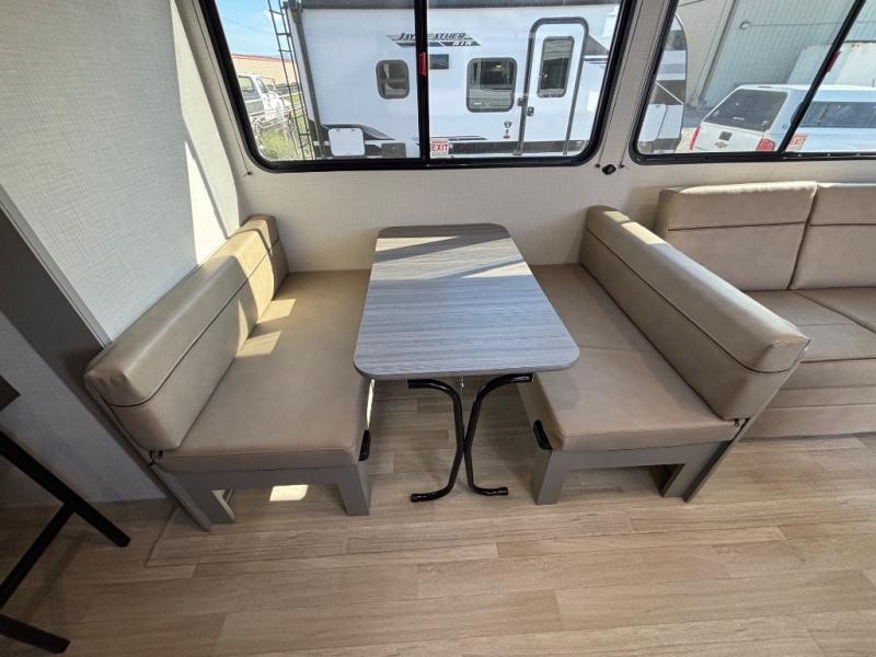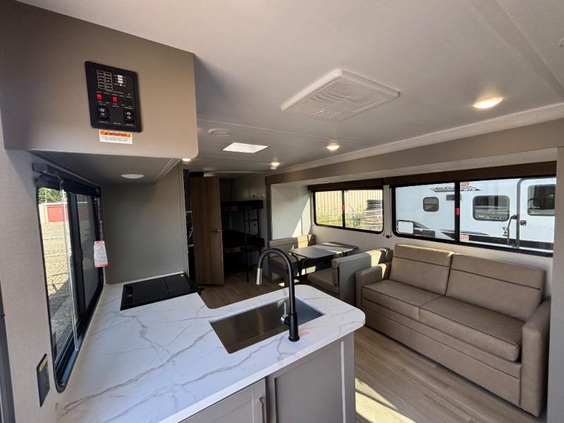 Pack your bags and head for the lake or woods in this spacious trailer! You can comfortably sleep nine to ten with the double-size bunks and the queen bed in the front private bedroom, plus the booth dinette and sofa in the main living area. There is even TV prep here if you want to add a television to the entertainment center for movie nights. The kitchen includes a 10 cu. ft. 12V refrigerator and an extra large pantry for food storage, plus a cooktop to prepare meals each day. The full bath included will let you clean up after a day of exploring outdoors, and you'll find the second entry door here for convenience!