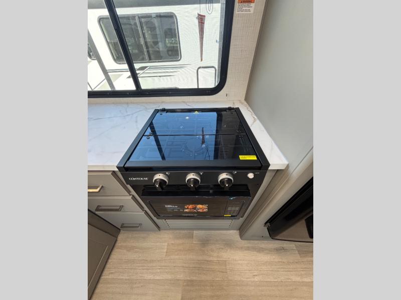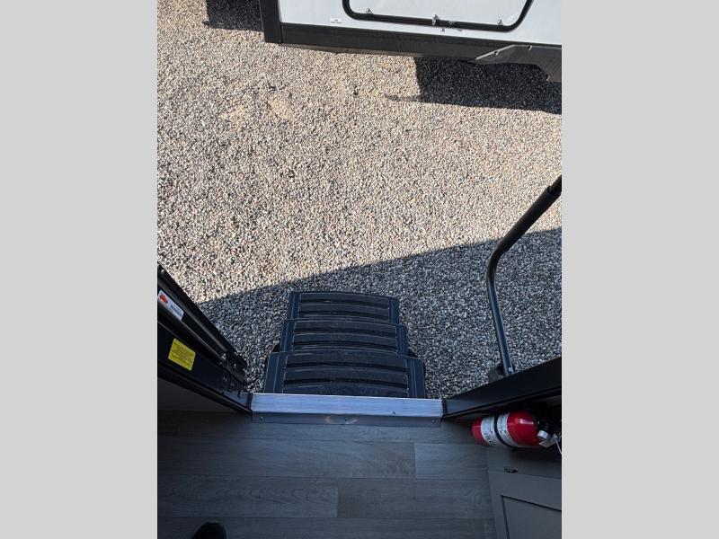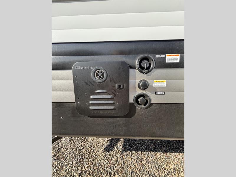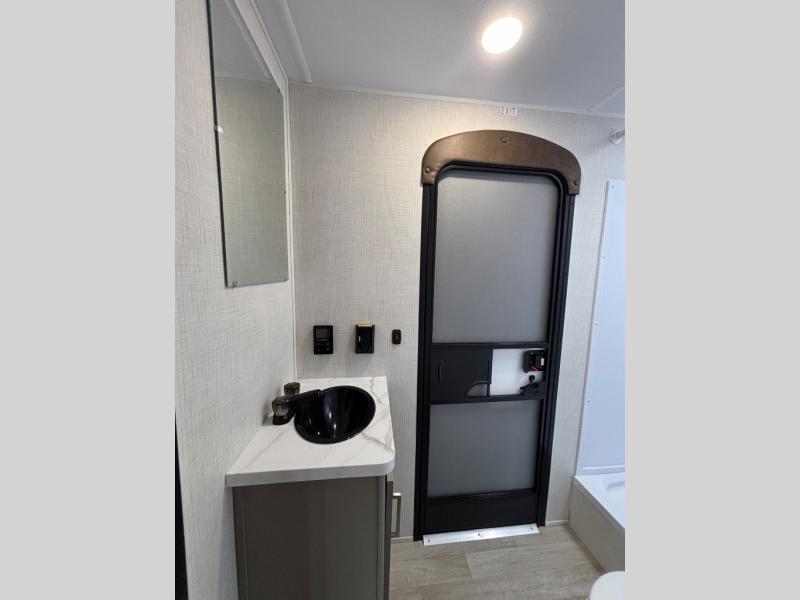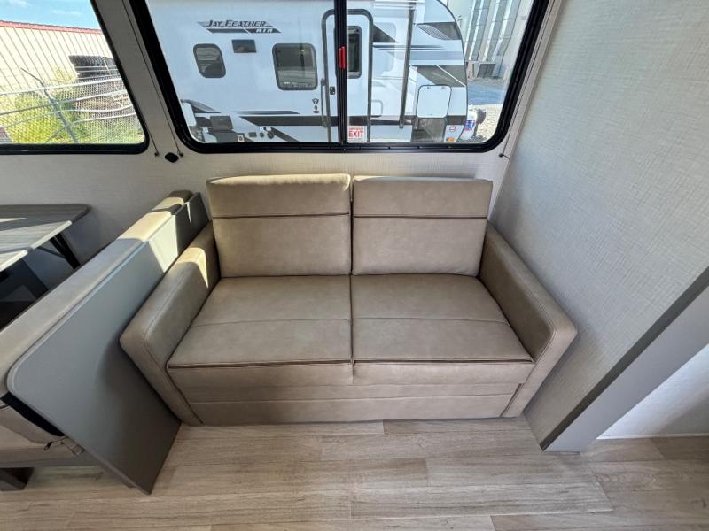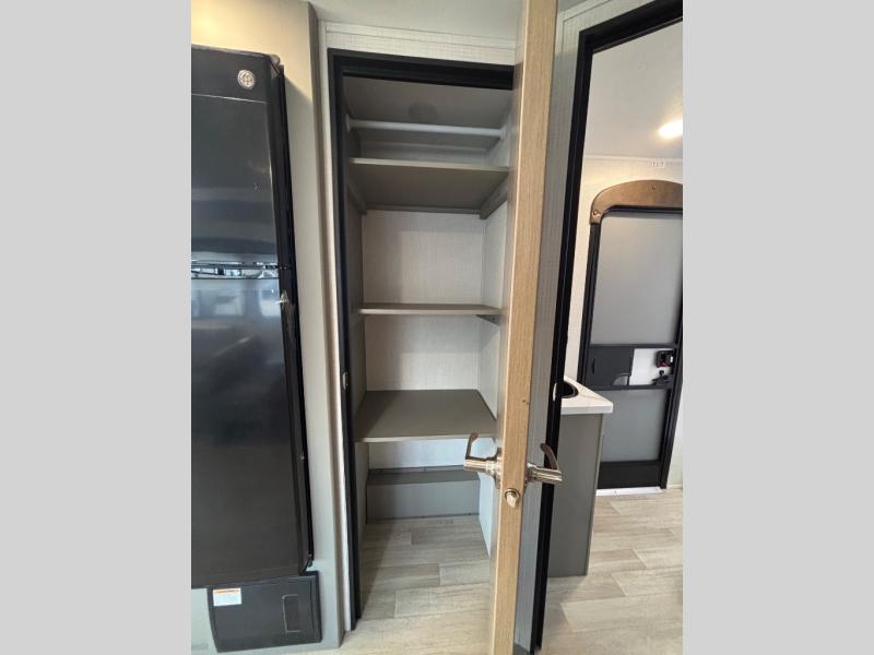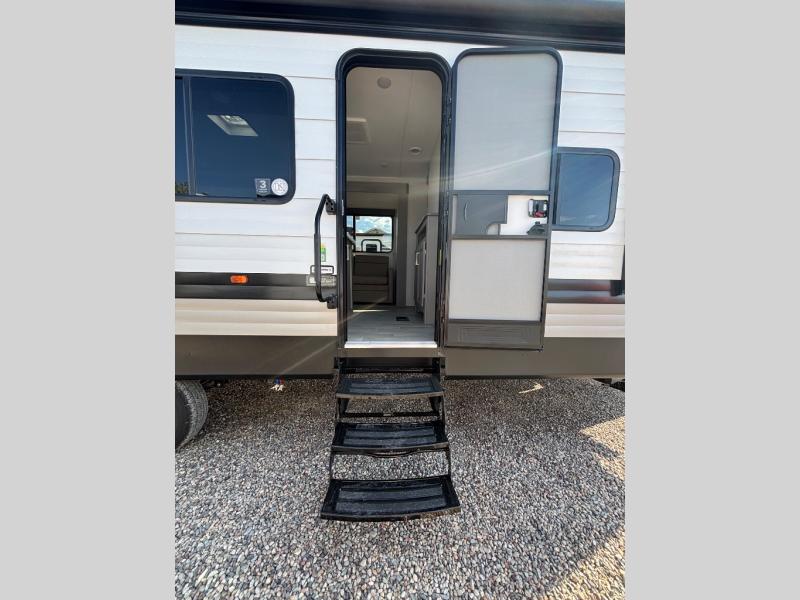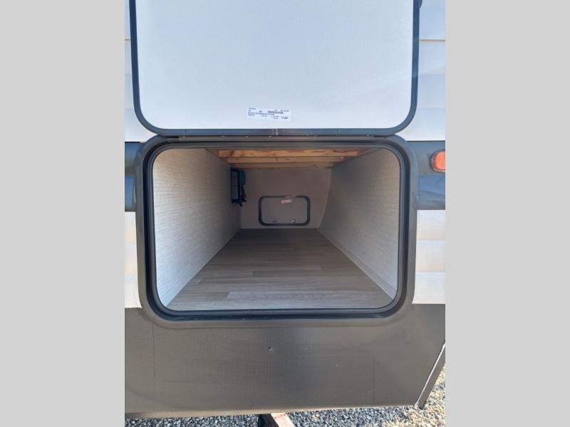Pack your bags and head for the lake or woods in this spacious trailer! You can comfortably sleep nine to ten with the double-size bunks and the queen bed in the front private bedroom, plus the booth dinette and sofa in the main living area. There is even TV prep here if you want to add a television to the entertainment center for movie nights. The kitchen includes a 10 cu. ft. 12V refrigerator and an extra large pantry for food storage, plus a cooktop to prepare meals each day. The full bath included will let you clean up after a day of exploring outdoors, and you'll find the second entry door here for convenience!