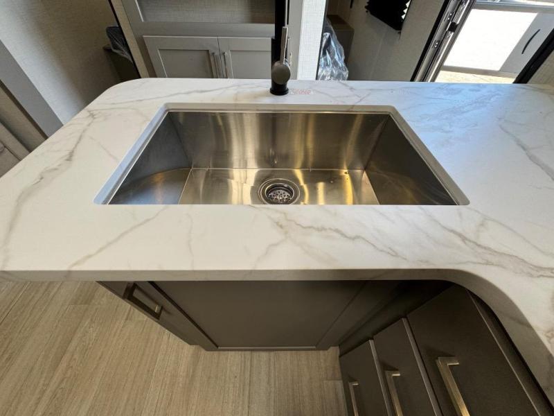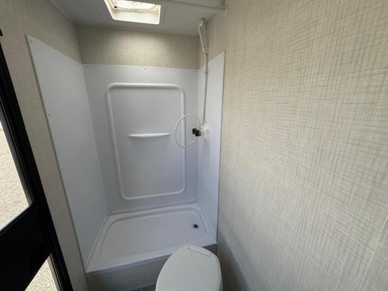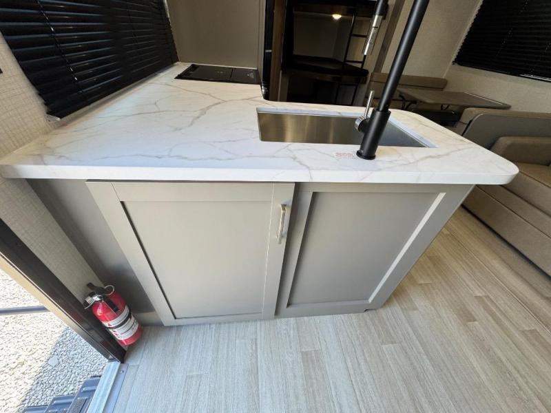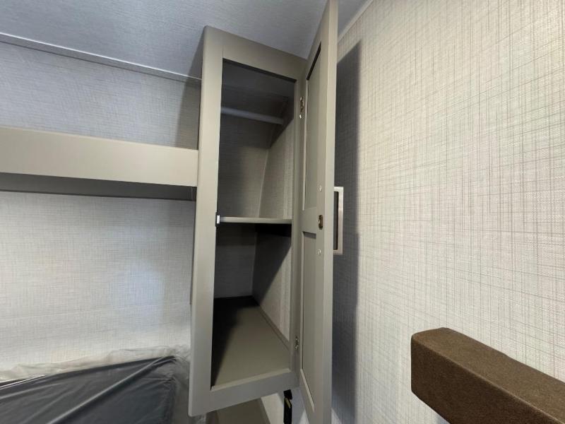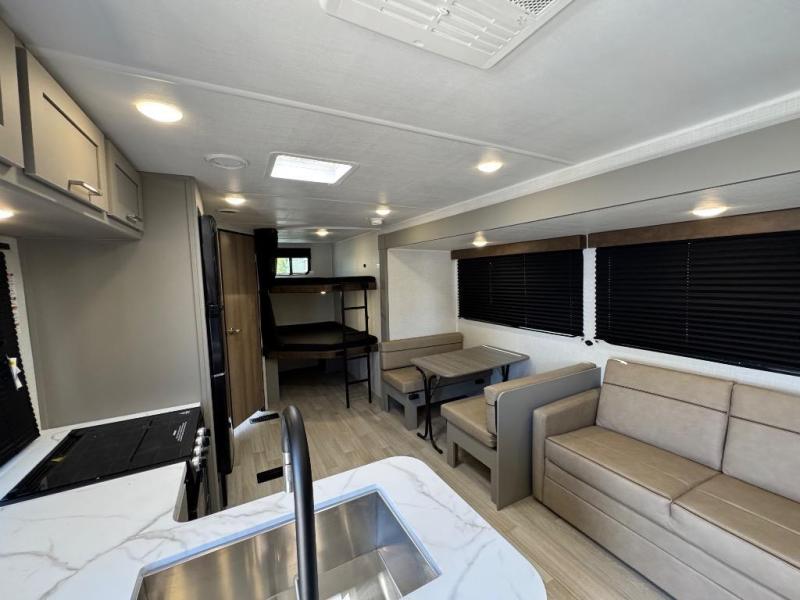 Pack your bags and head for the lake or woods in this spacious trailer! You can comfortably sleep nine to ten with the double-size bunks and the queen bed in the front private bedroom, plus the booth dinette and sofa in the main living area. There is even TV prep here if you want to add a television to the entertainment center for movie nights. The kitchen includes a 10 cu. ft. 12V refrigerator and an extra large pantry for food storage, plus a cooktop to prepare meals each day. The full bath included will let you clean up after a day of exploring outdoors, and you'll find the second entry door here for convenience!