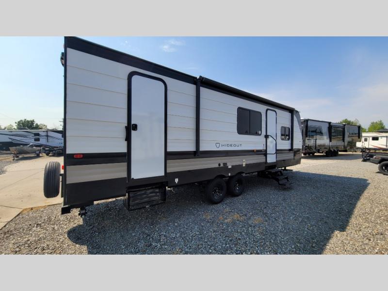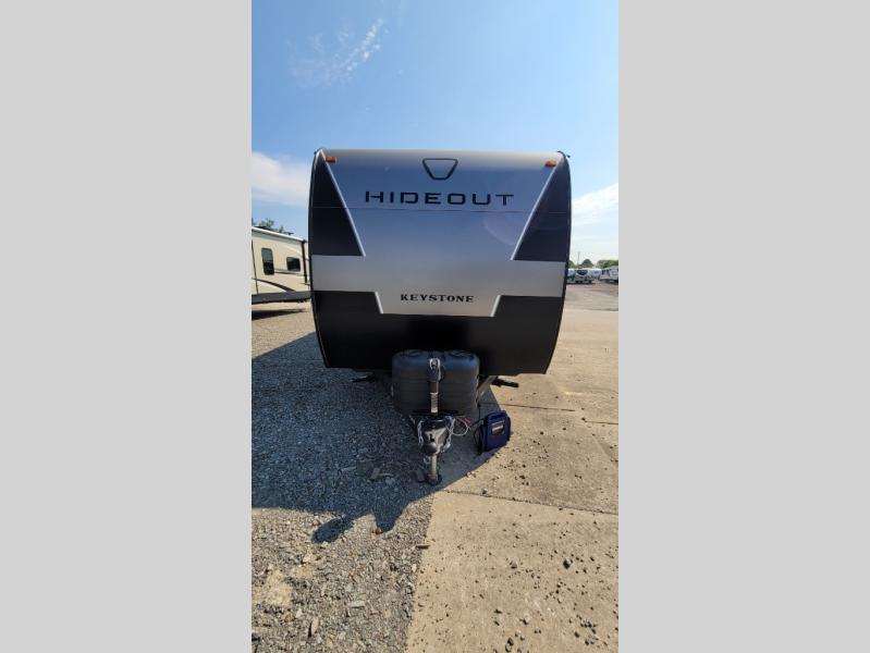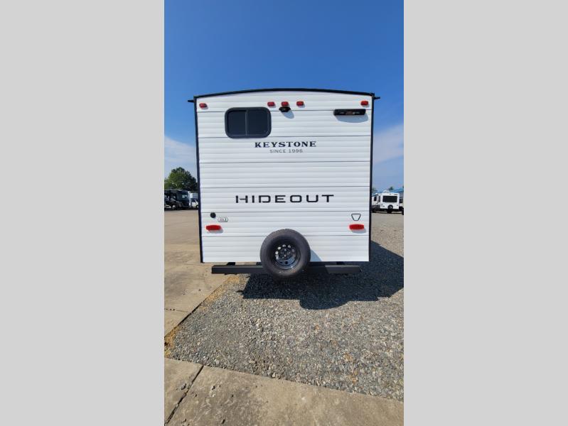 With any Hideout Sport travel trailer by Keystone you will enjoy simplified camping solutions that won't break the bank! Each model is constructed with a durable AlphaPly TPO roof membrane tinted safety glass windows, and an I-beam frame. There are power tongue jacks and heavy duty stabilizer jacks that will make it easier than ever to hitch up and go. An XL entry assist handle will also provide convenience, along with a power awning that will provide much wanted shade during the day. You will feel right at home with stylish decor, blackout night shades, and cozy bed with storage underneath!