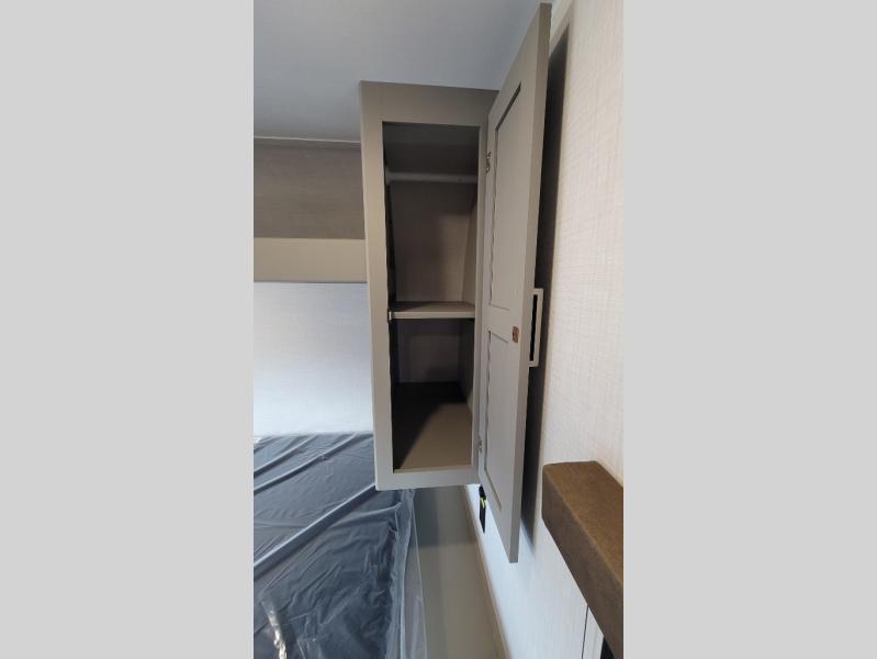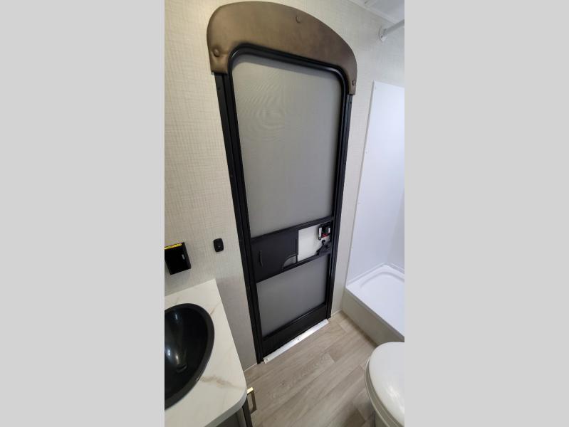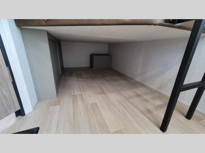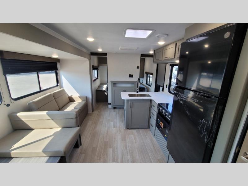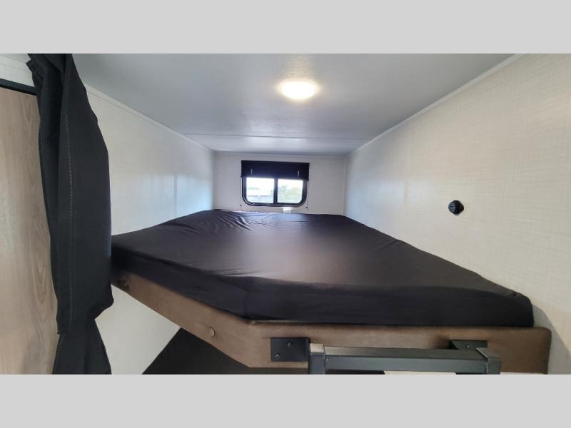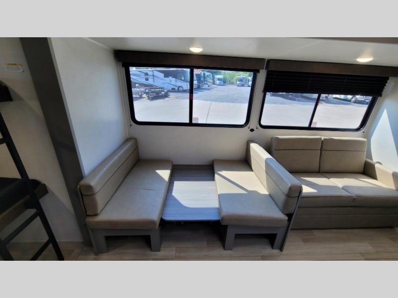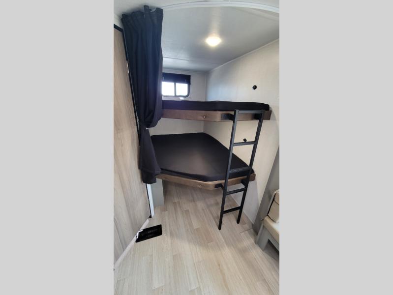 Pack your bags and head for the lake or woods in this spacious trailer! You can comfortably sleep nine to ten with the double-size bunks and the queen bed in the front private bedroom, plus the booth dinette and sofa in the main living area. There is even TV prep here if you want to add a television to the entertainment center for movie nights. The kitchen includes a 10 cu. ft. 12V refrigerator and an extra large pantry for food storage, plus a cooktop to prepare meals each day. The full bath included will let you clean up after a day of exploring outdoors, and you'll find the second entry door here for convenience!