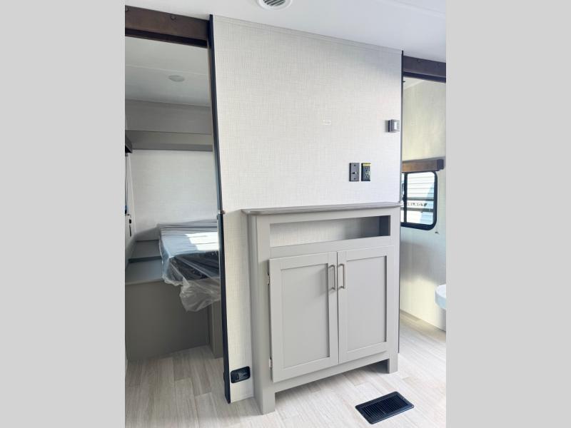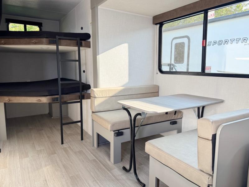 Pack your bags and head for the lake or woods in this spacious trailer! You can comfortably sleep nine to ten with the double-size bunks and the queen bed in the front private bedroom, plus the booth dinette and sofa in the main living area. There is even TV prep here if you want to add a television to the entertainment center for movie nights. The kitchen includes a 10 cu. ft. 12V refrigerator and an extra large pantry for food storage, plus a cooktop to prepare meals each day. The full bath included will let you clean up after a day of exploring outdoors, and you'll find the second entry door here for convenience!