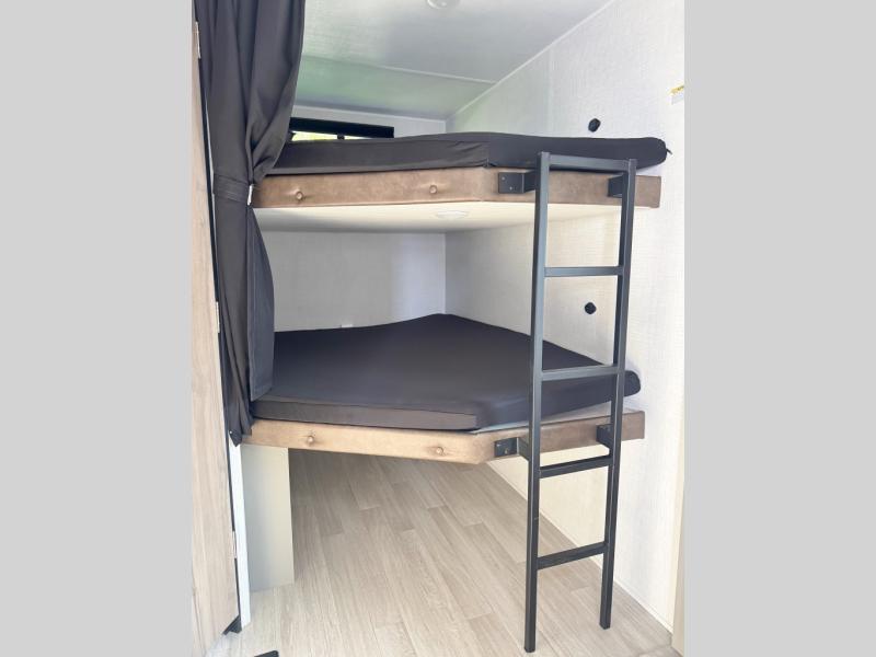 Pack your bags and head for the lake or woods in this spacious trailer! You can comfortably sleep nine to ten with the double-size bunks and the queen bed in the front private bedroom, plus the booth dinette and sofa in the main living area. There is even TV prep here if you want to add a television to the entertainment center for movie nights. The kitchen includes a 10 cu. ft. 12V refrigerator and an extra large pantry for food storage, plus a cooktop to prepare meals each day. The full bath included will let you clean up after a day of exploring outdoors, and you'll find the second entry door here for convenience!