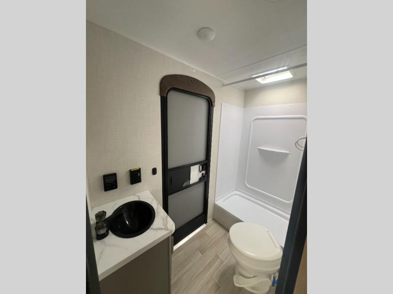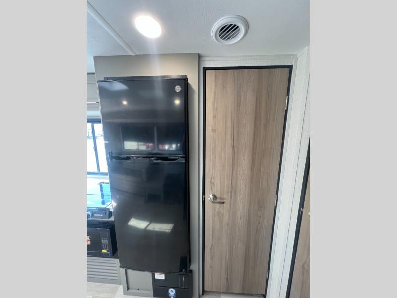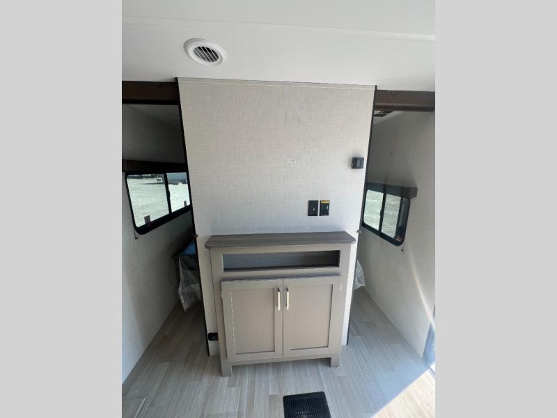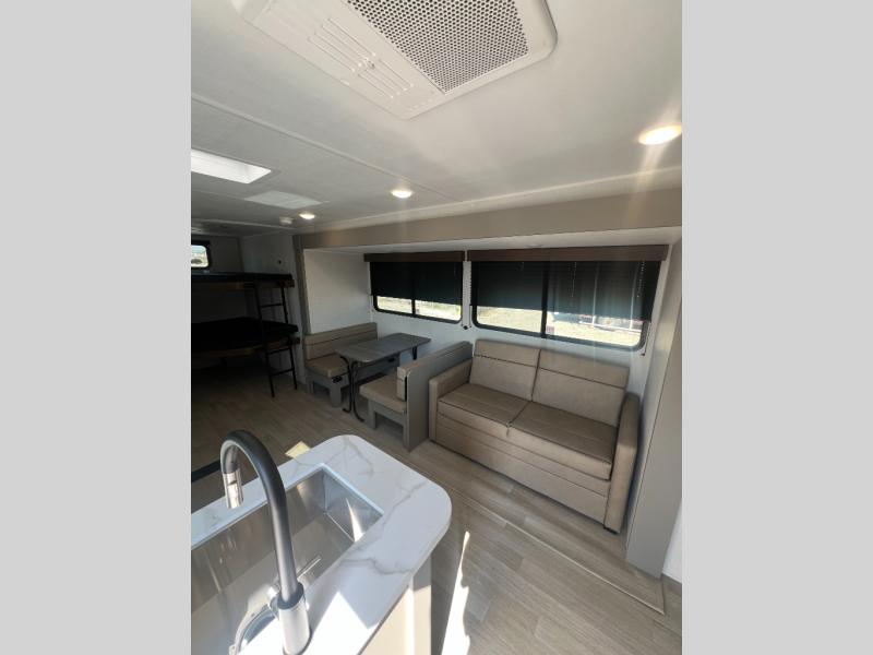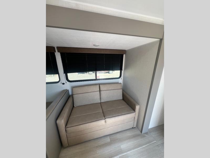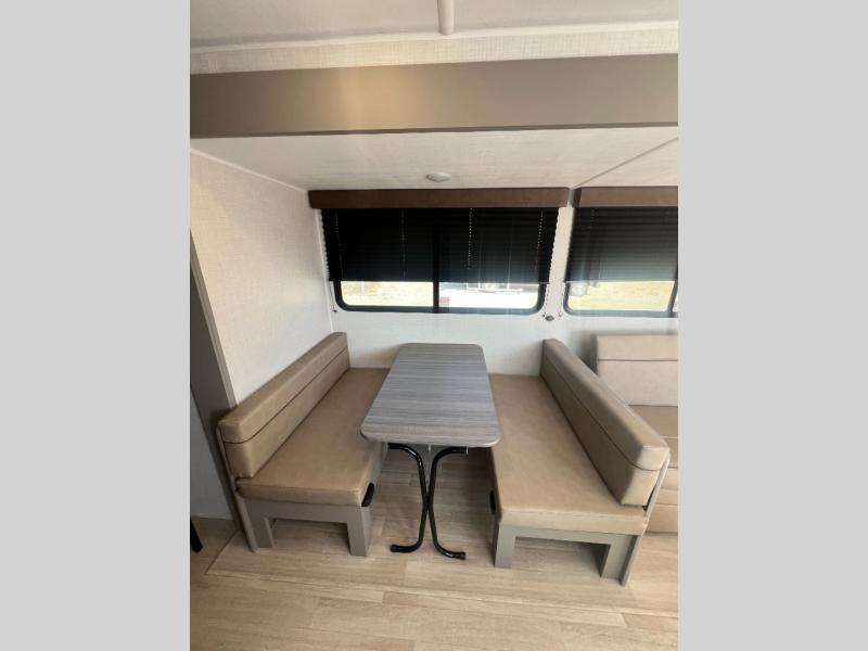 Pack your bags and head for the lake or woods in this spacious trailer! You can comfortably sleep nine to ten with the double-size bunks and the queen bed in the front private bedroom, plus the booth dinette and sofa in the main living area. There is even TV prep here if you want to add a television to the entertainment center for movie nights. The kitchen includes a 10 cu. ft. 12V refrigerator and an extra large pantry for food storage, plus a cooktop to prepare meals each day. The full bath included will let you clean up after a day of exploring outdoors, and you'll find the second entry door here for convenience!