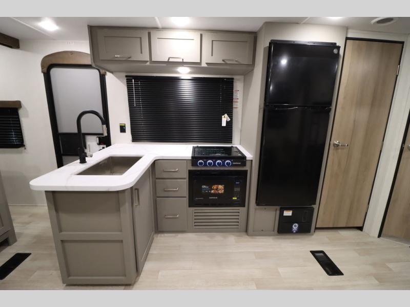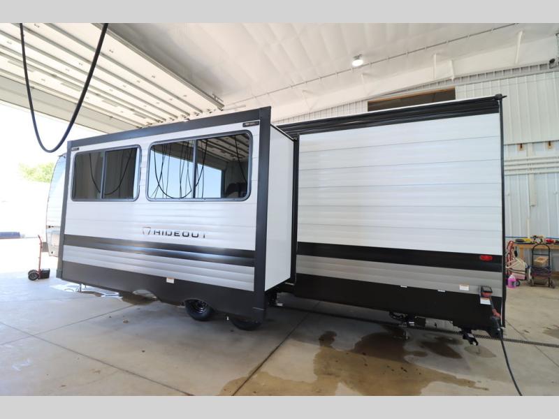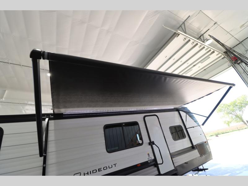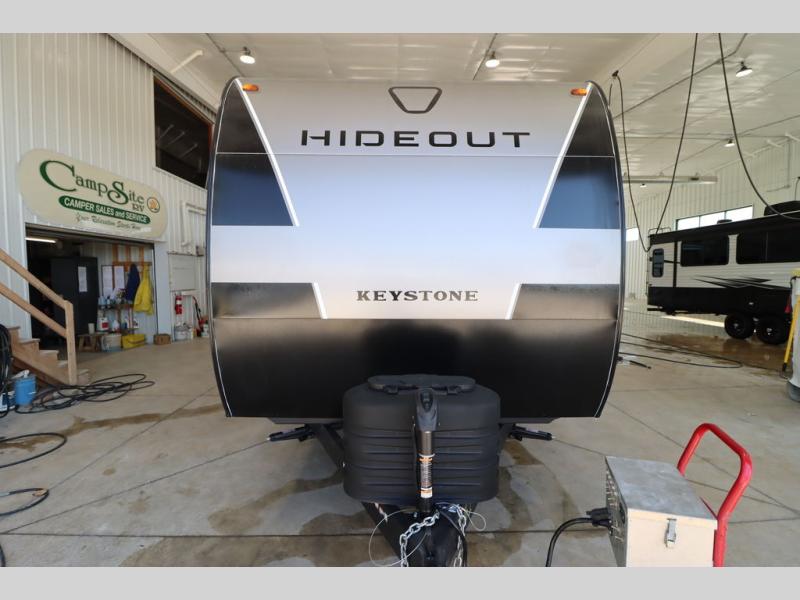 With any Hideout Sport travel trailer by Keystone you will enjoy simplified camping solutions that won't break the bank! Each model is constructed with a durable AlphaPly TPO roof membrane tinted safety glass windows, and an I-beam frame. There are power tongue jacks and heavy duty stabilizer jacks that will make it easier than ever to hitch up and go. An XL entry assist handle will also provide convenience, along with a power awning that will provide much wanted shade during the day. You will feel right at home with stylish decor, blackout night shades, and cozy bed with storage underneath!