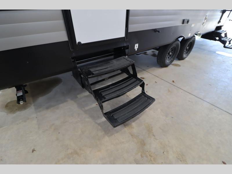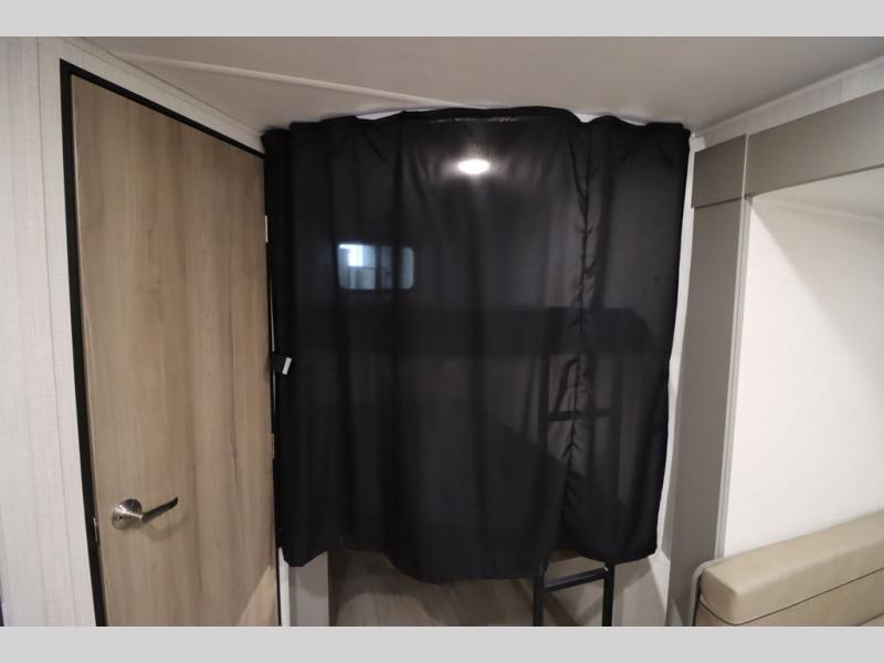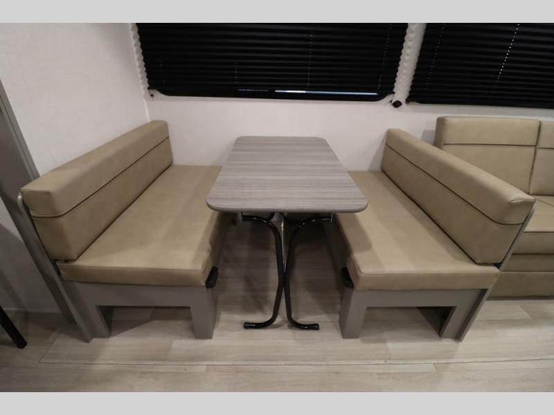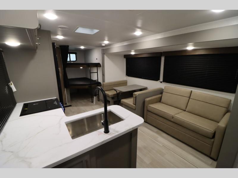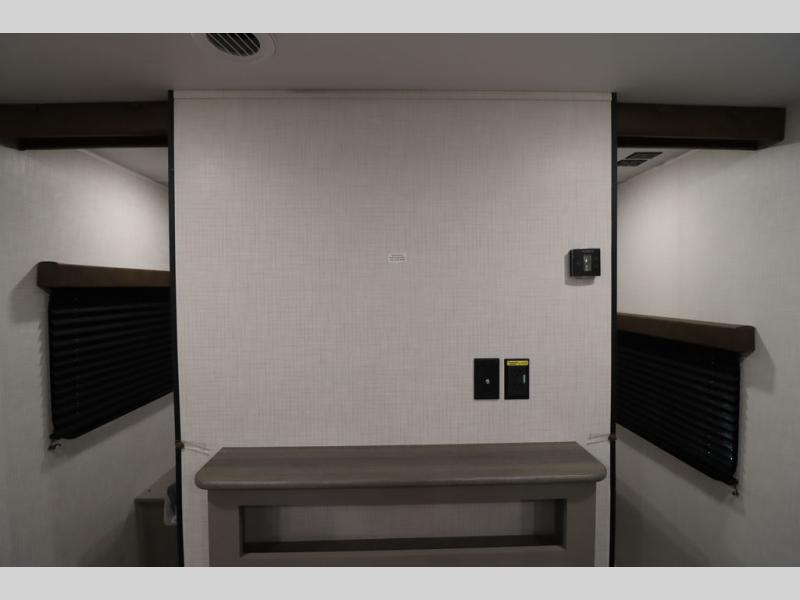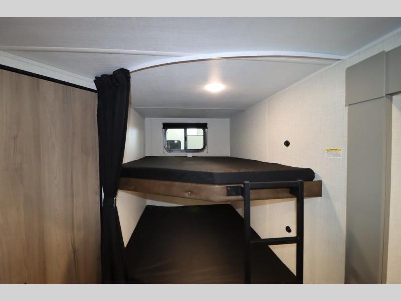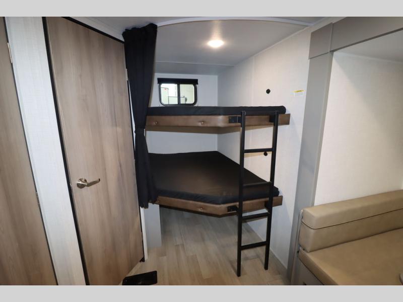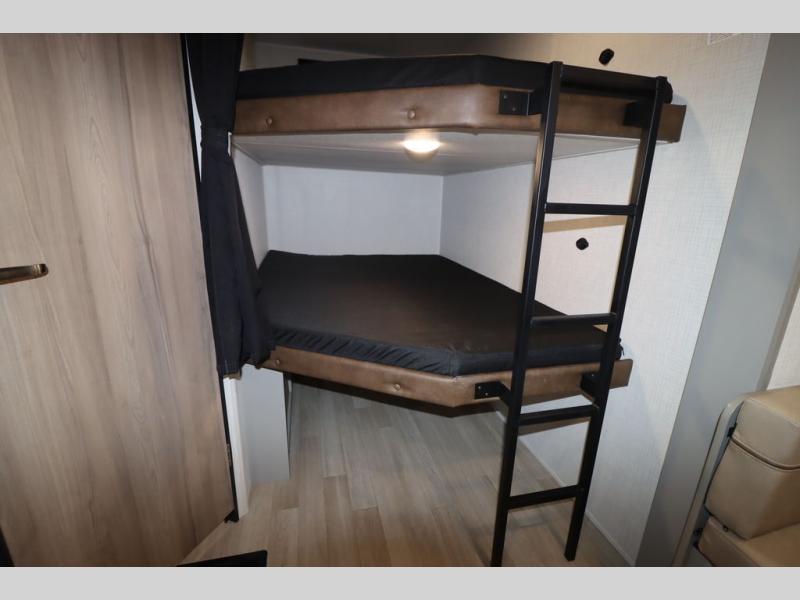 Pack your bags and head for the lake or woods in this spacious trailer! You can comfortably sleep nine to ten with the double-size bunks and the queen bed in the front private bedroom, plus the booth dinette and sofa in the main living area. There is even TV prep here if you want to add a television to the entertainment center for movie nights. The kitchen includes a 10 cu. ft. 12V refrigerator and an extra large pantry for food storage, plus a cooktop to prepare meals each day. The full bath included will let you clean up after a day of exploring outdoors, and you'll find the second entry door here for convenience!