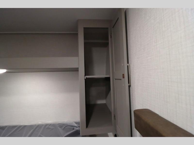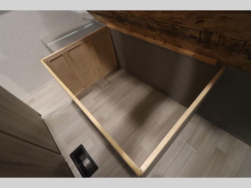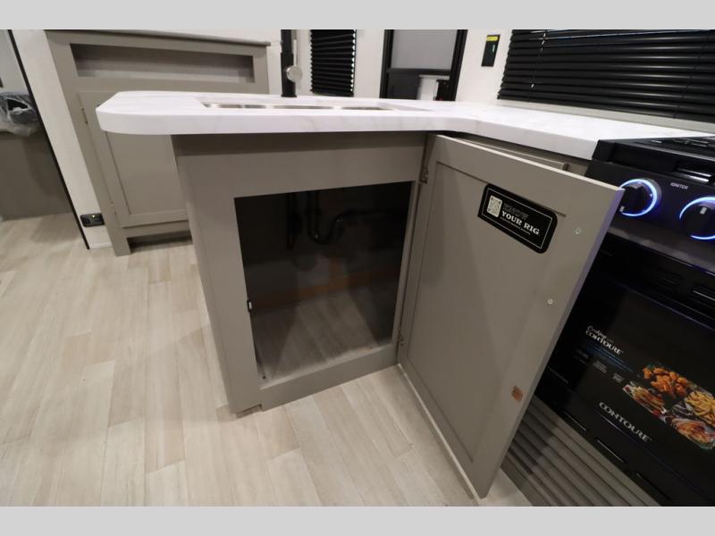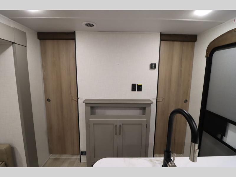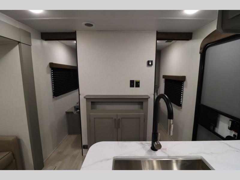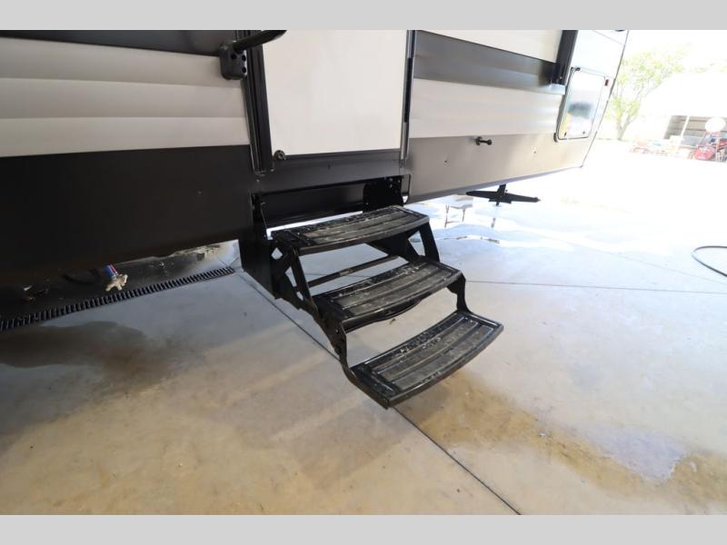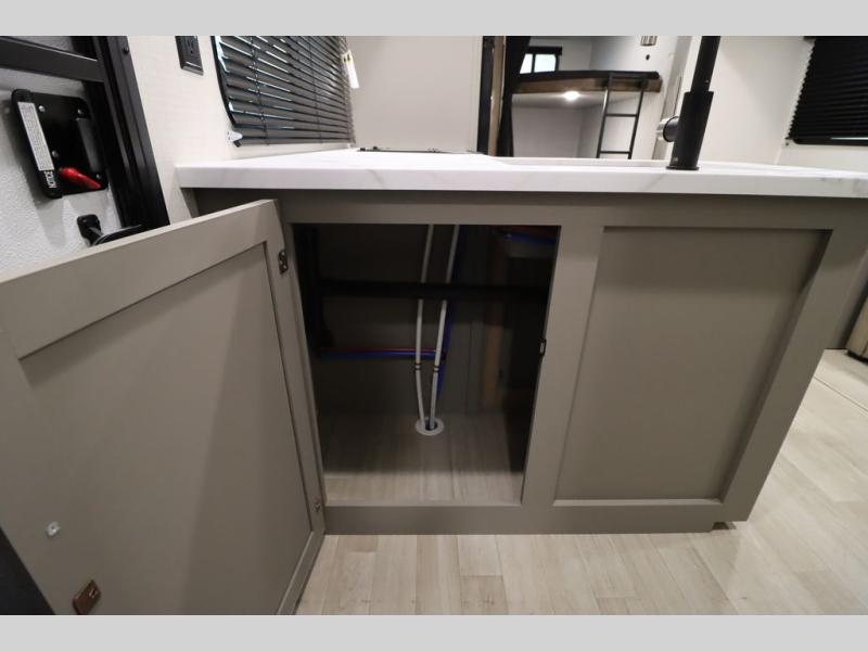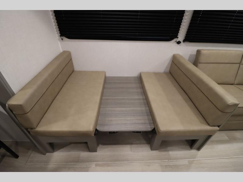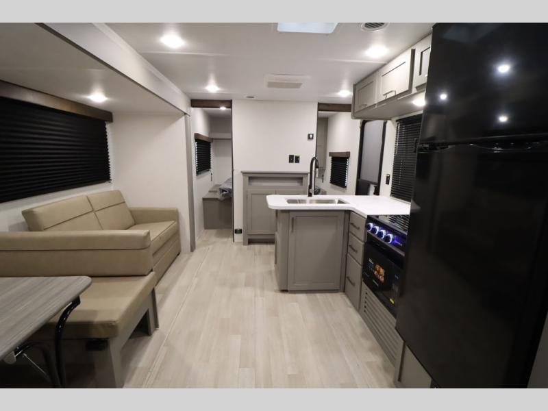 Pack your bags and head for the lake or woods in this spacious trailer! You can comfortably sleep nine to ten with the double-size bunks and the queen bed in the front private bedroom, plus the booth dinette and sofa in the main living area. There is even TV prep here if you want to add a television to the entertainment center for movie nights. The kitchen includes a 10 cu. ft. 12V refrigerator and an extra large pantry for food storage, plus a cooktop to prepare meals each day. The full bath included will let you clean up after a day of exploring outdoors, and you'll find the second entry door here for convenience!