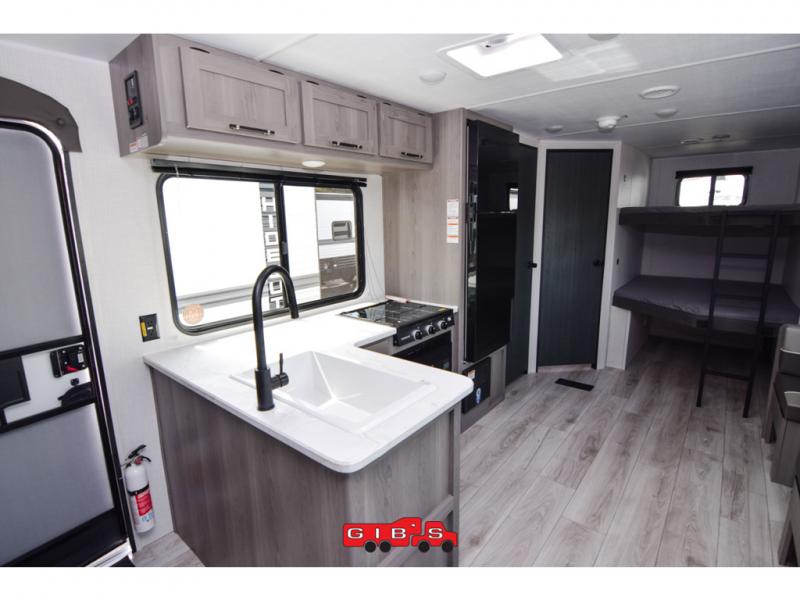 Pack your bags and head for the lake or woods in this spacious trailer! The dual entry doors make it easy to enter or exit this unit. You can comfortably sleep nine to ten with the bunks beds and the queen bed in the front private bedroom, plus the booth dinette and sofa in the main living area. There is even TV prep here if you want to add a television to the entertainment center for movie nights. The kitchen includes a 10 cu. ft. 12V refrigerator and an extra large pantry for food storage, plus a cooktop to prepare meals each day. And the full bath included will let you clean up after a day of exploring outdoors!